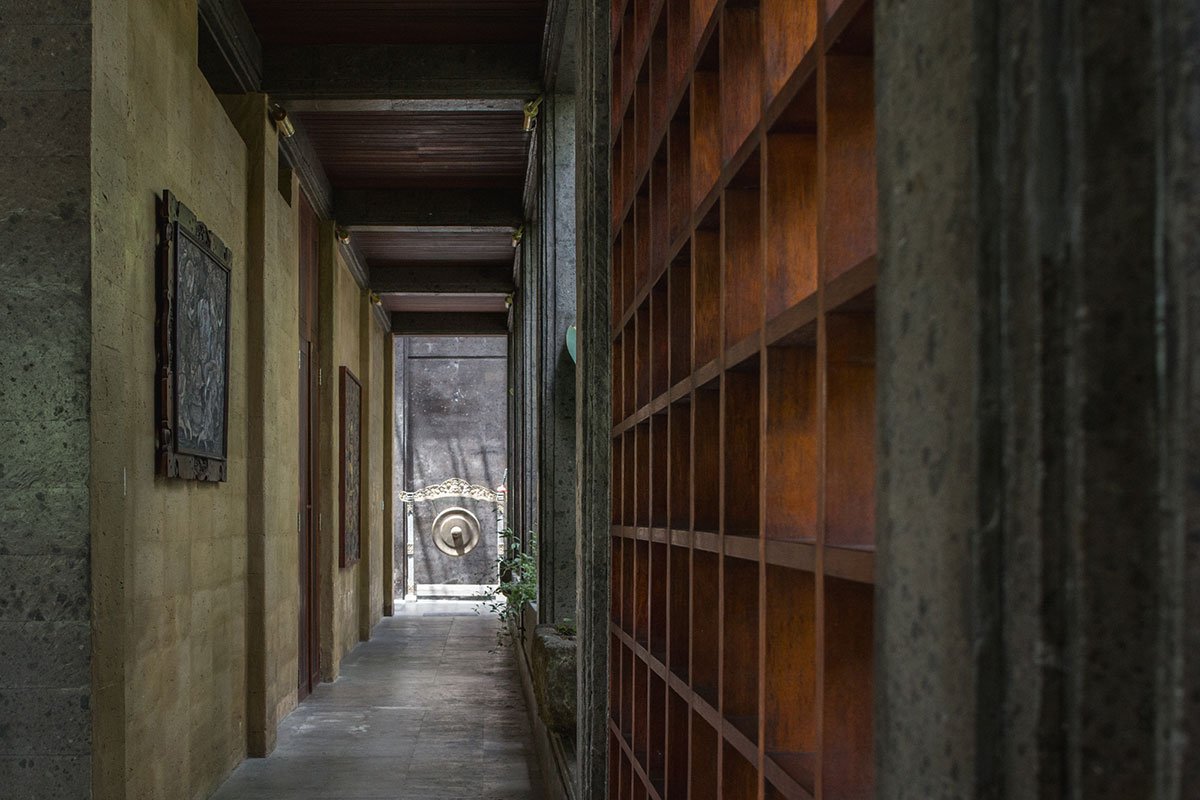 The silhouette is a sequence of five roofs of different lengths, juxtaposed with wall surfaces tiled with locally sourced Kerobokan stone. Linear skylights and gaps between the roofs generate a ‘barcode’ like light composition throughout the interior and exterior spaces of the house, changing as the sun makes its way from east to west.