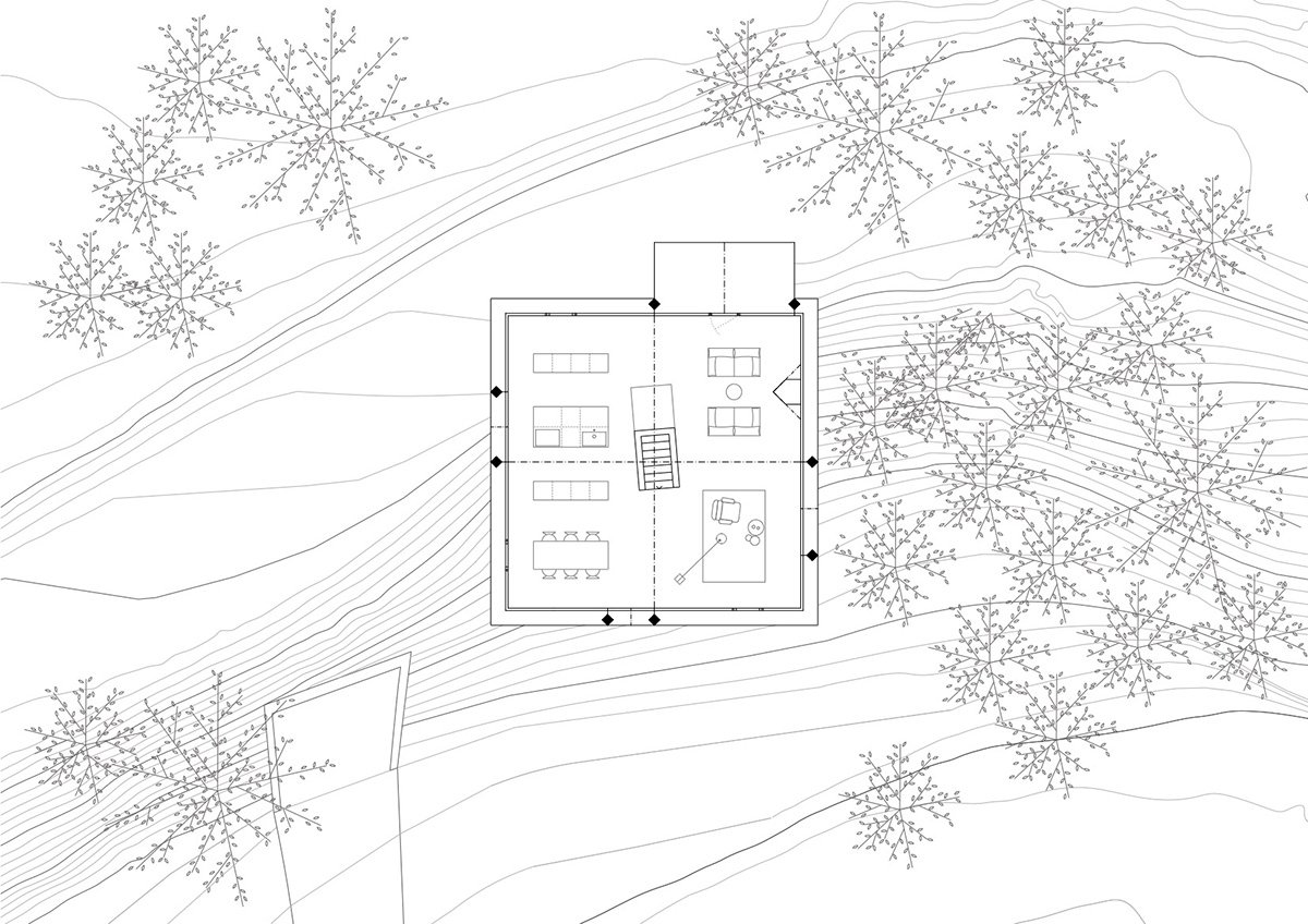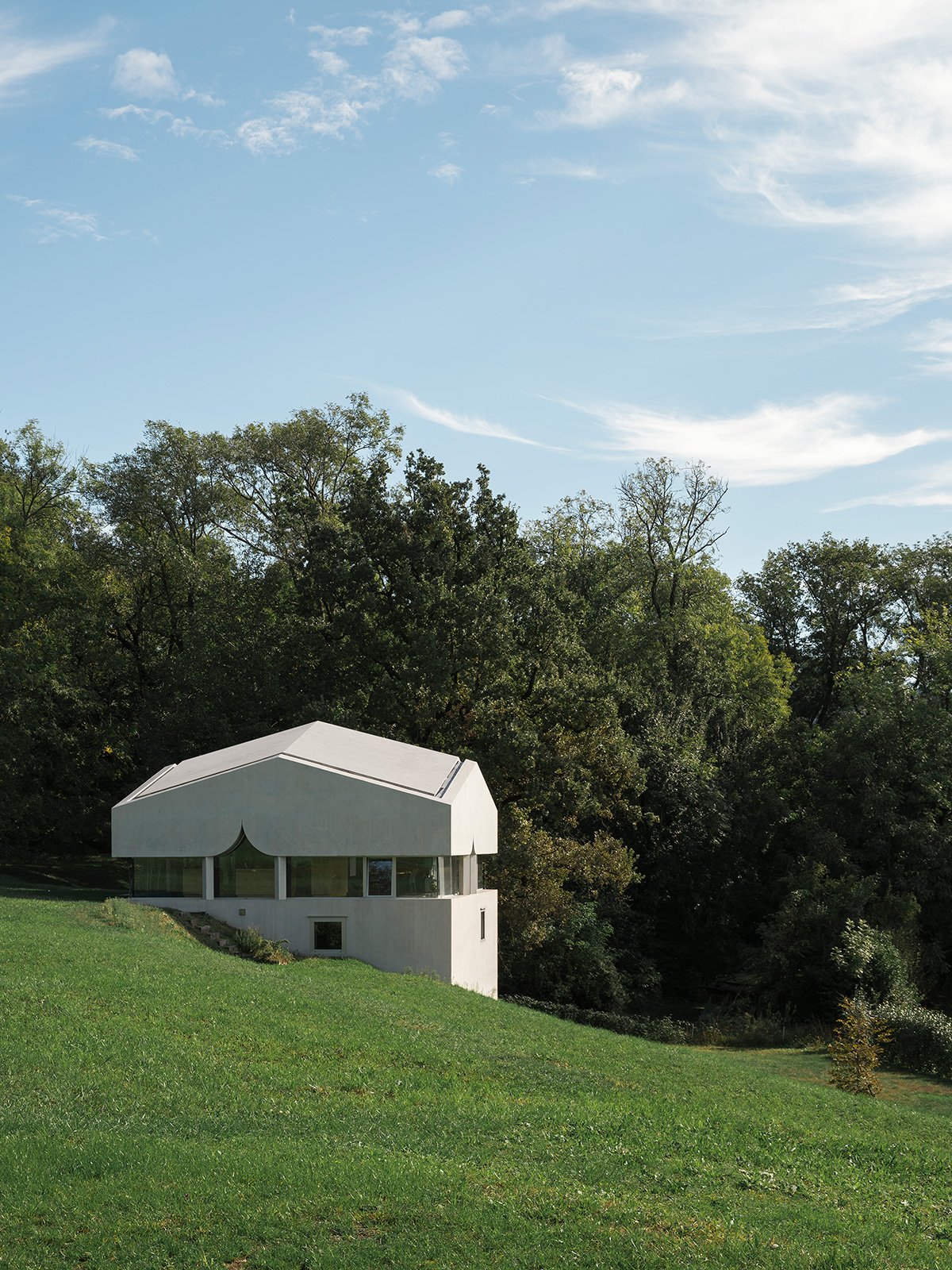The project develops vertically, following the logic of the slope, like an ascending path of living. At the base, the concrete plinth is immersed in the earth, housing the sleeping area and garage. The architectural body then opens upwards, culminating in a bright, open space that accommodates the living area: a domestic observatory facing the landscape.