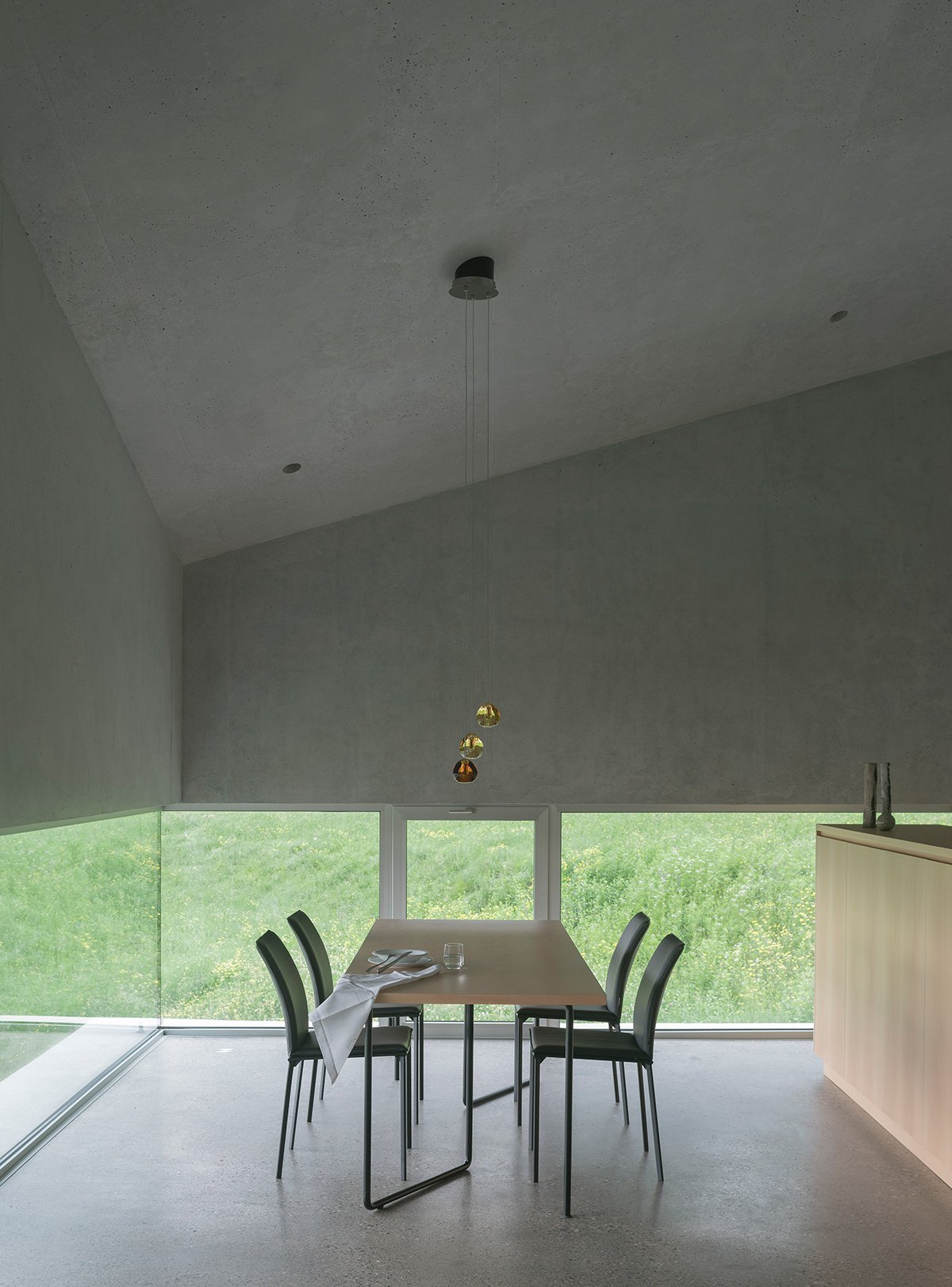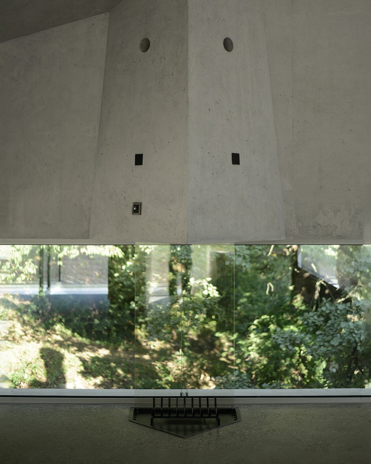 The choice to position the living area on the upper level offers an uninterrupted view of the surrounding nature, relating to the forest to the east and creating a direct connection with the green area to the north. A continuous 1.30-metre-high perimeter window forms a transparent ribbon that embraces the view, allowing light and silence to filter through, while ensuring privacy for daily activities.