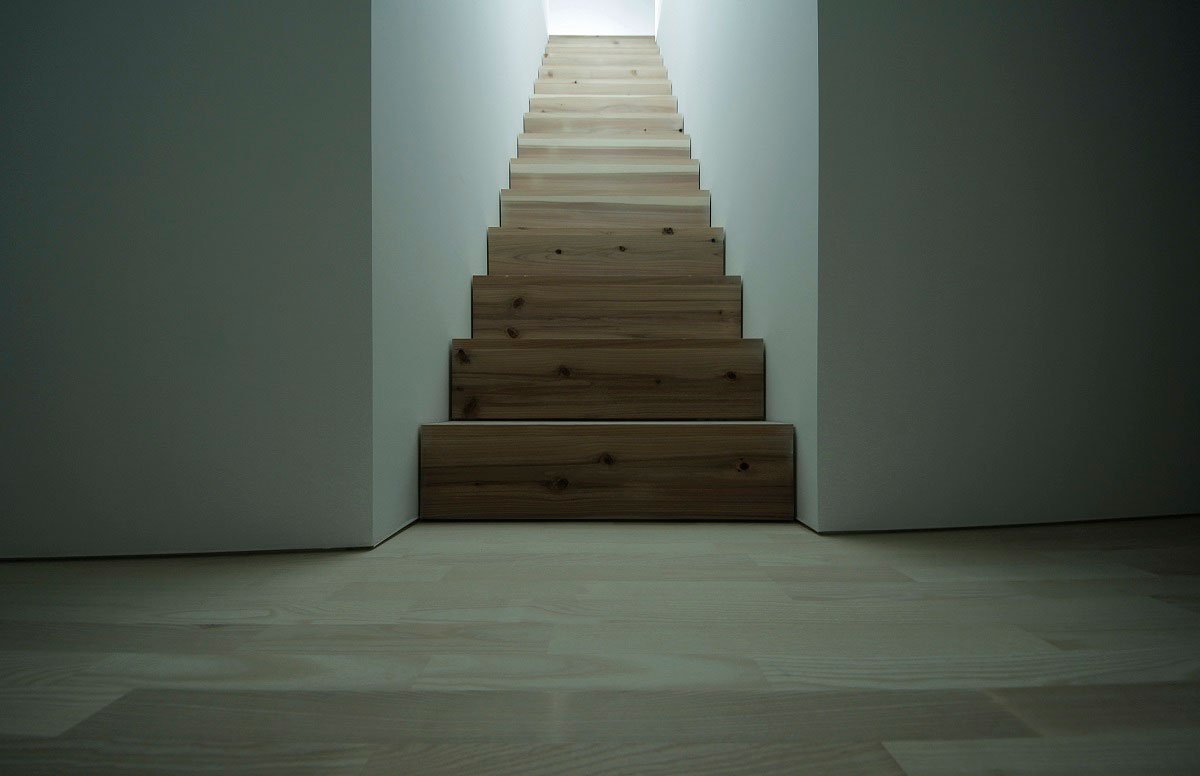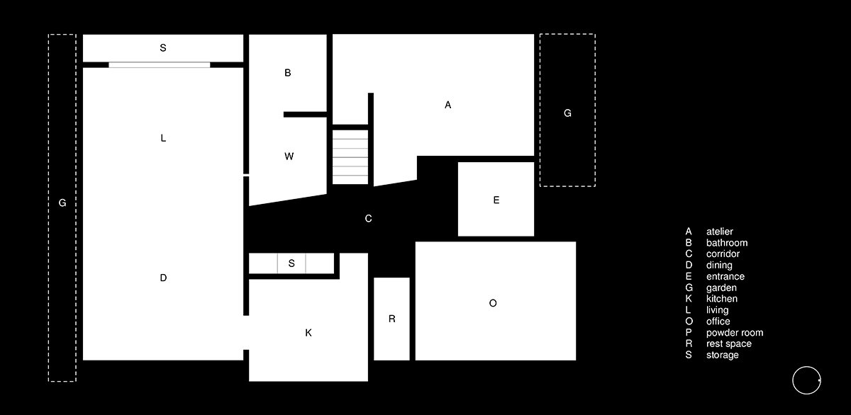 A opening door has detail similar to the storage core that is installed in the middle of corridor, which leads to the service circulation of the kitchen. Staircase is extended so as to be perpendicular to the provided amphidromous flow space.