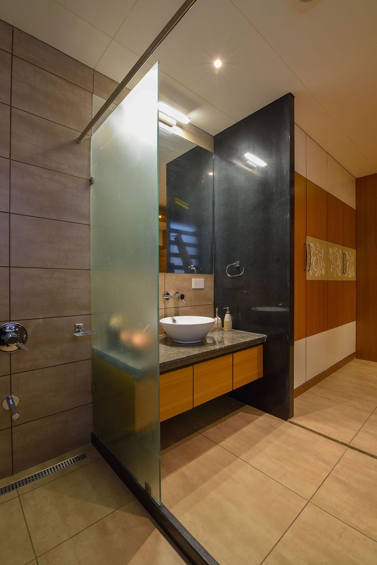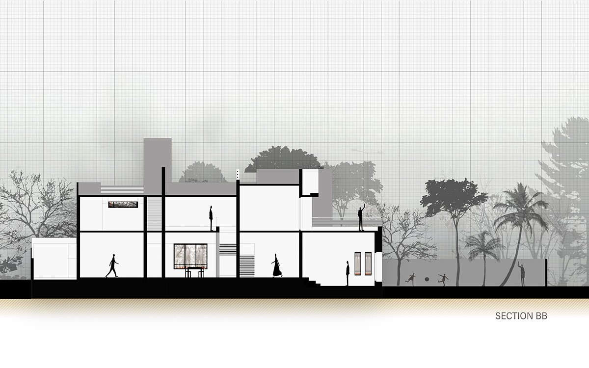 [Text as submitted by architect] Located in a quiet suburb of Ahmedabad in a gated community, this is home to a small family of three. Given us a brief that the footprint of the house should be minimal and the use of local craftsmanship and locally sourced materials that celebrate materiality and the relationship between the manmade and the natural – reducing carbon footprints. The client was desirous of a space that would reconcile privacy with transparency and possess a strong connection to the outside. The key to this project was to build the home around nature instead of weaving nature into the home. There is a modesty of articulation, which is rich with consideration for the environment, as well as the consciousness that a home should offer you an experience that is fundamentally different from a routine one. Natural and raw materials were the primary medium through which this guiding principle was articulated.