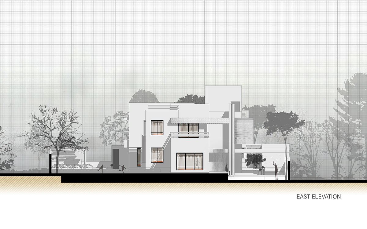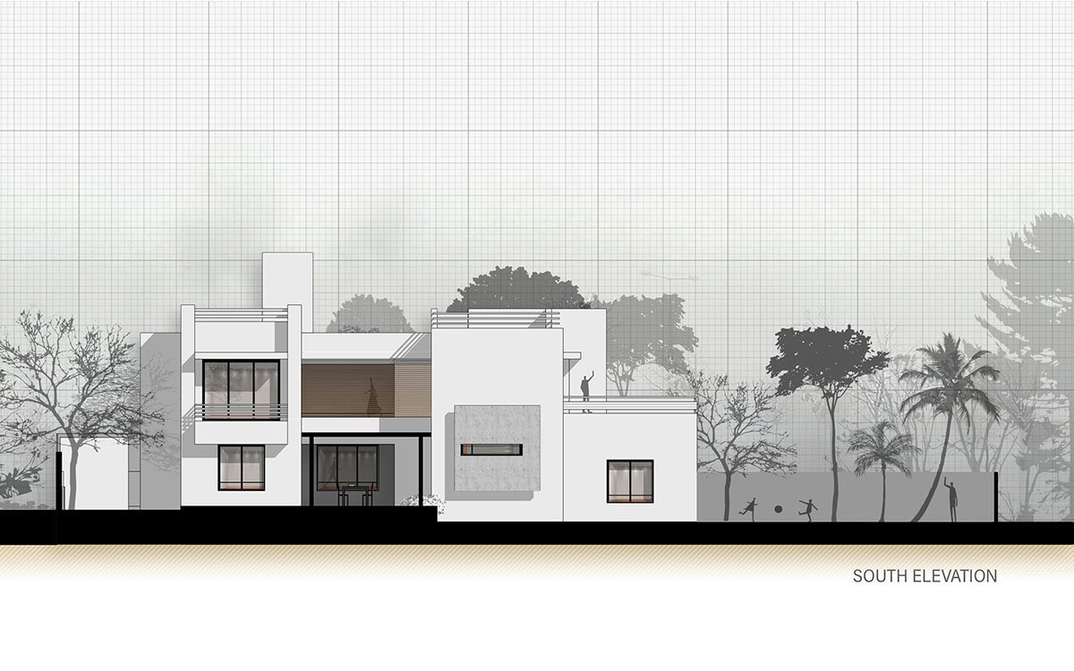 The Elevation of the two-story dwelling, masses out through additive and subtractive volumes, featuring the play of layered offset frames which are perceived differently, as the client had told they wanted to enjoy more outdoor spaces we had purposefully place a terrace on top of the drawing to have control over the massing and client can enjoy the large a vast landscape coming outside of their bedroom.