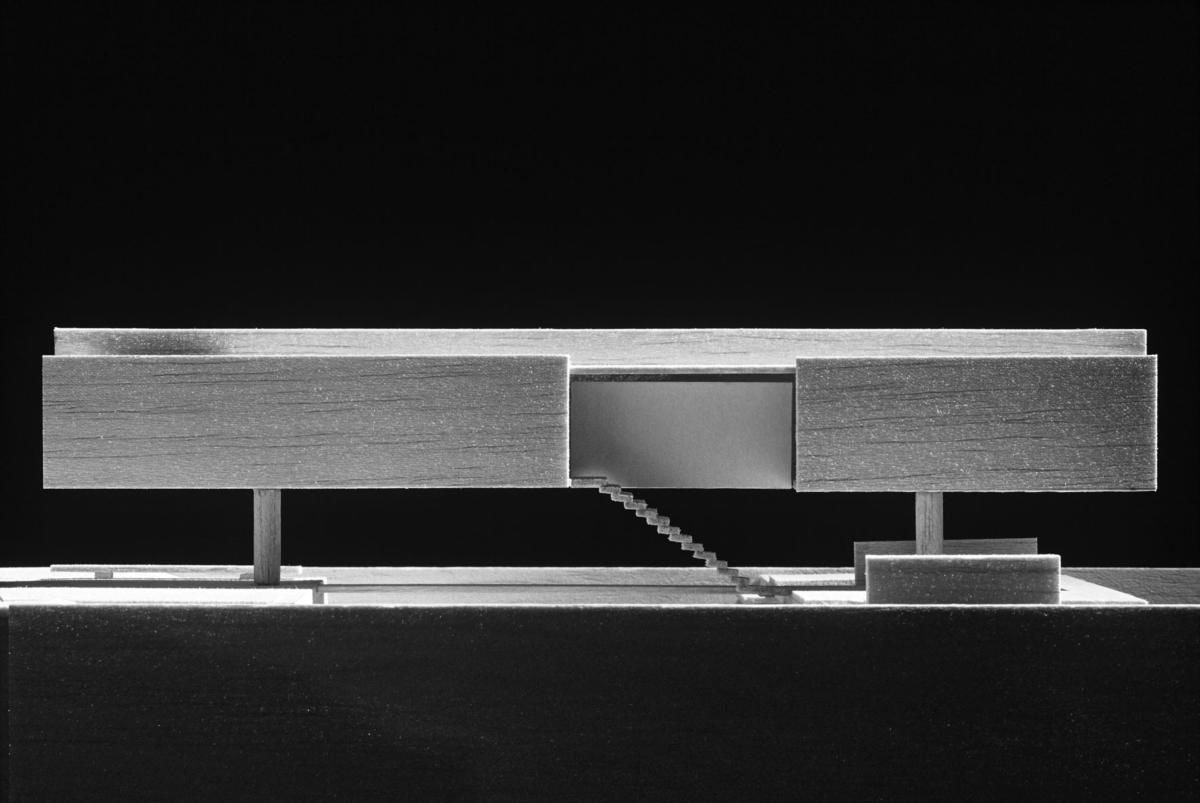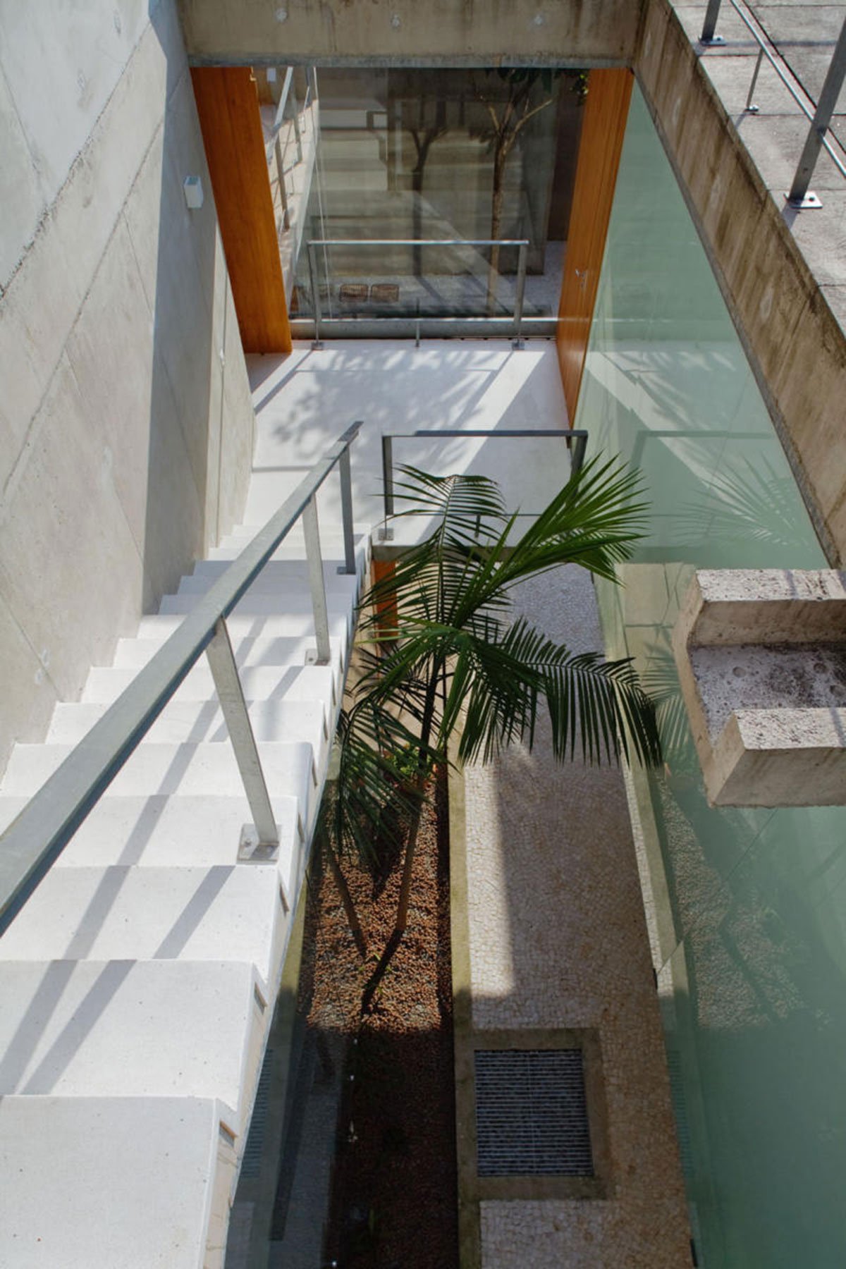 The street level was kept free of any enclosed space, it is a kind of “pilotis” with two different areas: the first one is on the ground, very close to the street, and the other one is aerial, as a roof terrace over the building. A bridge, made of steel, connects these two areas. The only entrance to the building is the bridge with its steel grid floor that leads over the open space: downstairs to the house or upstairs to the office.