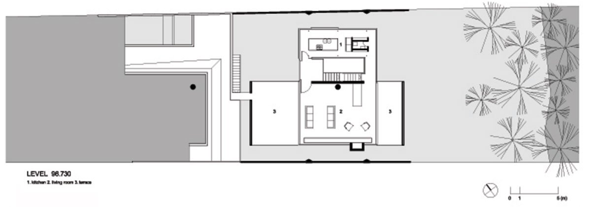The house is divided into two levels, both below the street level. Its spaces are integrated with the woods, valley, gardens, and pool located at the ground level. The house incorporates the outside nature indoors: a sliding glass door opens the living room into the terrace,creating one large space. The bedroom and the patios can also be integrated at the lower level.