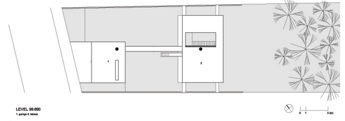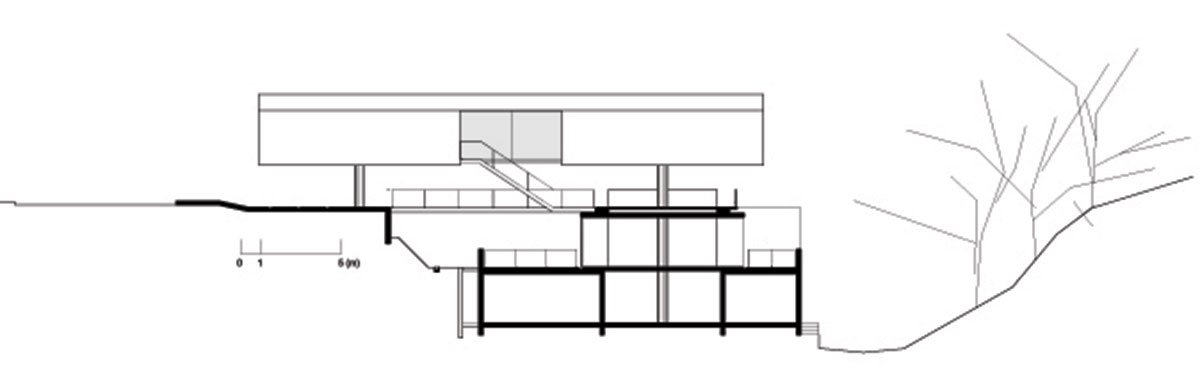 The most remarkable feature of the site where the house is located is its depression, in topographical terms. From the street, we cannot clearly see its ground level because the ground surface falls abruptly into a little valley and woods: a stage 6 m below.