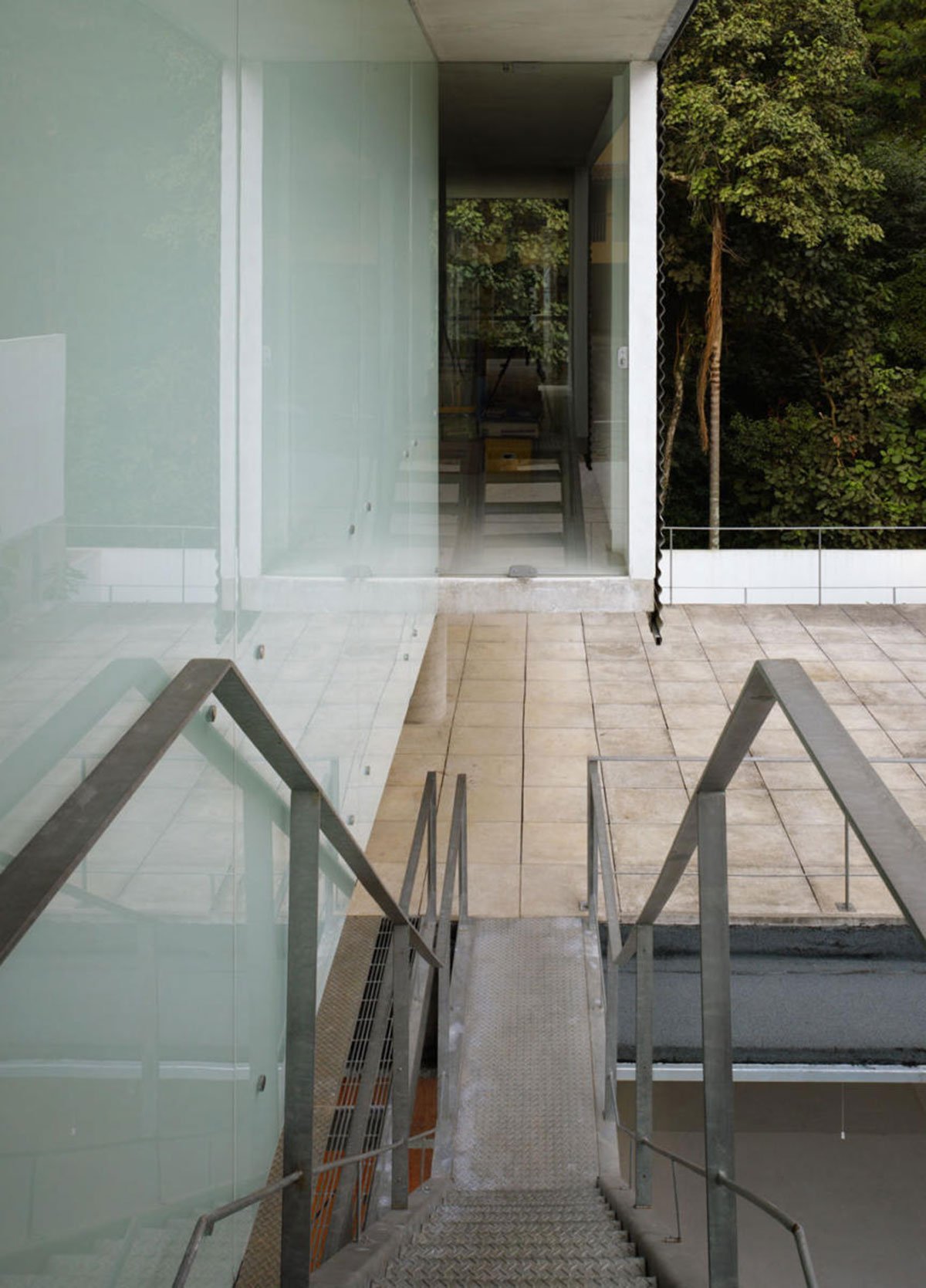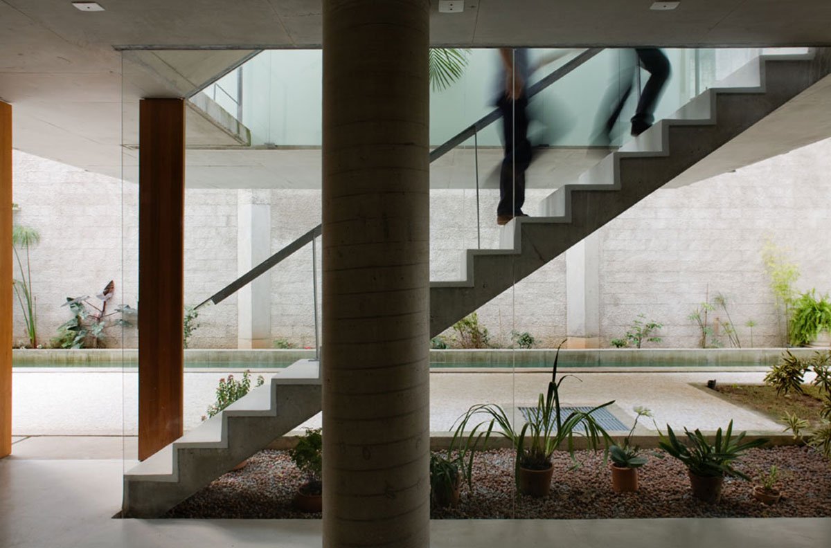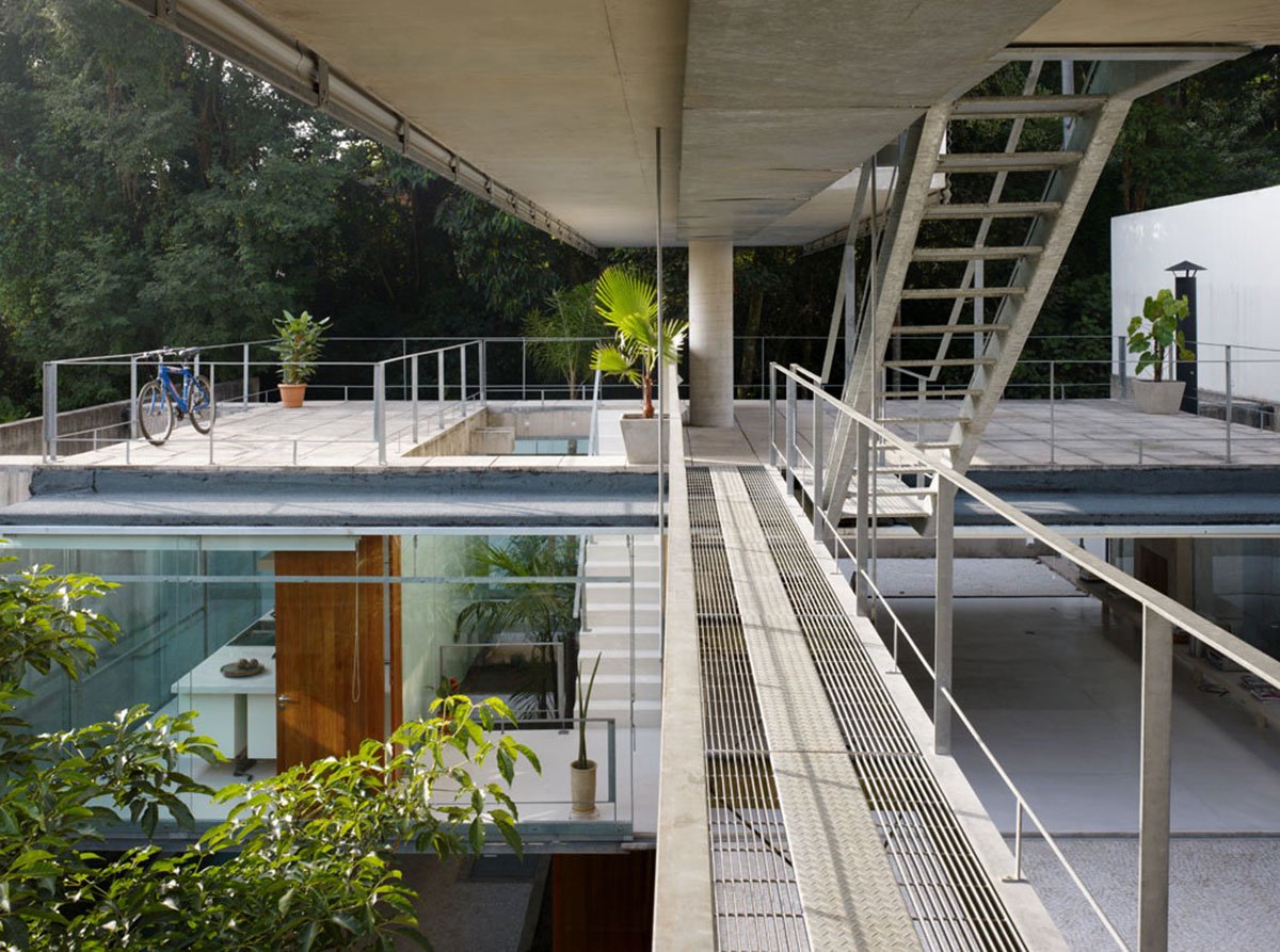 Excerpt: House in Carapicuíba, designed by the architectural firm spbr arquitetos, is a place to live & work. However, it is as separate as possible. The different levels offered by the site were utilized to arrange the two main programs. The street level was kept free of any enclosed space, it is a kind of “pilotis” with two different areas: the first one is on the ground, very close to the street, and the other one is aerial, as a roof terrace over the building. The House and the office is connected by the bridge with its steel grid floor that leads over the open space: downstairs to the house or upstairs to the office.