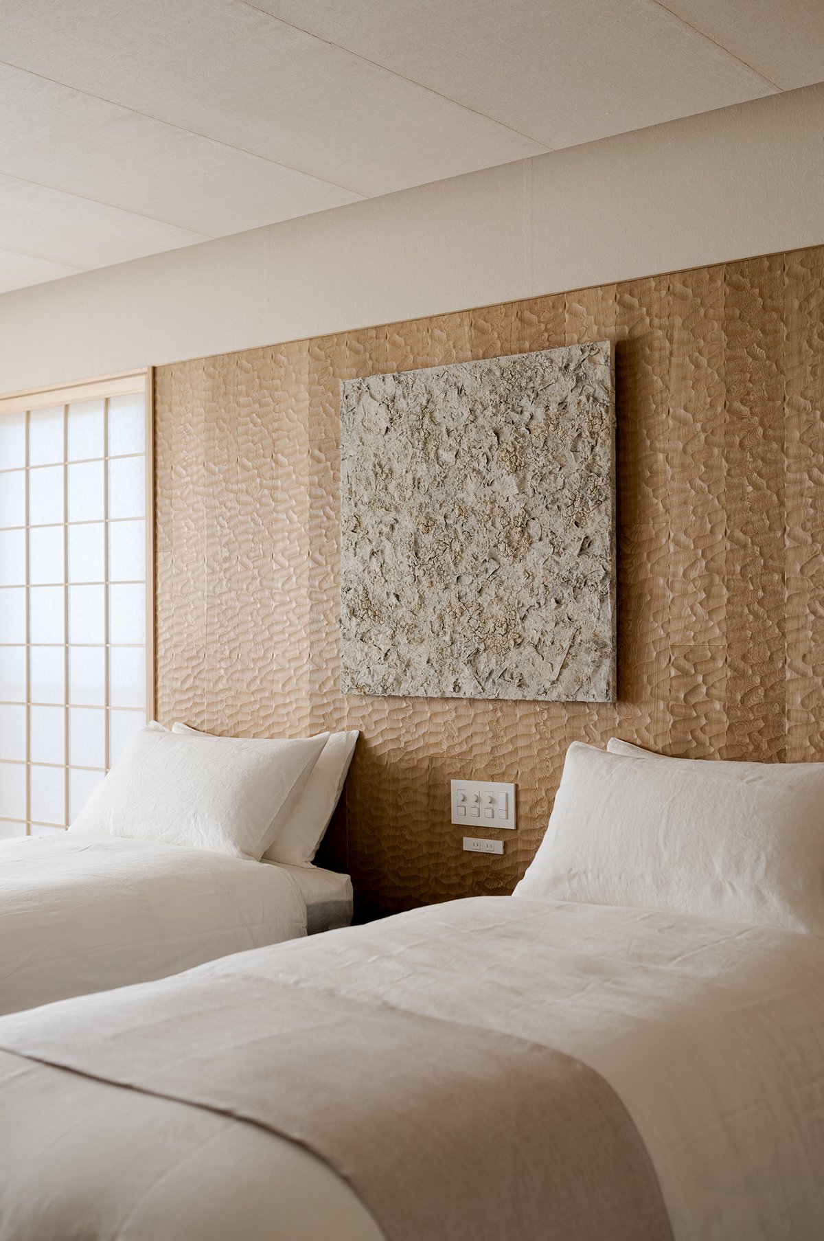 Each room’s walls have been adorned with artwork based on the theme of “accumulated layers,” created by the Kuroya washi paper artisan, Mr. Wataru Hatano. These artworks, when illuminated by natural and artificial light, provide various expressions to the space.