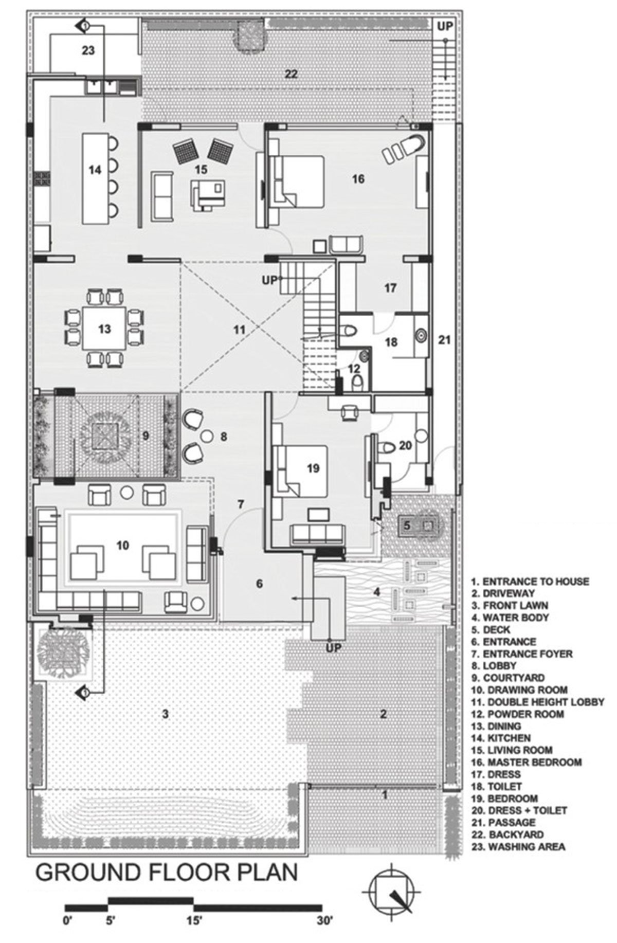 The overall concept was devised as a free plan with overlapping spaces to allow flexibility. However, the movement was choreographed so as to unfold the layers as one moves along the vertical axis of the house. The overall space is organized around a central courtyard that not only allows for light & ventilation but also serves as a means of introducing space in the interior that is excluded from the covered area regulated by building bylaws. The aim of the design i.e. to respond to universality has been adhered to by keeping in mind the principles of Vaastushastra (an ancient science that a number of users want to follow).