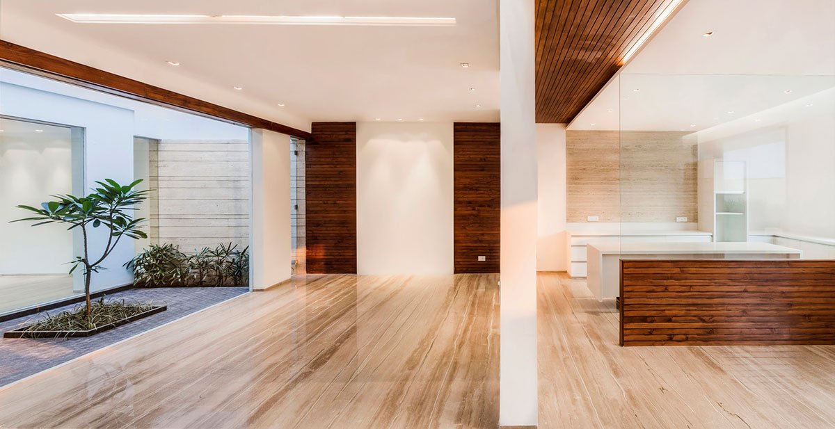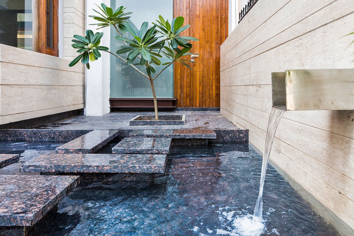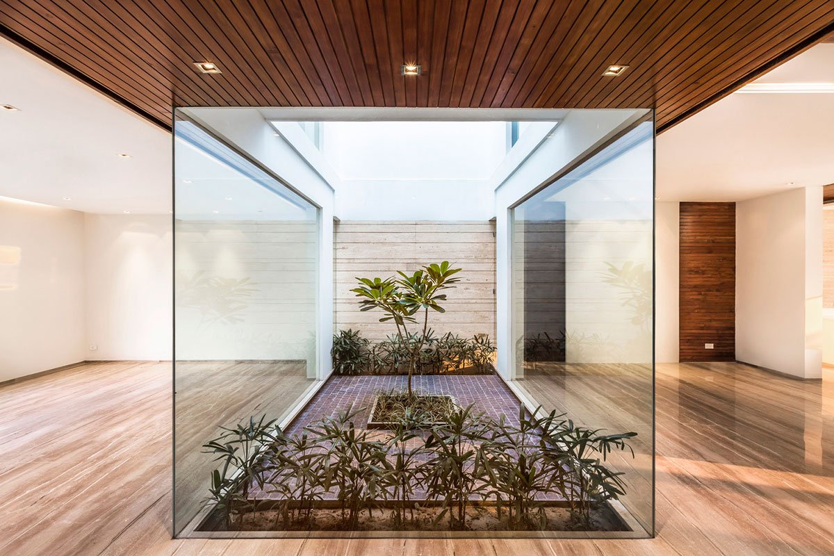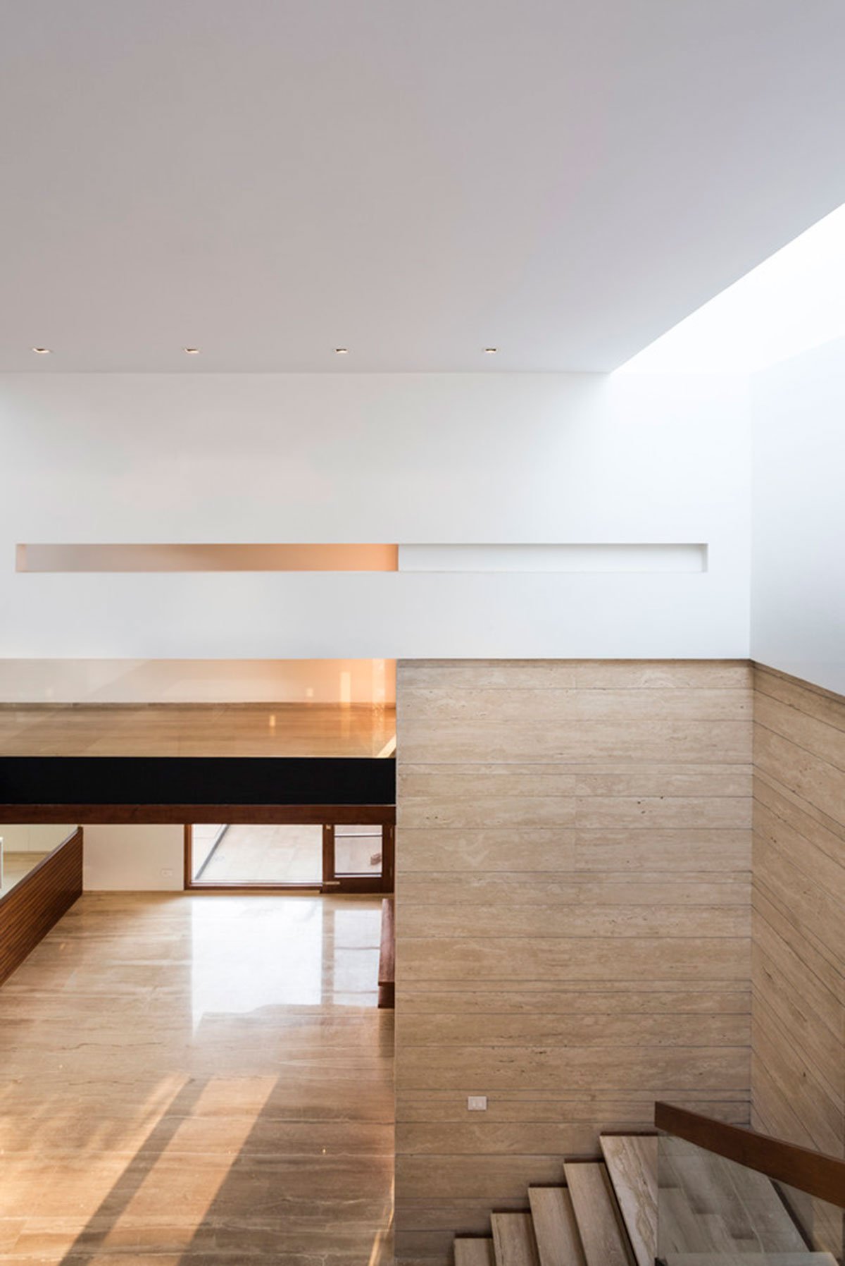 The material palette of the house is very restrained & neutral in the interiors. However, strong & rough textures have been used in most of the landscaped areas including the central courtyard.