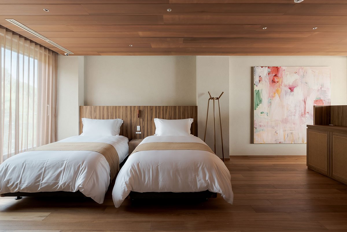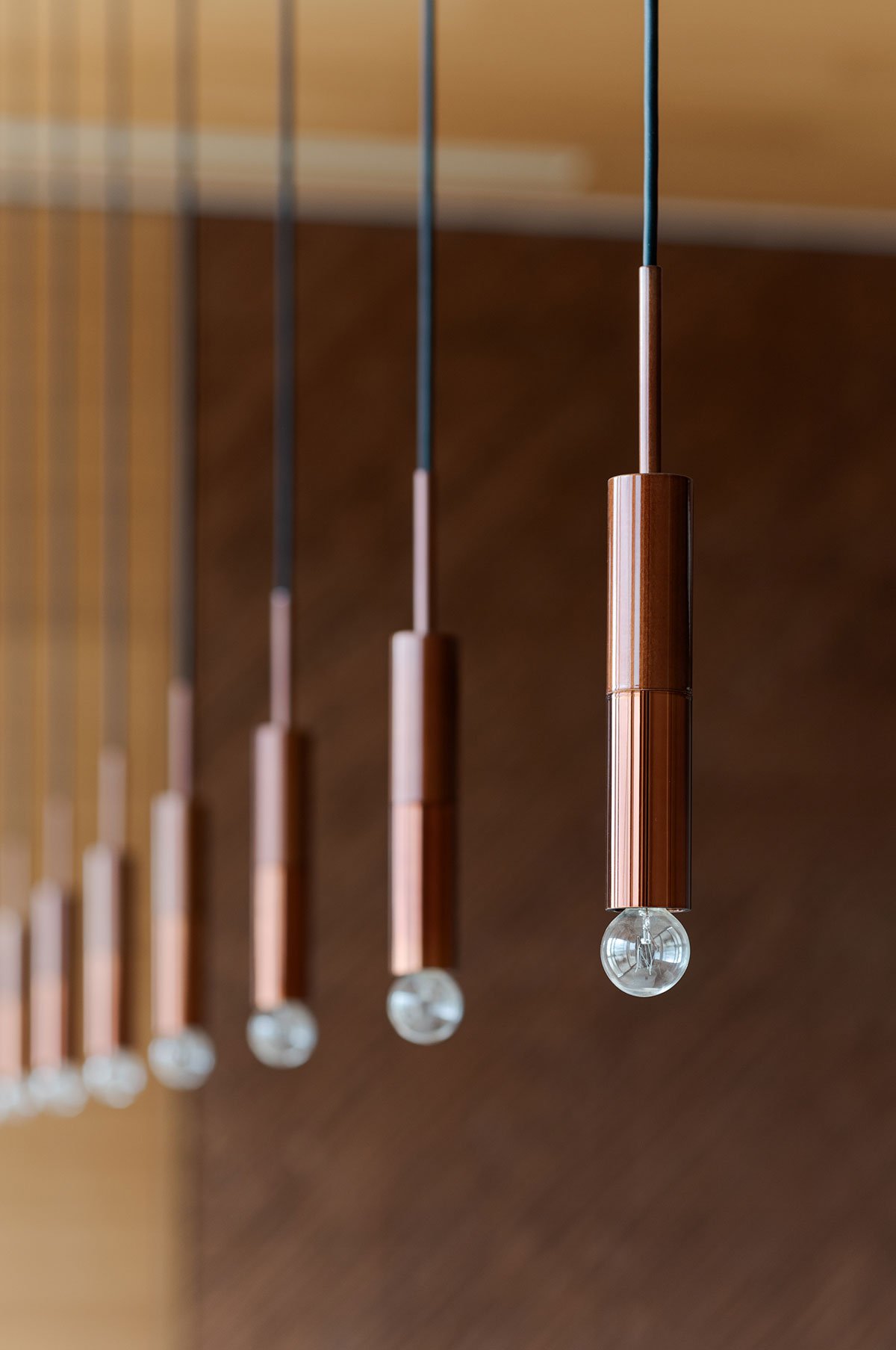 The pendant lights in the dining rooms and bracket lights in the bedroom are custom-made originals. The same materials were used to create a resemblance to a sandy beach covered by seawater, but different finishes were employed to add contrast.