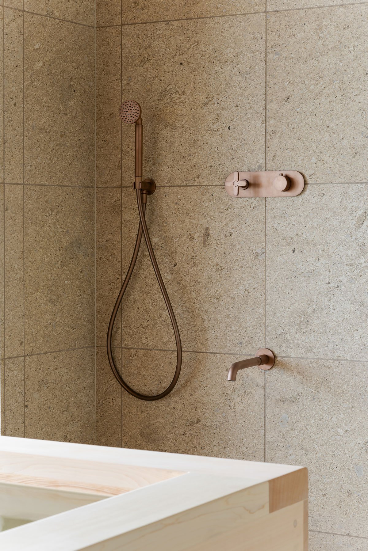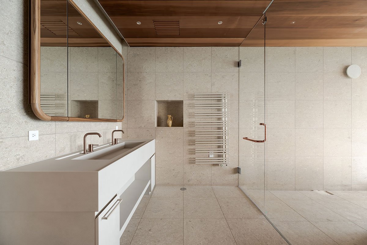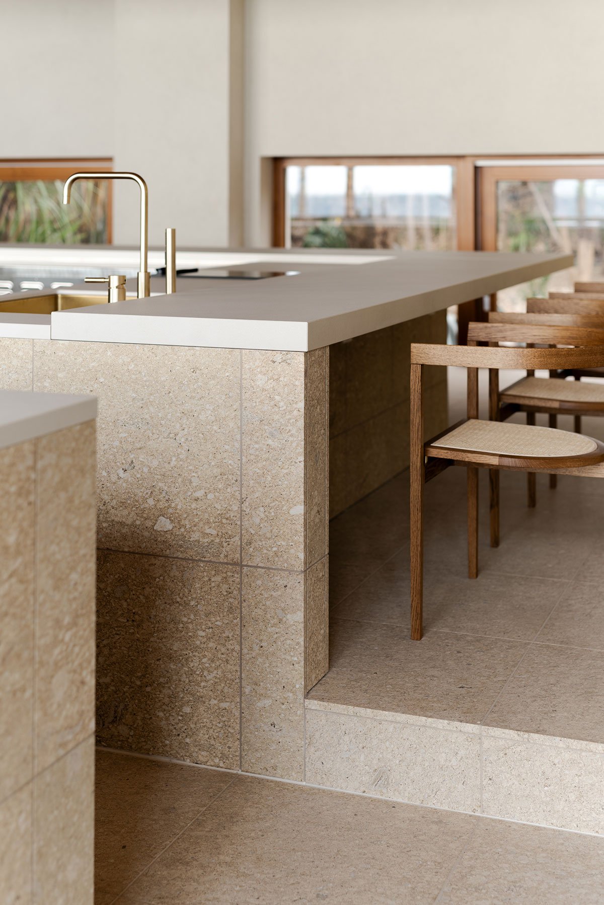 A large part of the building is made of granite, selected for its visual similarity to a sandy beach and cut from a stone slab to the size of 500×500 mm blocks to fit the frame’s pillar pitch. The walls and ceilings are finished with original plasterwork containing sand aggregates to also fit to the beach motif, and a gradient texture is applied. By using the same materials for outdoors and indoors, the design avoids a separation of these two spaces.