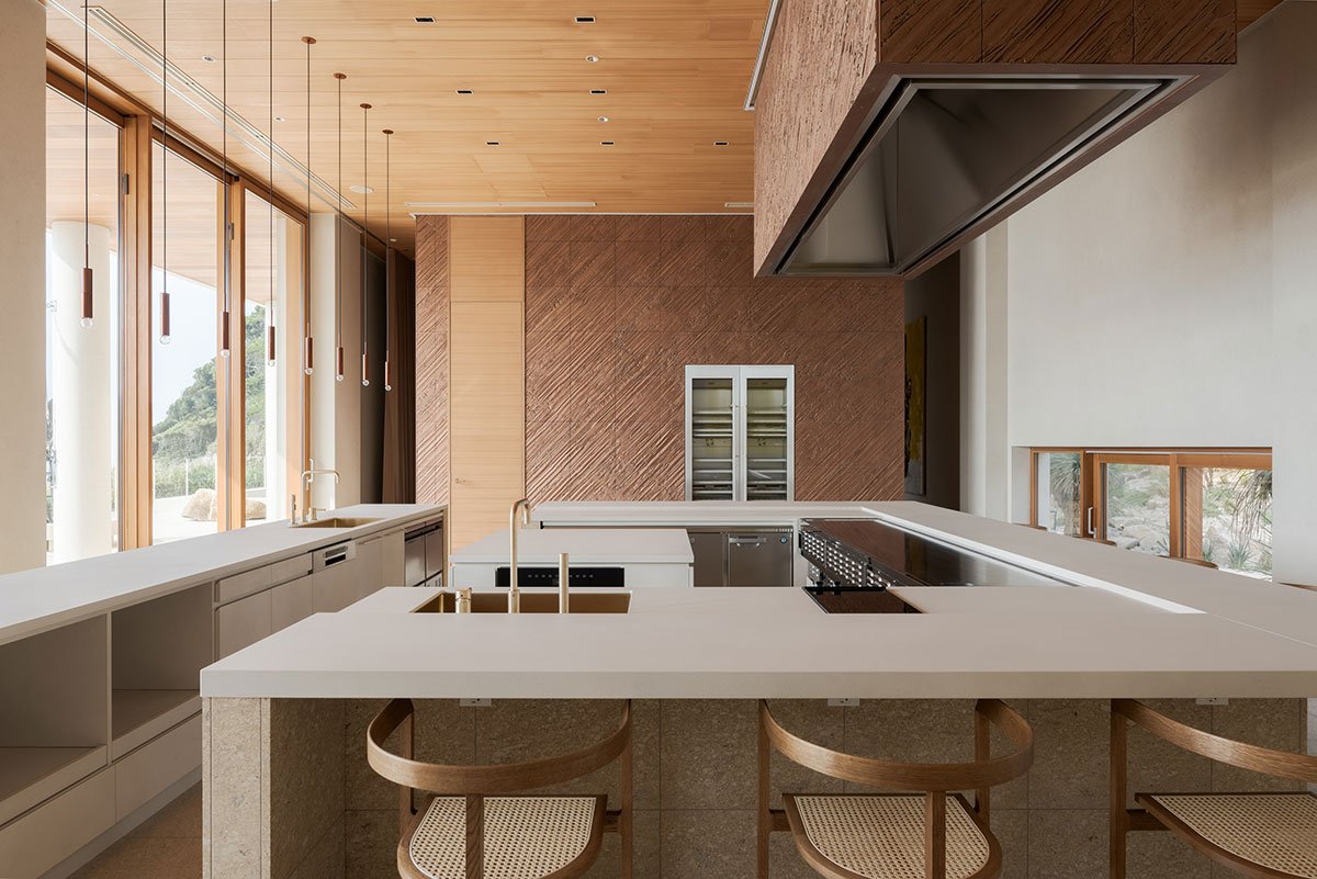 The main dining area features a U-shaped counter and a large custom-made griddle to provide enough space to entertain up to ten guests while enjoying the view of the ocean. Kansai-based SAI was asked to transform a large part of the wall surfaces and the kitchen hood with original textures into objects that match the spatial concept.
