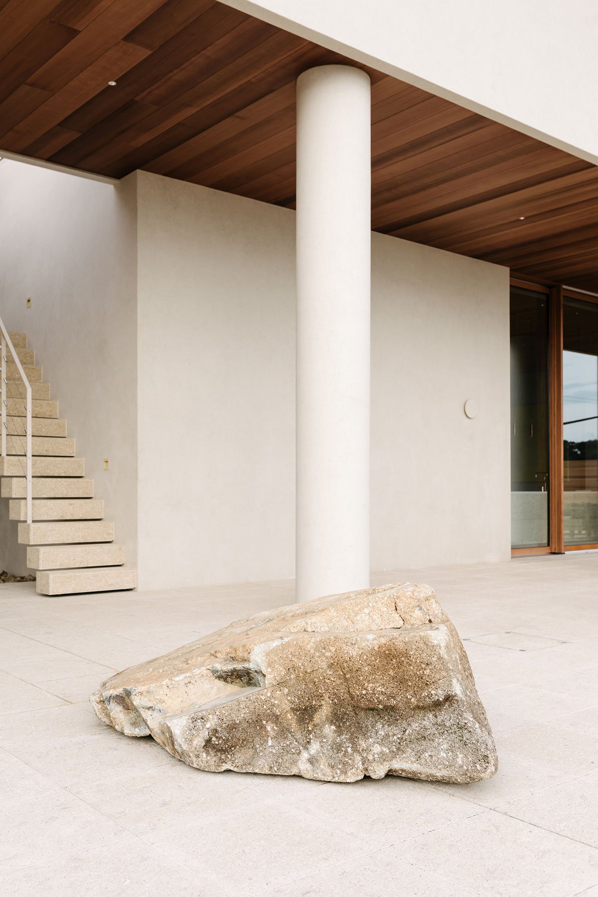 Excerpt: House in Yokosuka by Reiichi Ikeda Design is designed as an extension of the nearby beach, blurring the boundary between architecture and nature. Using granite, sand-textured plaster, and a unified material palette, the residence evokes the feel of ocean, sand, and sky. Separate volumes are linked by a floating plate, creating a seamless indoor-outdoor flow that captures the calm rhythm of coastal life.