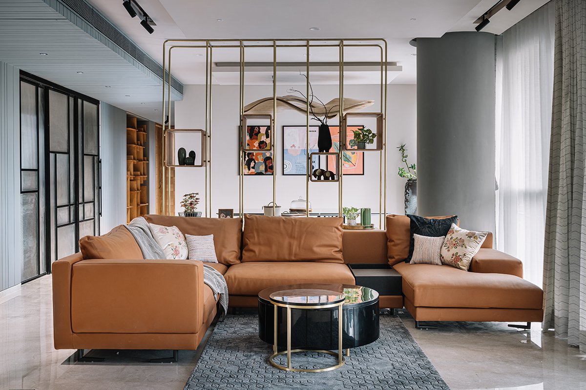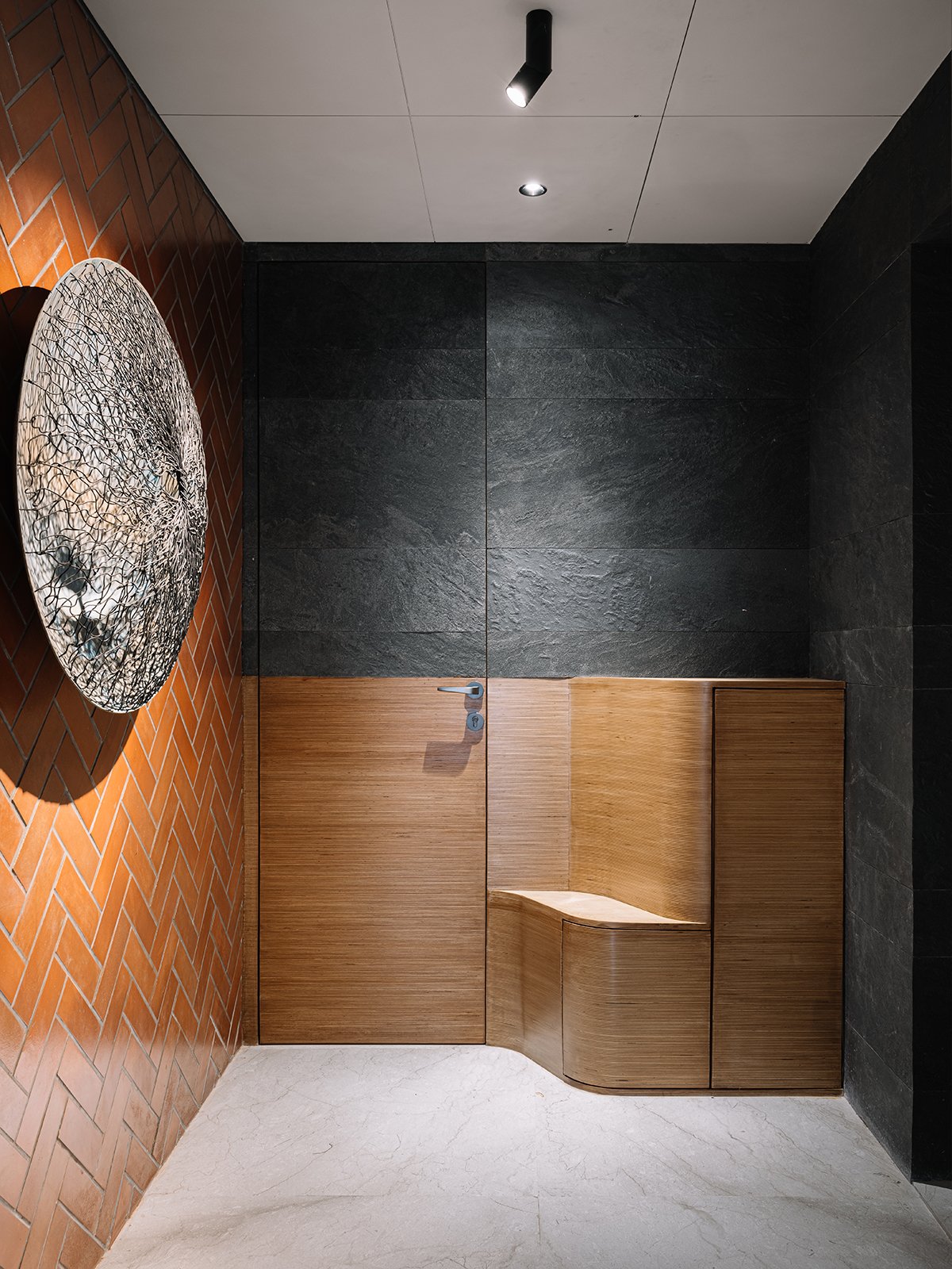 The spatial planning fosters an unhurried rhythm, where curved edges guide movement and soften transitions. Materiality plays a pivotal role: warm leather tones, brushed metal details, and organic textures create a layered yet cohesive environment. The furniture and built-in elements are conceived as extensions of the architecture, integrating seamlessly with the flow of space.