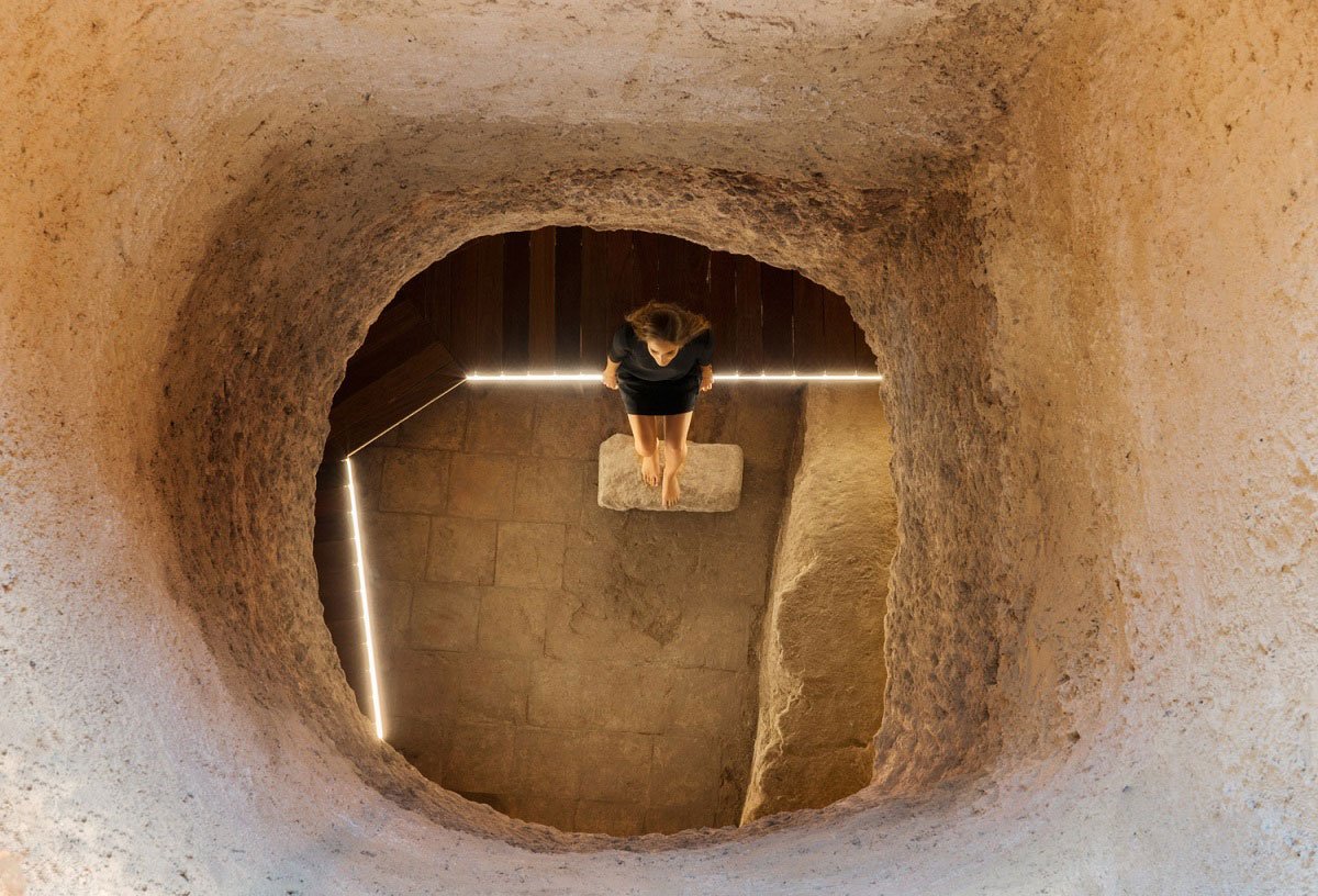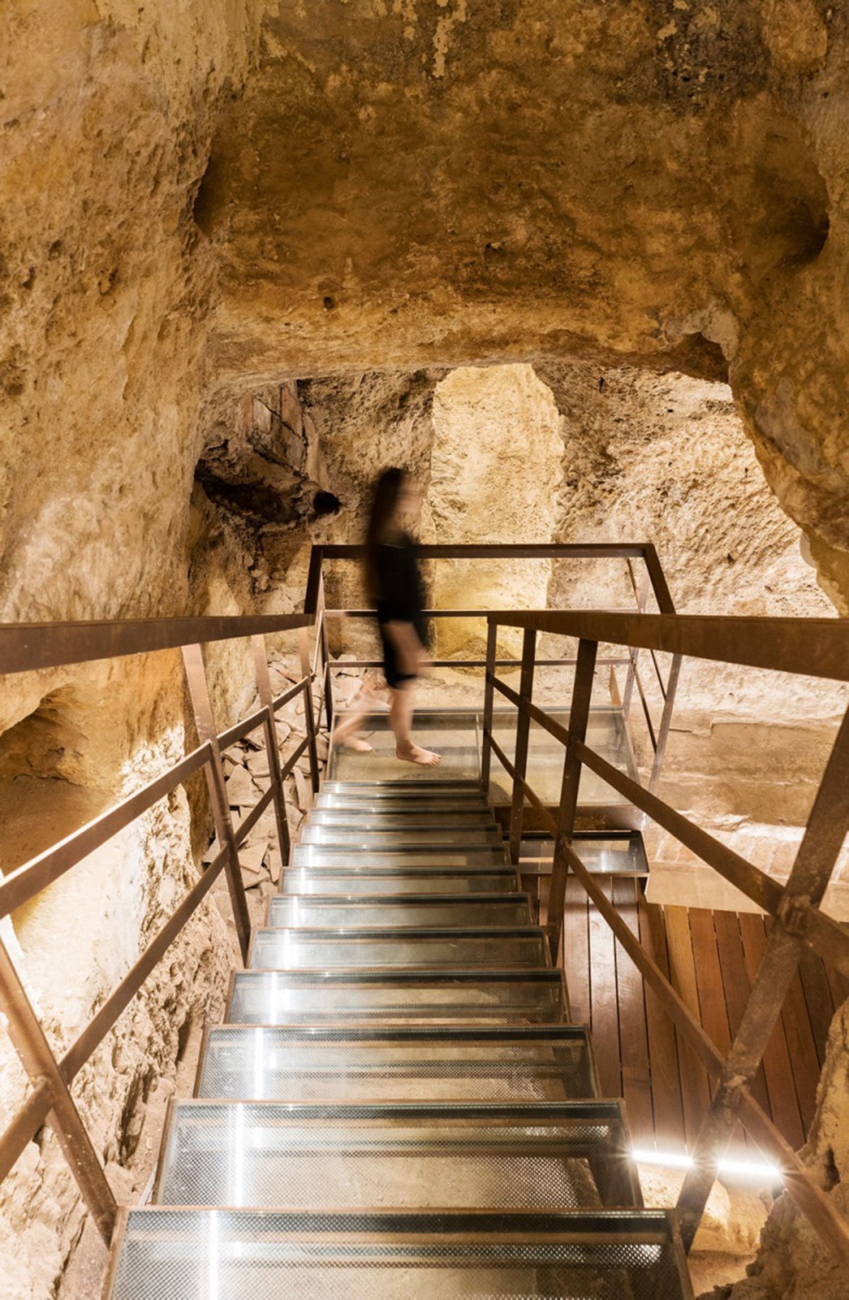 Of noted interest is the intervention (or lack thereof) in the Caves, where a single wooden walkway of Ipe Wood wraps deviously around the natural structures and illuminates the three caves while respecting their borders and not interfering with them.