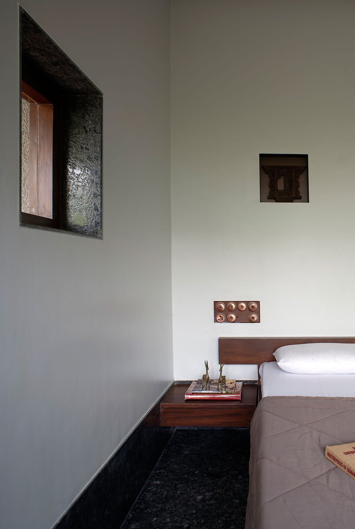All the bedrooms are thoughtfully crafted and proportioned using windows, niches and seating spaces. The spiral staircase flowing through a corner in the house is lit through the windows on one of the walls beside it.