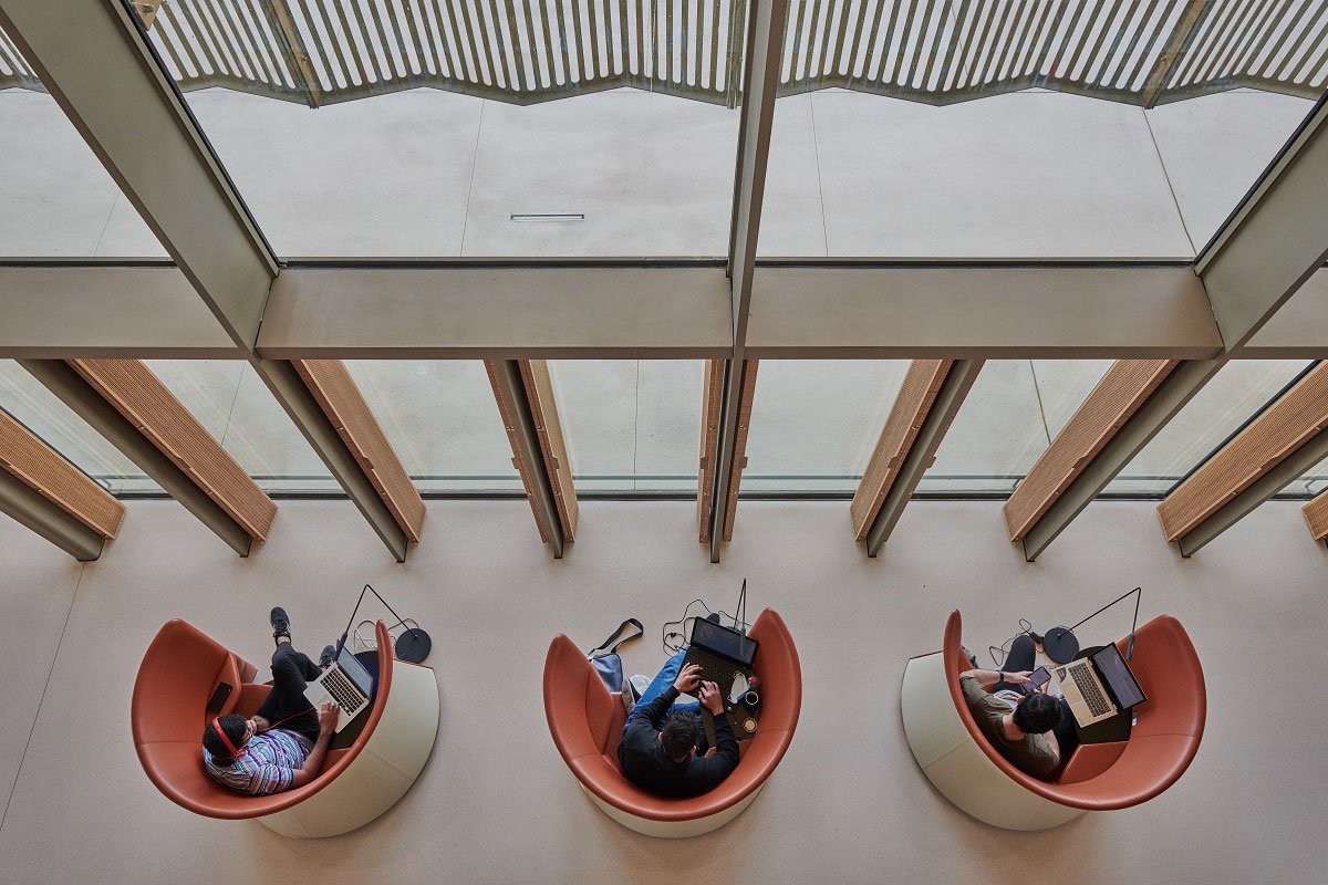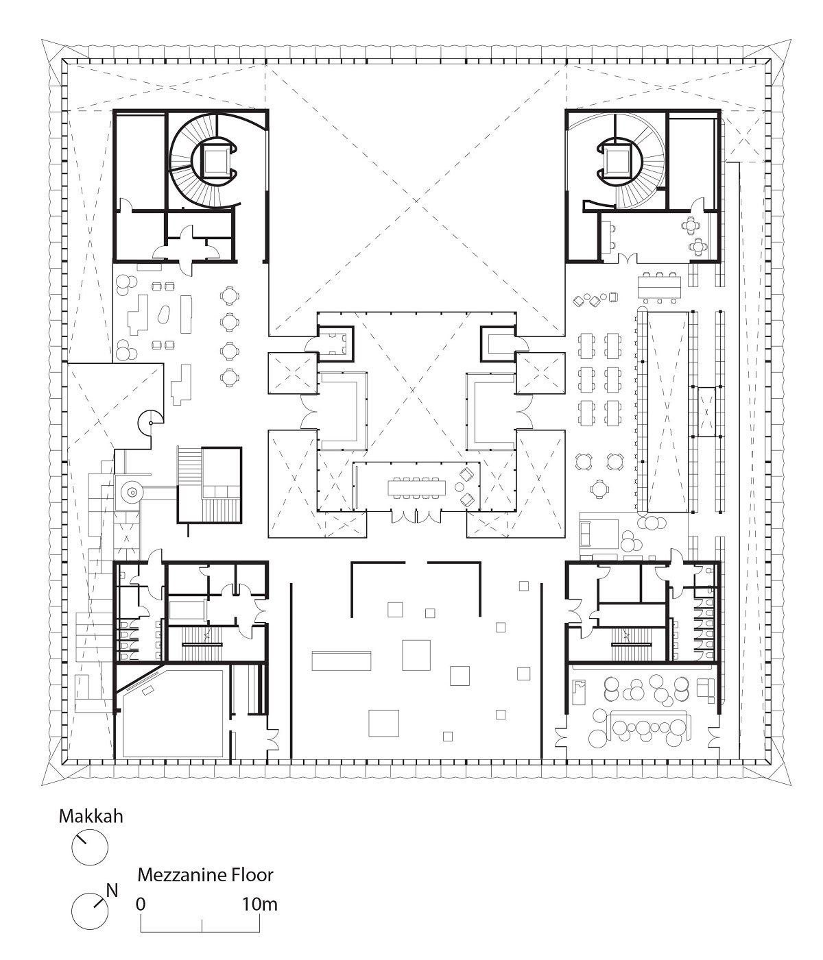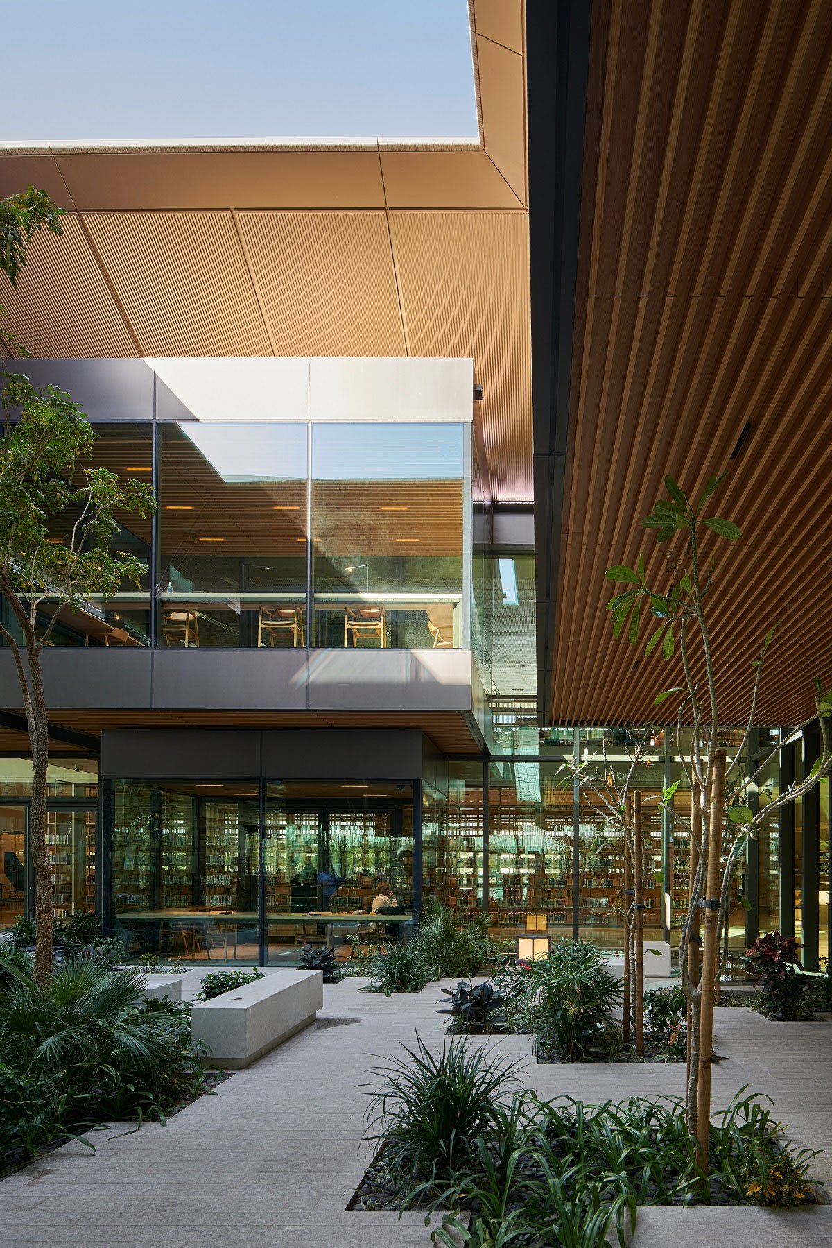 Visitors enter the building from its western edge into a double-height reception hub with a central courtyard that brings light to the interior spaces. This densely planted green area creates a comfortable outdoor environment for social events or quiet contemplation. The ground floor contains large spaces for exhibitions, a café alongside a children’s educational space, and the archive and a reading area with facilities such as an Espresso Book Machine that prints and binds books on-demand. The floating roof is supported by four cores that also contain all the back-of-house and service spaces, creating a large column-free floorplate. The two cores closest to the entrance contain large sculptural staircases that guide people up to the mezzanine floor. The upper floor hosts a series of pod spaces suspended above the central courtyard, which offer both quiet and collaborative spaces, exhibition areas and reading lounges including a prayer room and a women-only area. Throughout the building, there is an emphasis on establishing and retaining a connection with the outside, looking onto the gardens surrounding the building.