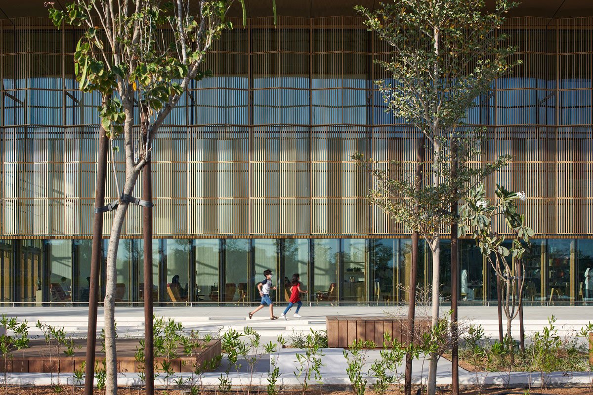 The landscape is divided into two sections – a knowledge garden and children’s playground to the south, which has several native species and a water feature, alongside a more formal, geometrically arranged garden to the north containing The Scroll – a new piece of public art by British sculptor Gerry Judah that is a contemporary interpretation of the ancient Arabic scrolls as a single, spiralling sculpture that loops towards the sky.