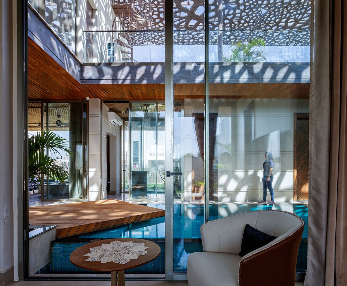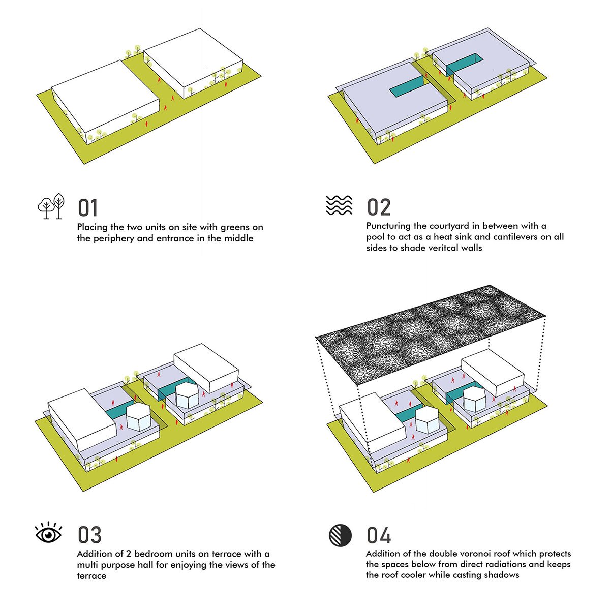 The design takes shape with a common entrance space embraced between two boxes that represent the two units, following a mirroring process thereafter and throughout. The units are punctured with two chowk-inspired rectangular courtyards, each in the form of pools that act as heatsinks. This is balanced by immediate cantilevers that run along the units, shielding internal and external walls with shade; the cantilevers also enable transition spaces across. The cantilevers and the courtyard areas facilitate social cohesion and seamless movement between spaces that steers one away from the sense of confinement typically felt within walls.