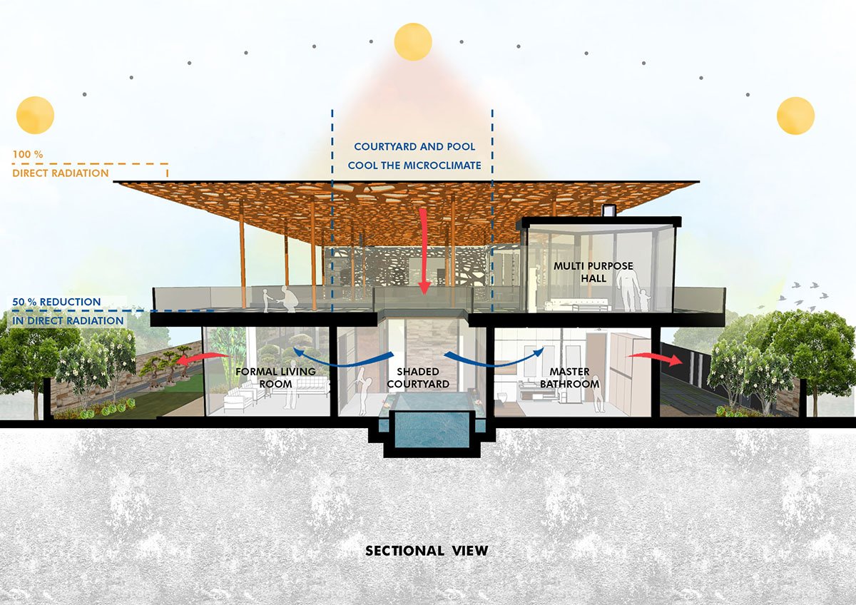 The addition of the roof canopy has resulted in 50% reduction in direct and diffused radiation. This has led to an equally significant consequent reduction in heat gain, and cooling loads making the design both sustainable and energy efficient. The roof material has a minimal 0.4 value of thermal transmittance, further preventing the ingress of heat to the built structure. The annual cooling load went down from 76 kilowatt-hours per square meter to 53 kilowatt-hours per square meter – indicating a 20% reduction.