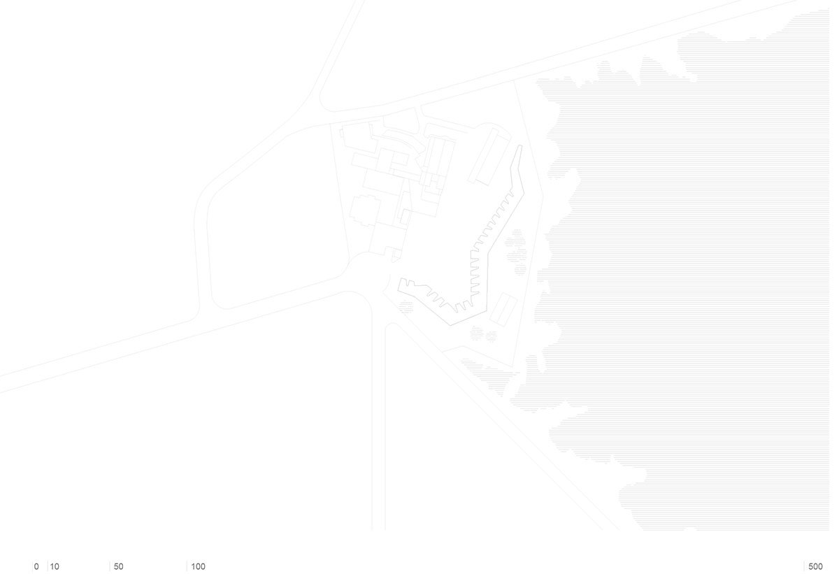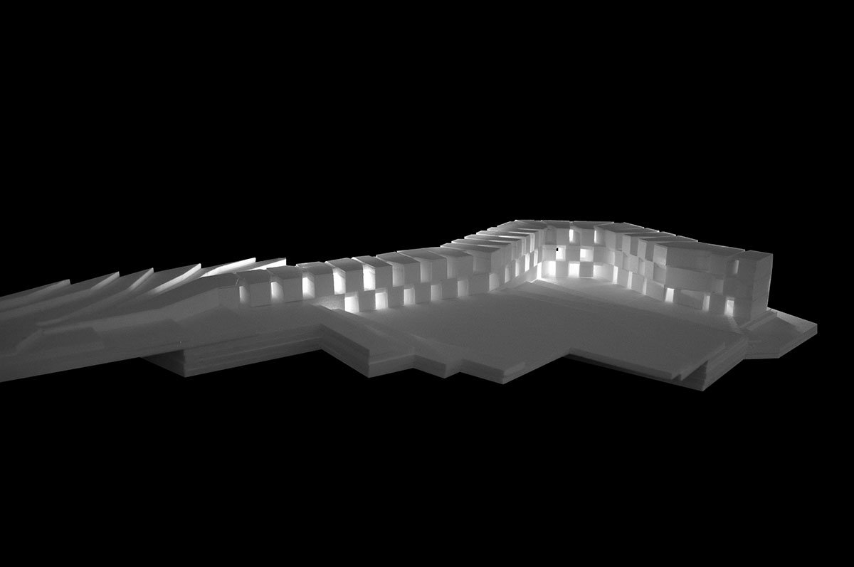 The distance between the independent units is measured and drawn to turn the idea of path into life, and its time into form. The building, designed path, is a wall that naturally rises from the topography: it limits and defines the open space, organizing the entire plot.
