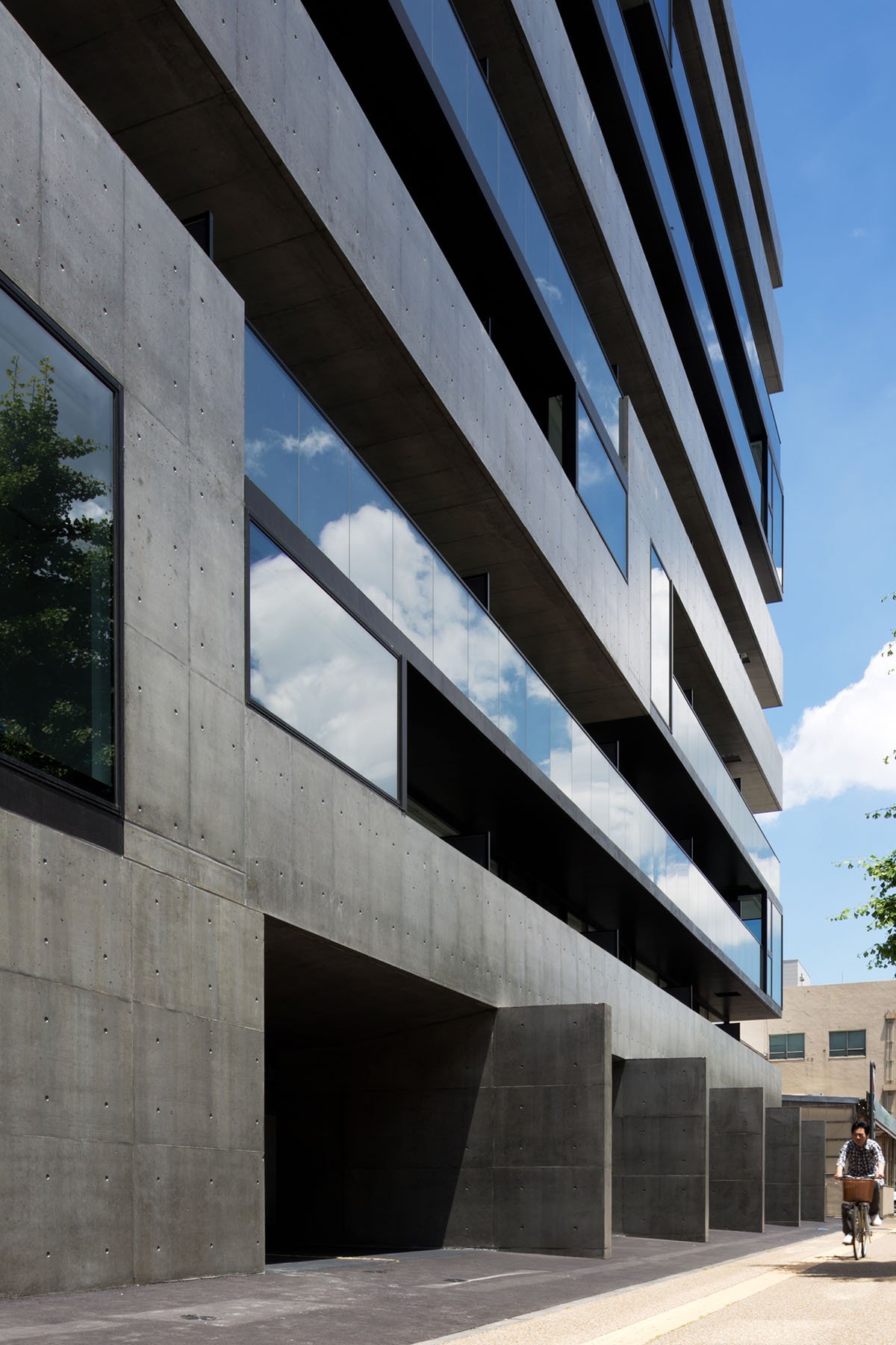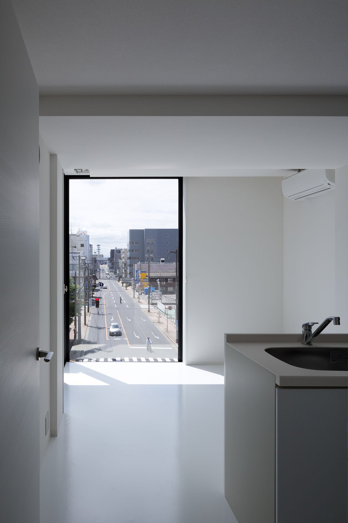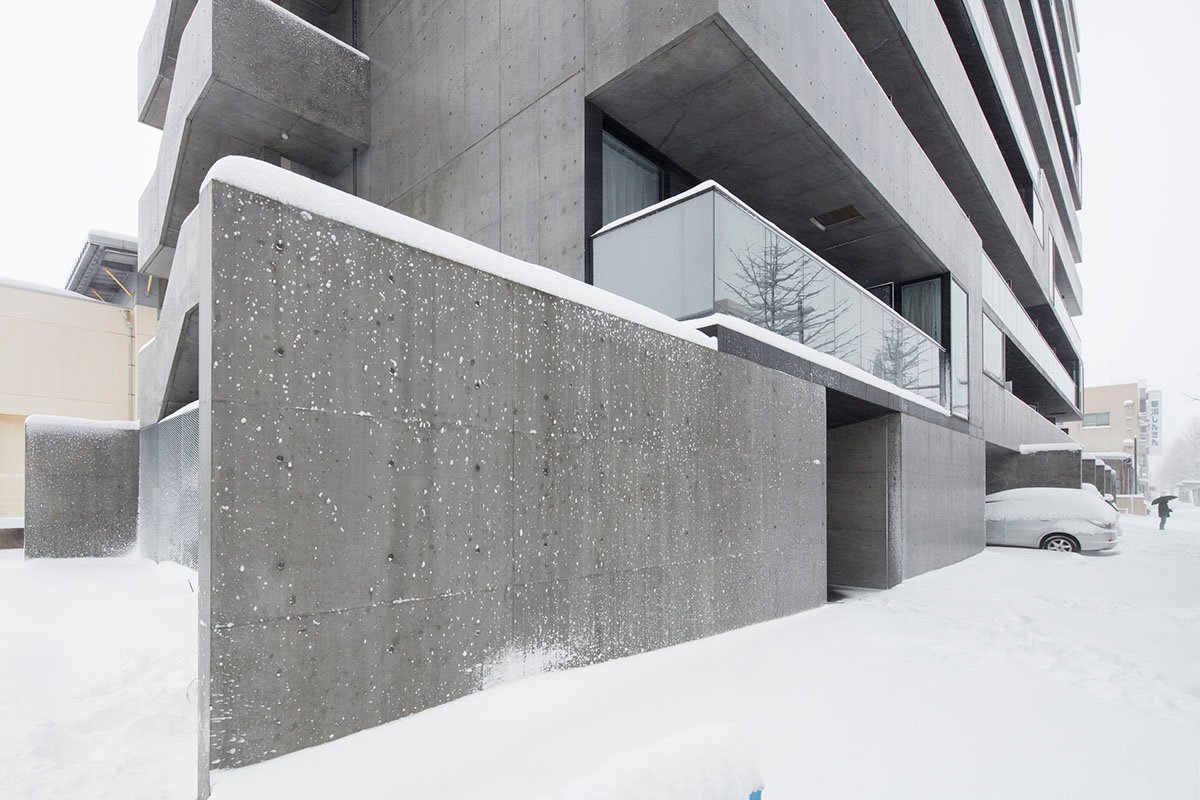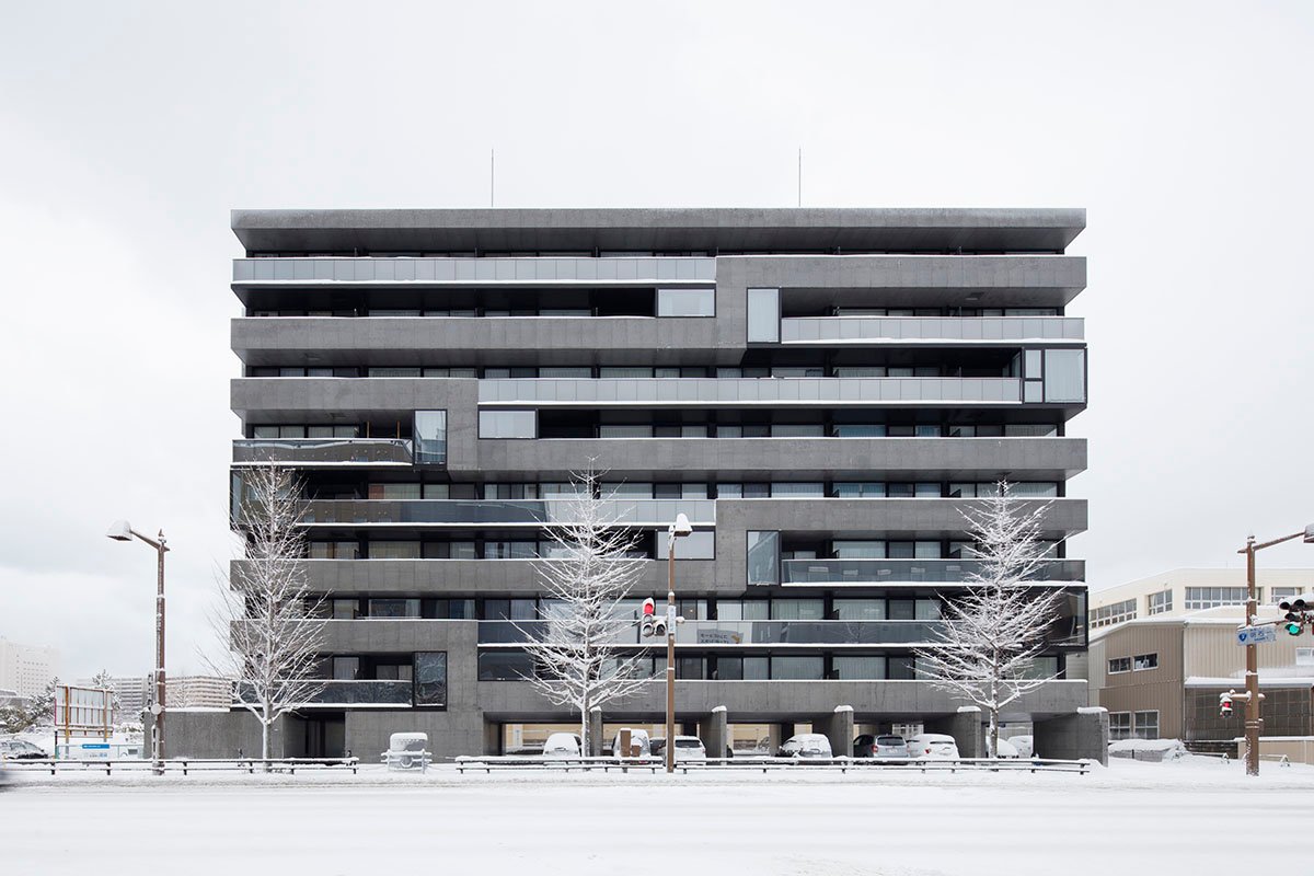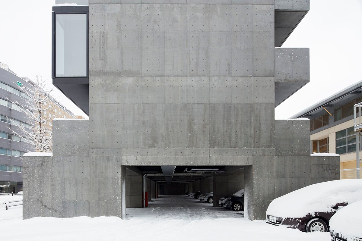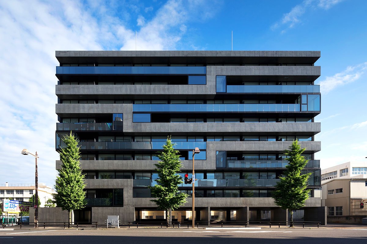 This is a 56 dwelling housing complex located in Niigata, Japan. It sits along a main road, close to the central station and at the end of a busy T-junction. Due to its scale Niigata is a typical motorized society. It lacks a metro system and therefore private vehicles are a prevalent mode of transport. In response, we utilised piloti as a means to maximise the number of parking spaces. The piloti serve a dual purpose; not only adopted by the architectural plan they also contribute to the structural stability of the building.