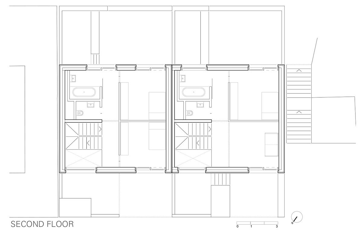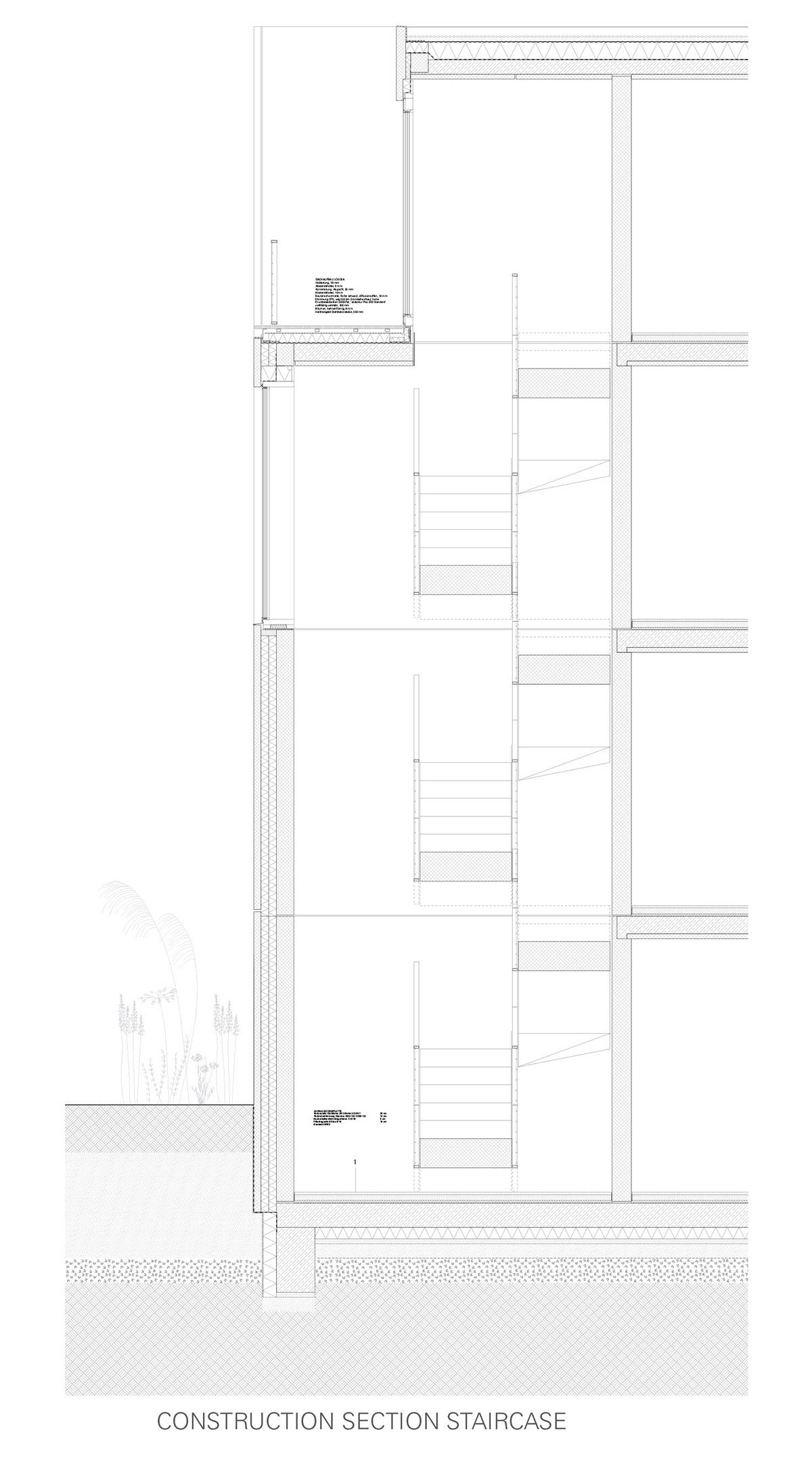 The versatile, flexible floor plan variations create a kind of fluid core within the robust construction, which wraps itself around the interior of the house like a protective shell. It is conceivable that the four-story houses, each currently occupied by a family, will one day be used by retirement communities or that individual floors will be separated off as granny apartments. Living is conceived here as the totality of our activities, to which the spaces of the house, as a logical continuation of the spaces of the city, grant an appropriate option of appropriation and variation. In this way, the two houses not only activate a plot of land in the city that is otherwise difficult to use, but also make its use by the inhabitants possible in a constellation not yet defined today in an unwritten future.