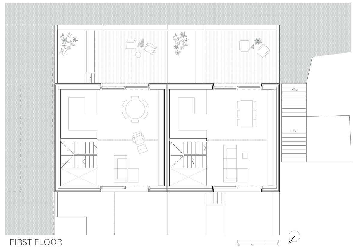 From the street, both parts of the semi-detached house appear like identical twins: small front gardens, floor-to-ceiling large window openings, recesses for entrance loggias on the first floor and small terraces on the top floor, plus the joint pattern of the precast concrete elements. The industrial character of the prefabrication is emphasized by the lattice balustrades in front of the French windows and terraces. All of this follows the gradient of the street, the joints of the respective building components blend finely into the system and bear witness to the careful detailed planning.