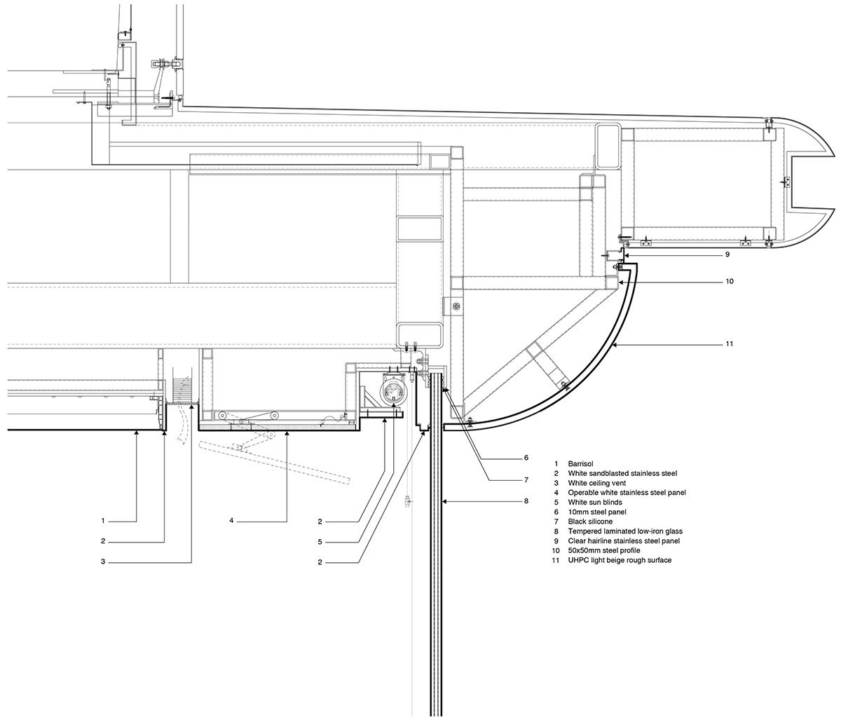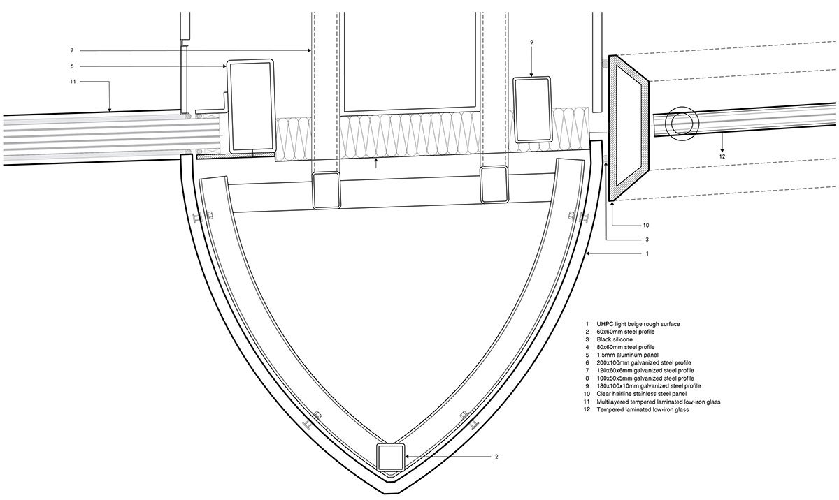 Facade: The grandeur of ancient Chinese Architecture is reflected in the facade by a 2-story high glass facade, framed by curved UHPC (Ultra High-Performance Concrete) facade panels. Taking inspiration from the city’s undulating rooflines, the facade panels replicate their graceful curves. Careful attention to technical details ensures a clean and smooth finish.