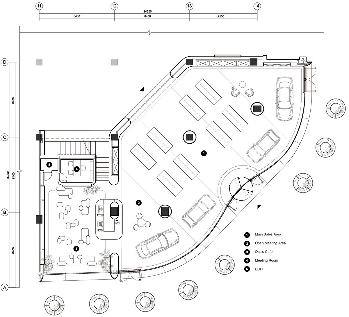A focus on openness towards the city is evident by the use of 8.8-meter-high glass panels, drawing in passersby from the street. Inside the Oasis Cafe features a large LED curved screen, adding to the appeal and seamlessly connecting the exterior and interior. The UHPC panels trace the mall canopy’s contours, while the glass gently creates a concave pocket at the entrance, creating an inviting gesture.