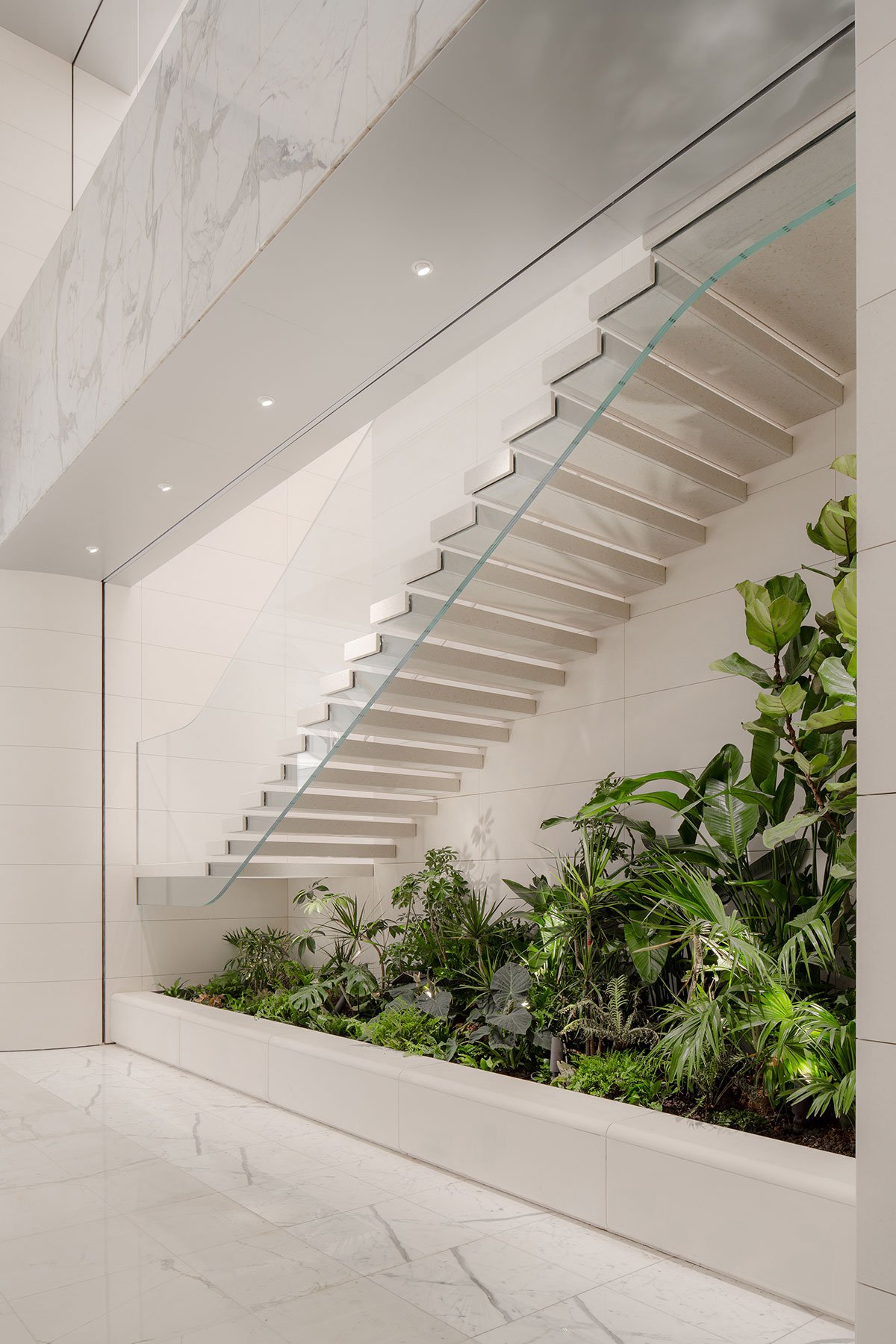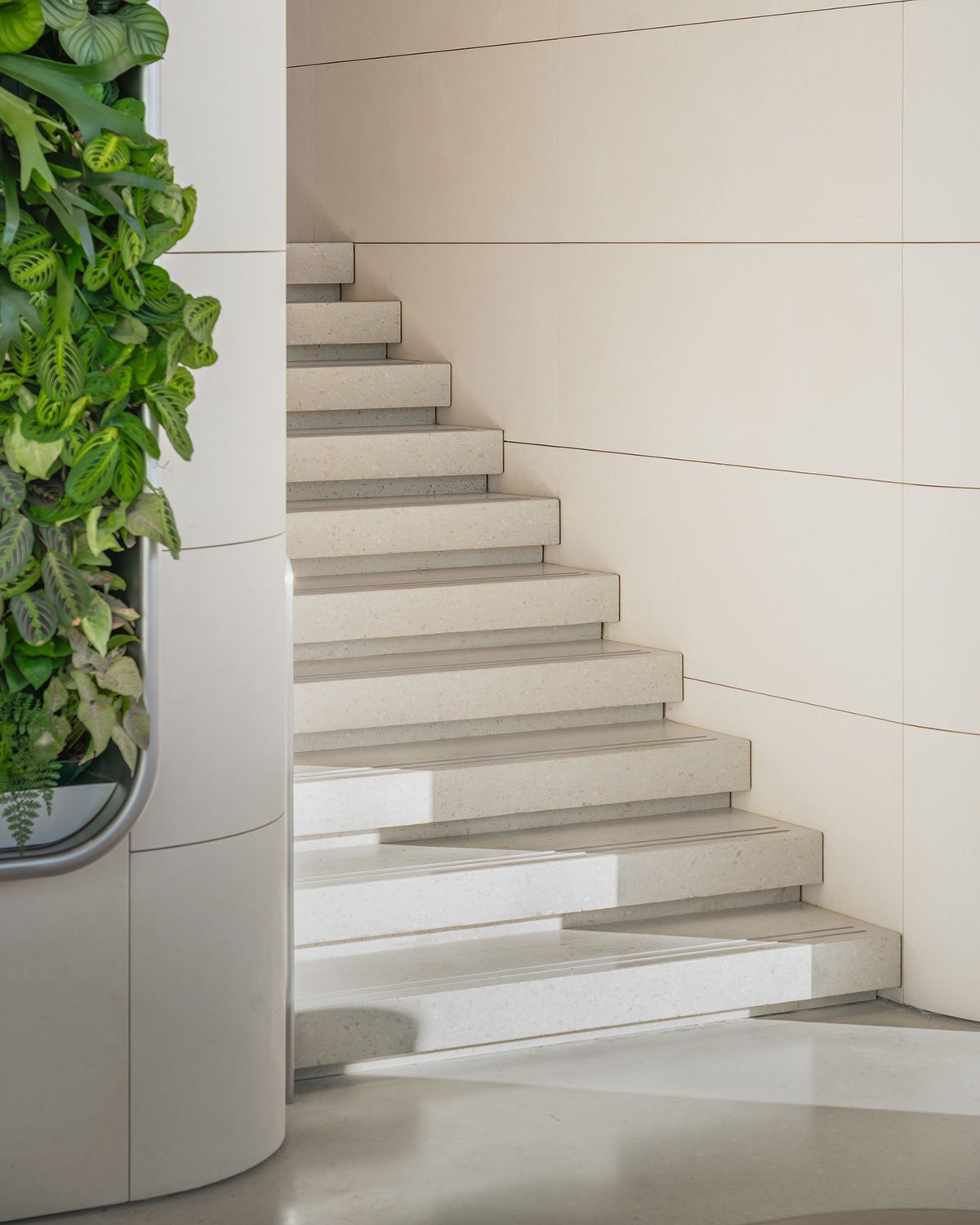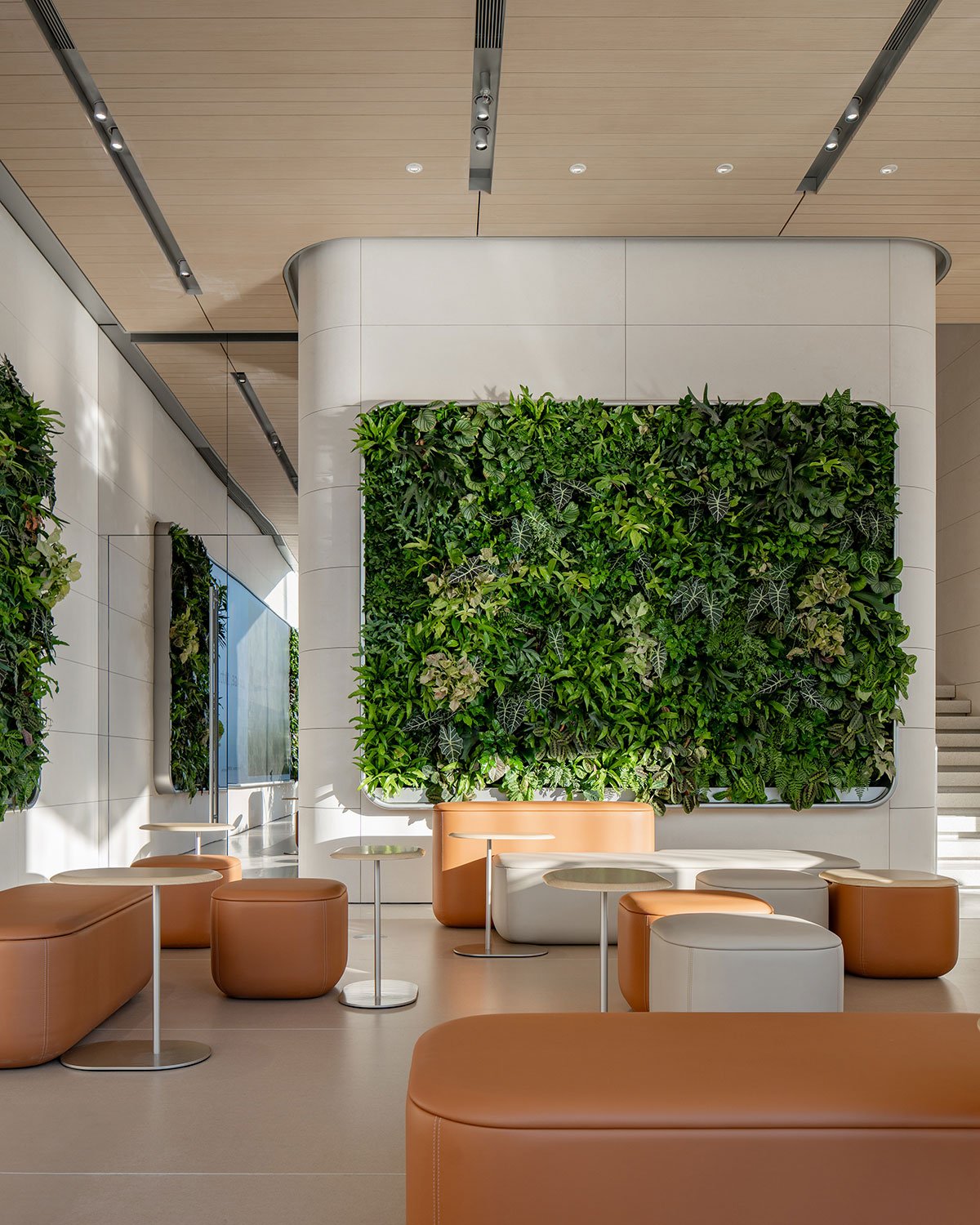 The Urban Oasis Cafe serves visitors and encourages visitors to use the products, interact and immerse in the ‘Urban Living Room’. A travertine coffee bar was added to this space which can also be used as a gathering space and auditorium space for events and talks. The design of the cafe aims to create a welcoming atmosphere, achieved through the use of wooden ceiling boards, warm flooring materials, and the integration of lush green walls. The cafe also features stairs which lead visitors to the second floor. The stairs – partly made with glass steps – hovering above an internal lush garden, inspired by the Great Wall meandering through Beijing’s green mountains.