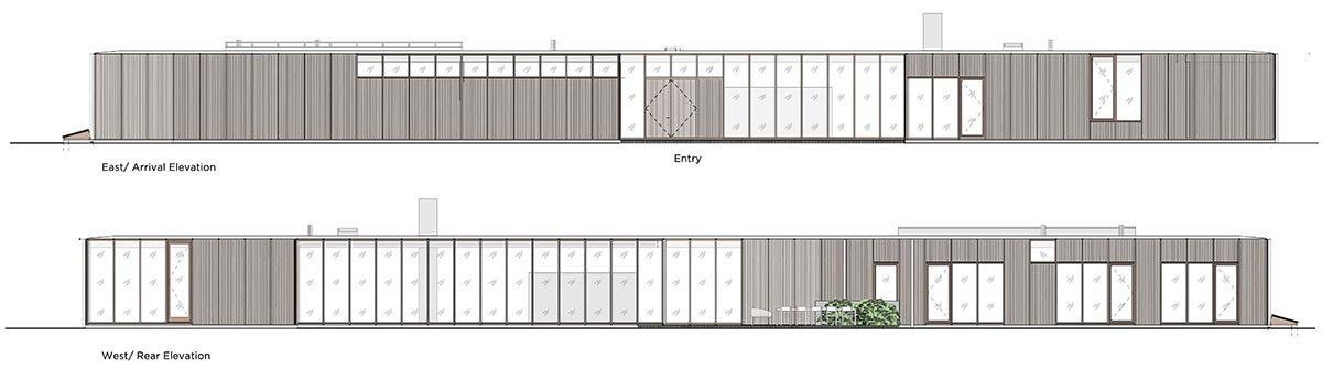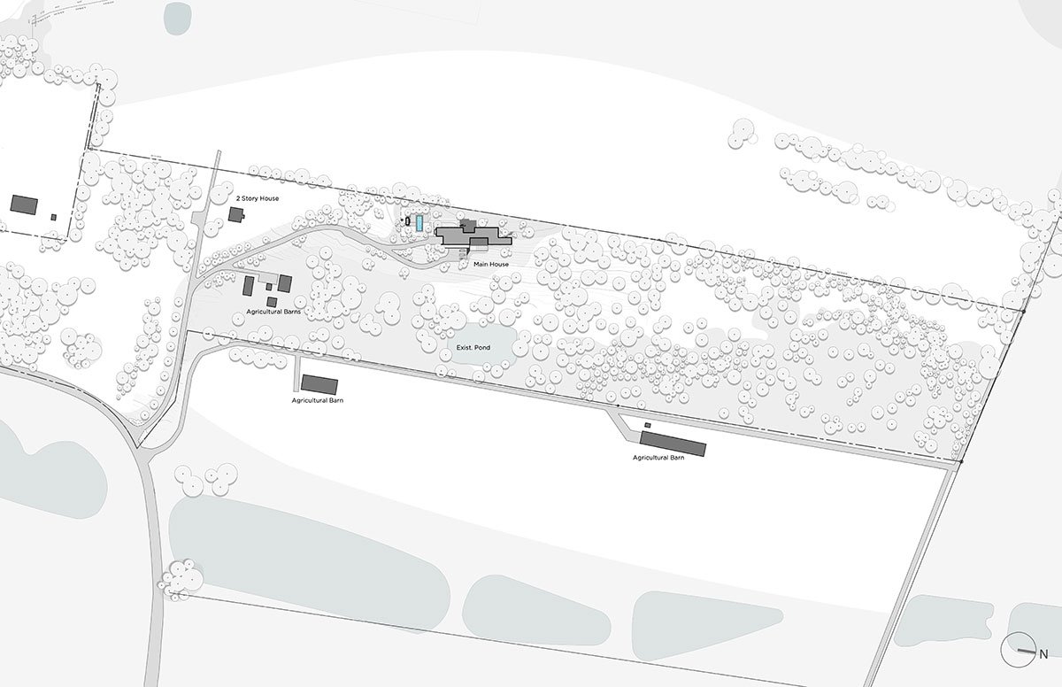 Set among the rolling hills of primarily rural farmland, access to Hudson Valley Residence II winds its way up a hillside to a front entry court on top of a ridge. Expansive glass panelling immediately draws attention into the home, while simultaneously framing the mountainous horizon beyond. In contrast to the vertical ascent, and the massive verticality of the mountain range to the west, the home itself extends horizontally along the entirety of the ridge. Comprised of a series of utilitarian, simple form buildings with a repetitive vertical rhythm, the home’s elongated footprint is reminiscent of the long, low-lying characteristics of agricultural buildings that dot the surrounding regional landscape.