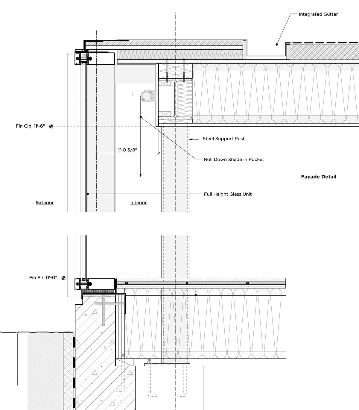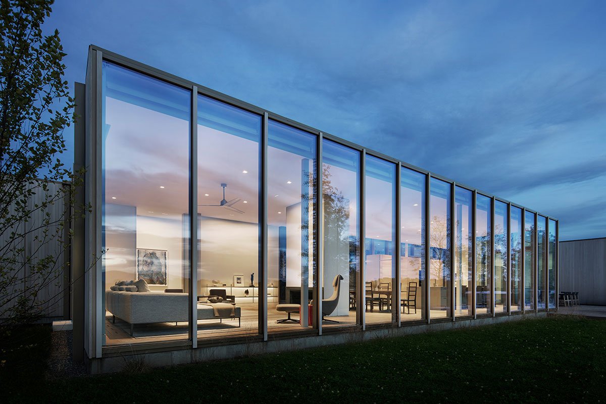 Devoid of any roof overhang, the cedar siding, the glass panels, and their interactions with the elements collectively ensure minimal separation between the interior and exterior, and contribute greatly to the ambiance of the residence. On hot, sunny days, natural light filters through the expansive windows to interact with the silvery wash of the interior’s custom-stained walnut flooring, infusing cooler accents of blue into the interior. At night, or when the weather outside is cooler, warmer tones emerge from the color and material palette.