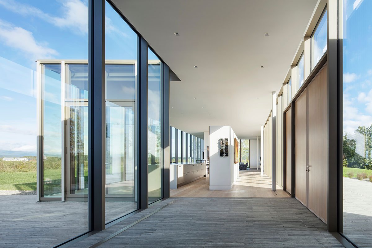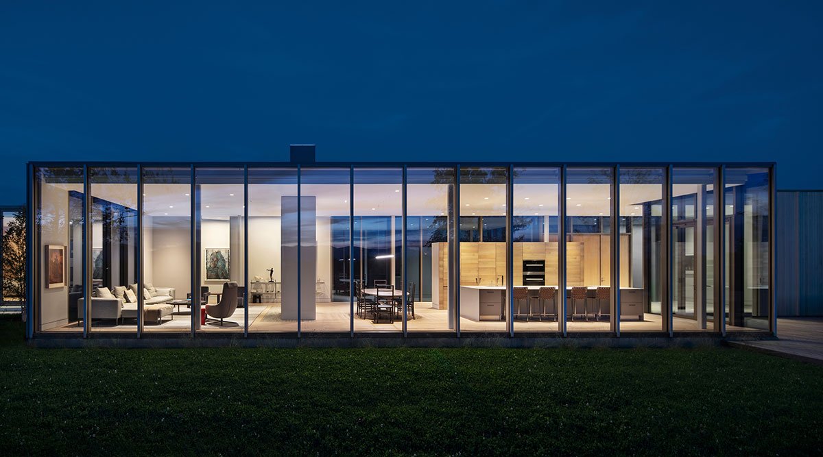 A seamless blend of earth and sky: Custom-stained external cedar siding, a classic and durable material, provides an inspirational nod to the character of the home’s agricultural neighbors. The siding harmoniously blends with 13-foot glass panels that provide the home with breathtaking transparency, and the materials interact with the sun to capture the colors of the surrounding earth and sky.