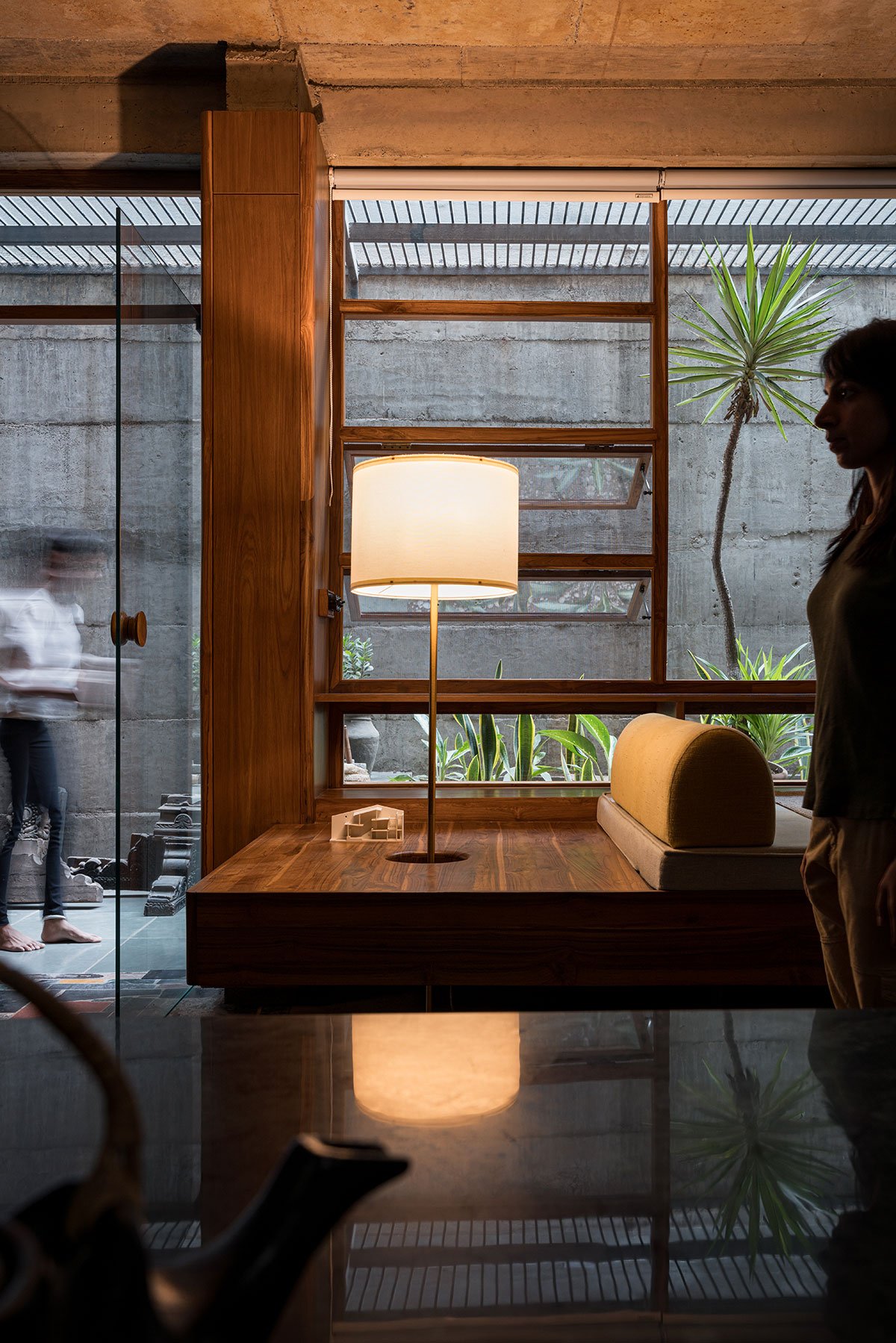 The studio is a raw concrete shell with its own pockets of light, shadows, sky, greens, and a garden. It was envisioned to be a retreat for introspection and a space for the expression and discussion of ideas by many. Glass doors offer a choice to stay connected to the sounds of everyday life or shut out distractions for focused work.