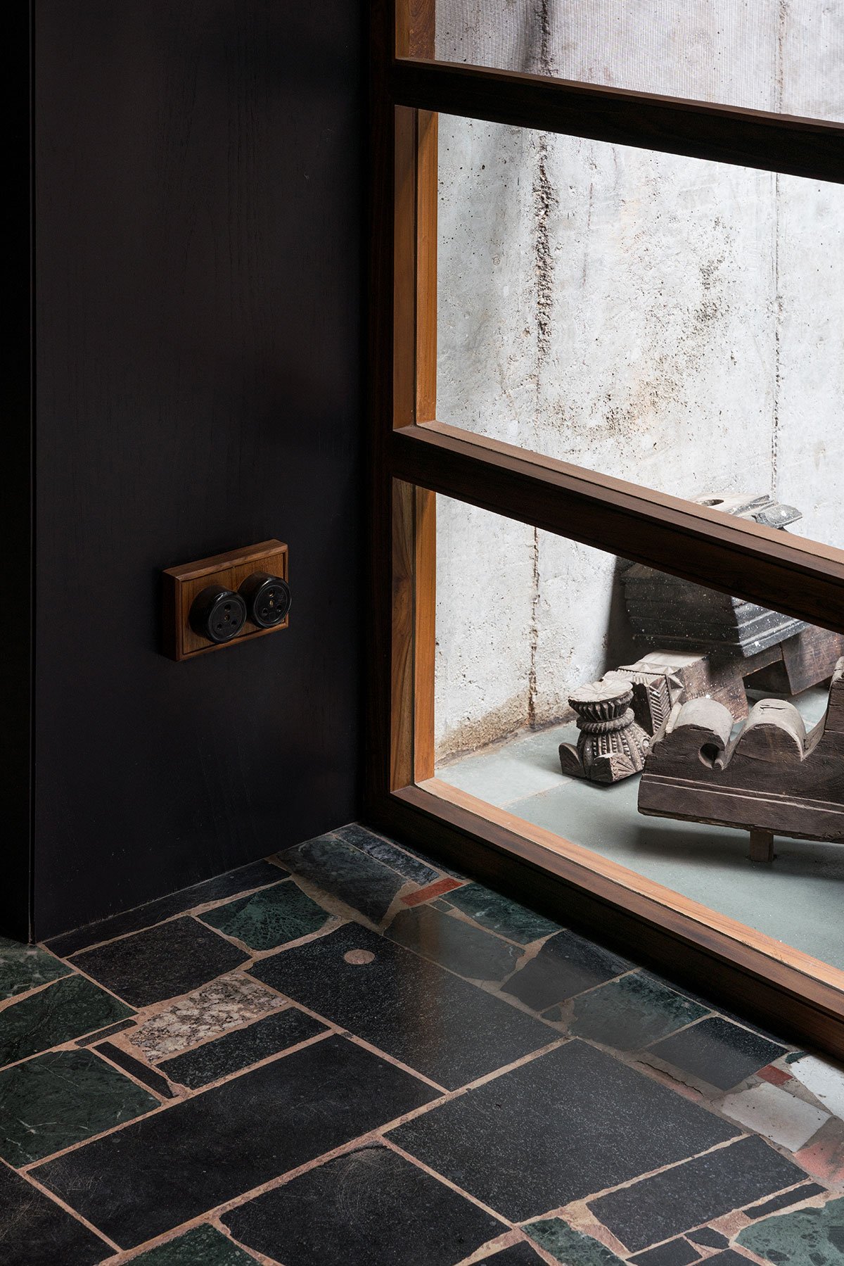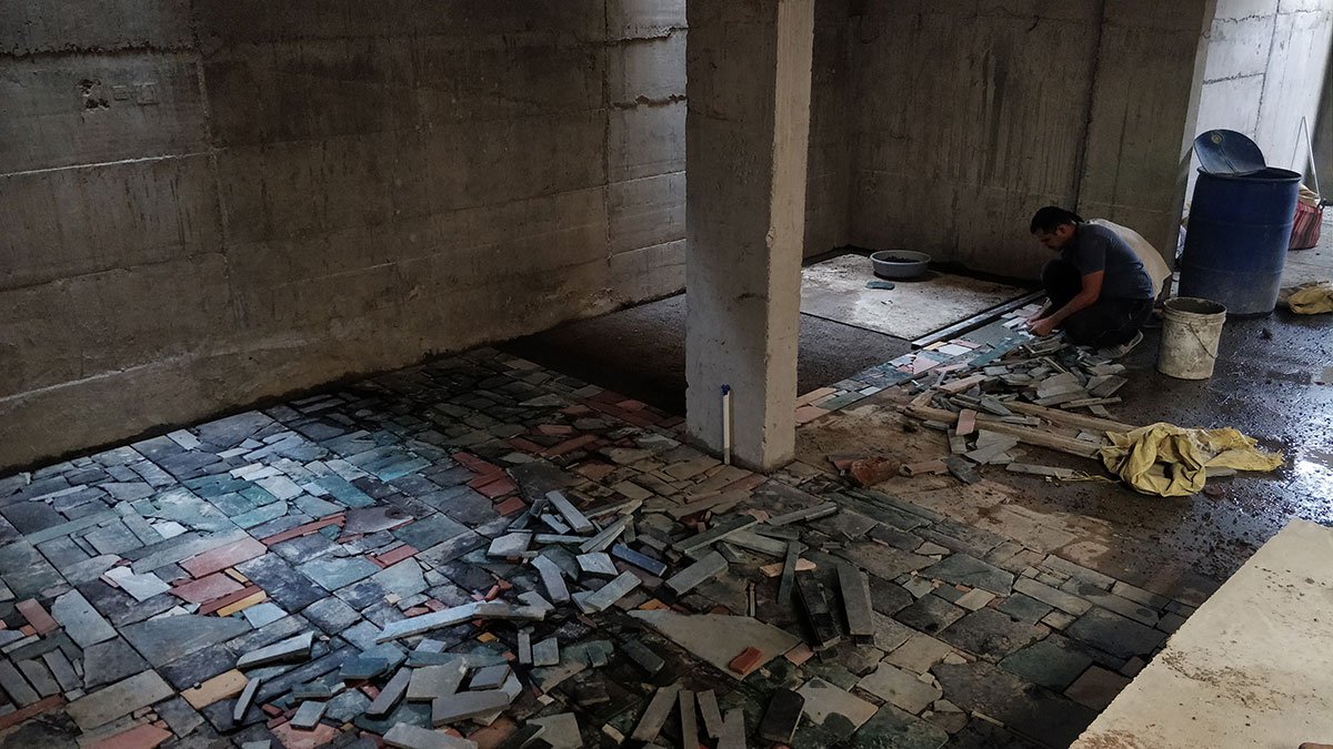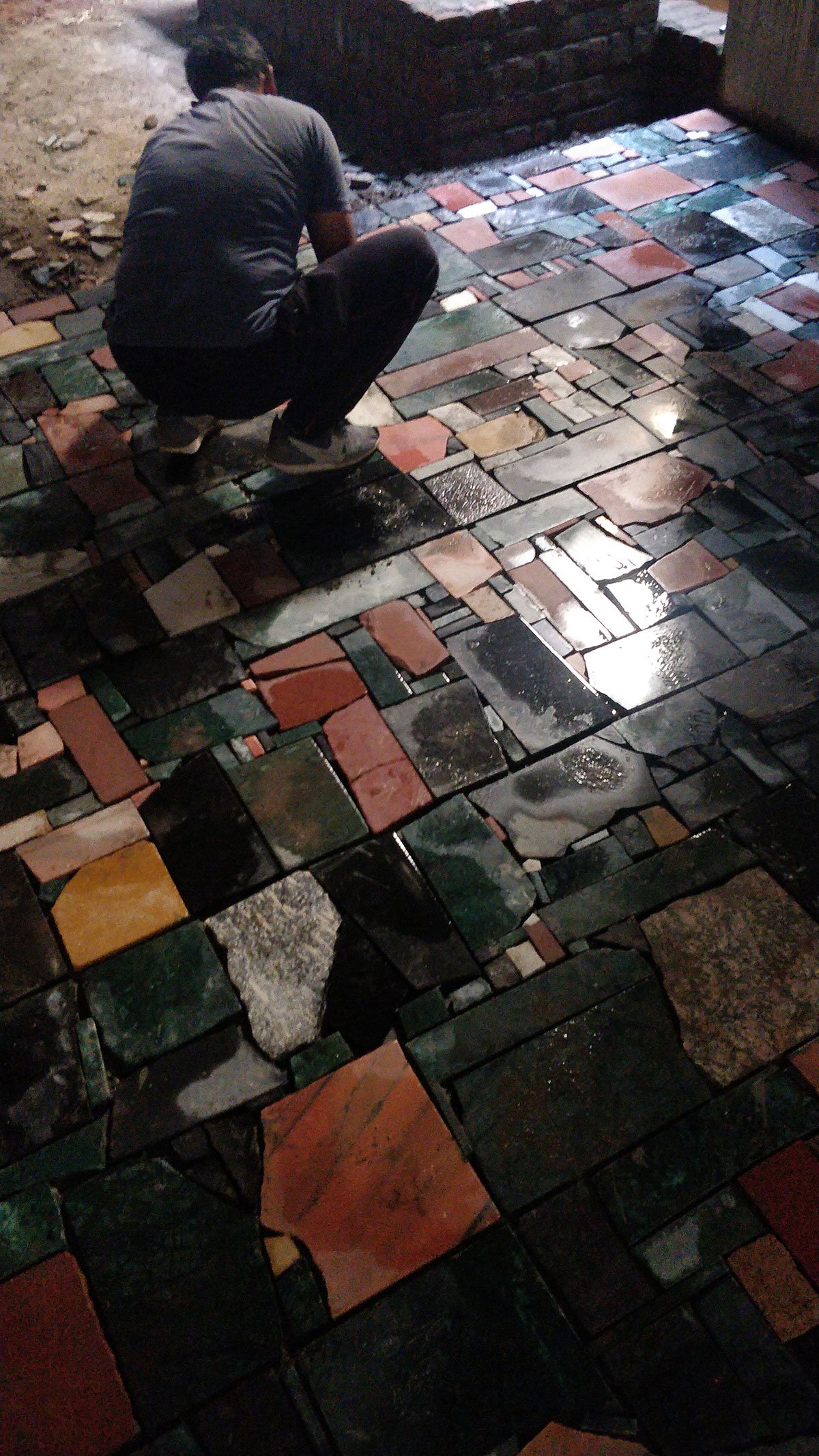 Collaborative experimentation led to the laying of a stone carpet made of pieces of various shapes, colors, and textures, an opportunity discovered in a pile outside many stone workshops. The concrete shell remained bare, allowing the stone carpet to take shape intuitively, forming layers that either reflected or absorbed light.