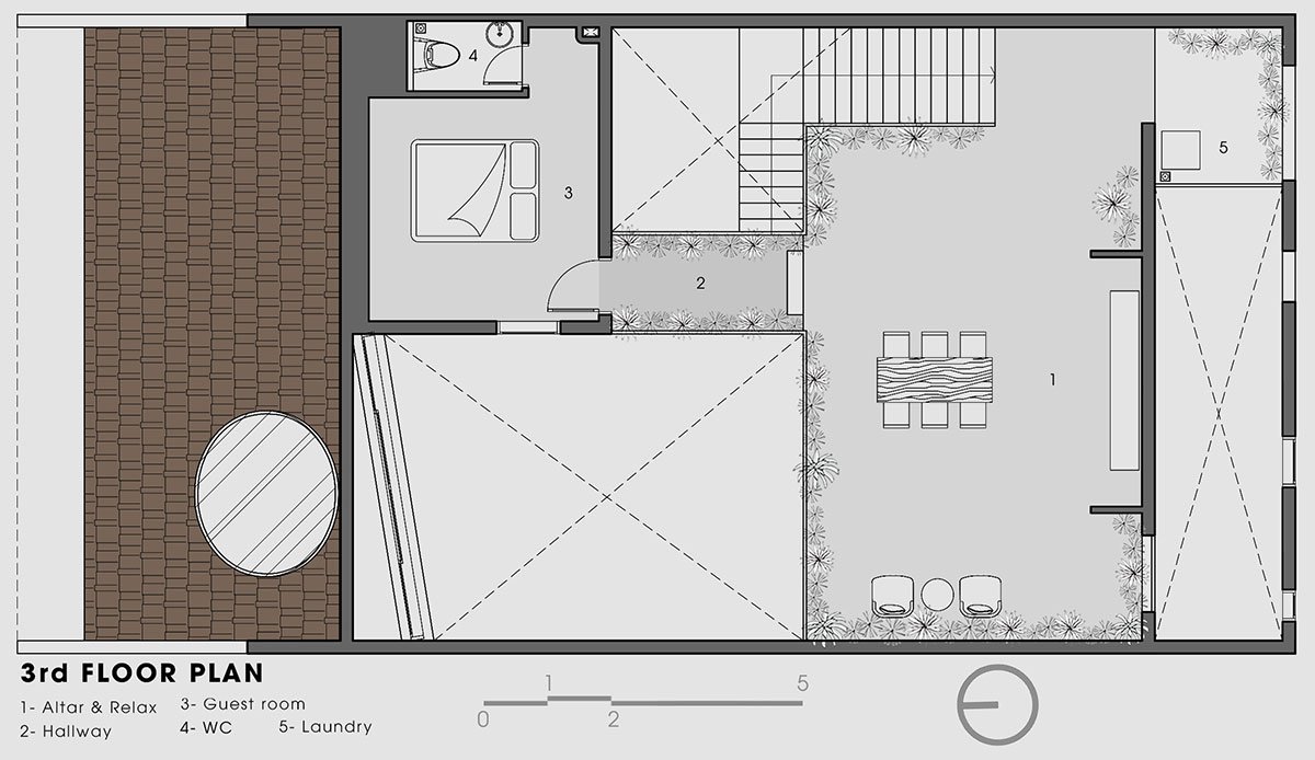 The roof is also hollowed out to create glass windows that bring light into the center of the house, making the house cheerful, lively, and full of energy. At the same time, the roof window in the third floor bedroom helps homeowners to view the night sky from their bed.