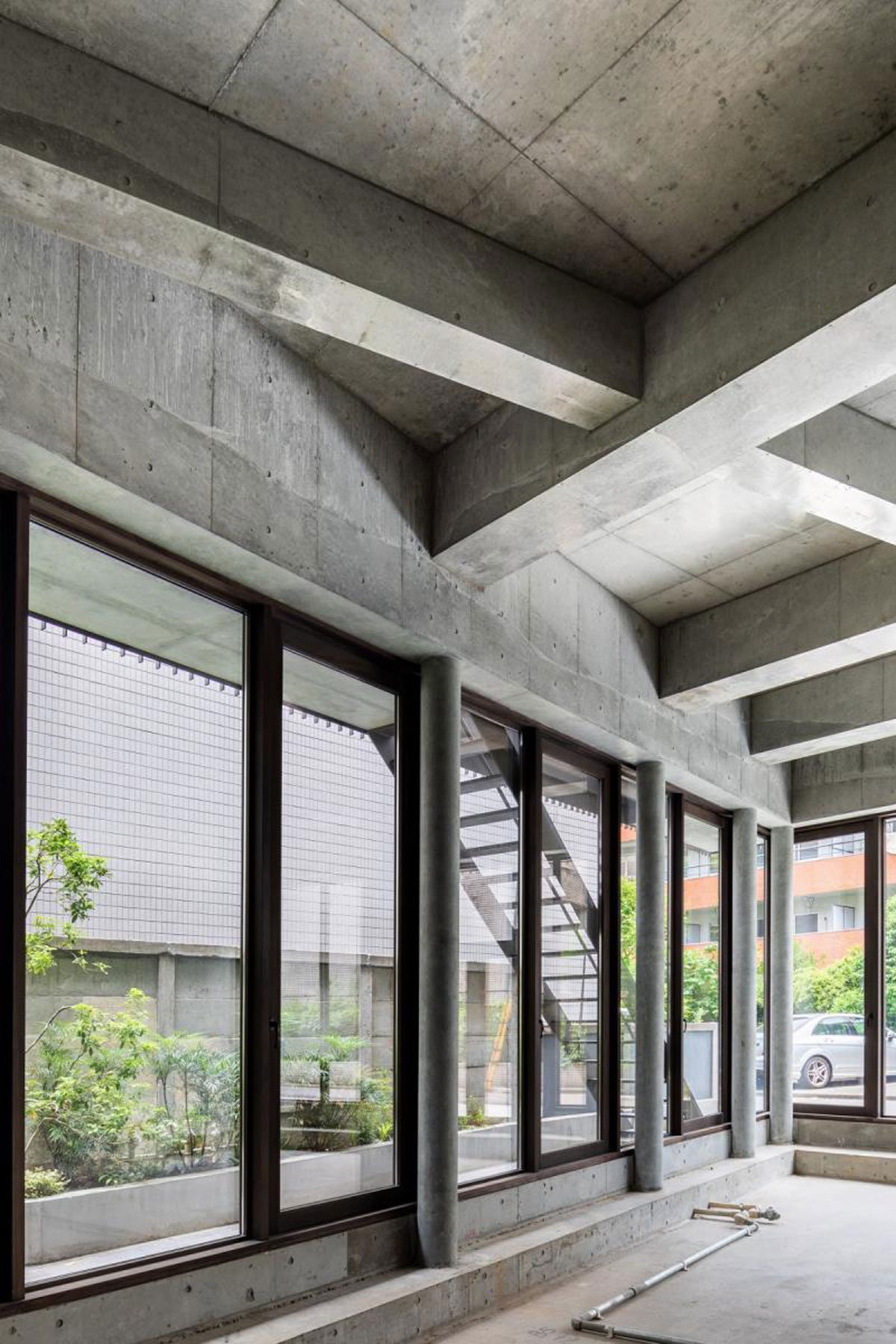 The resulting structural depth about half a storey deep functions as servant layers between each floor, providing infrastructural supports to the floor below and above such as mechanical space, attic storage, loft, underfloor storage, planting pit, etc., which allows the main spaces to be more open and flexible. The linear façades around the building’s slab volumes are wrapped by metal bands with repetitive vertical slats like louvers. Their design comes from the positive interpretation of the code requirements forcing a vertical slats design on the rooftop balustrade to conform the shadow regulation. The continuous vertical louvers allow for interplay between openness to the perpendicular views and privacy from the diagonal views besides enhancement of horizontality of the floor layers.