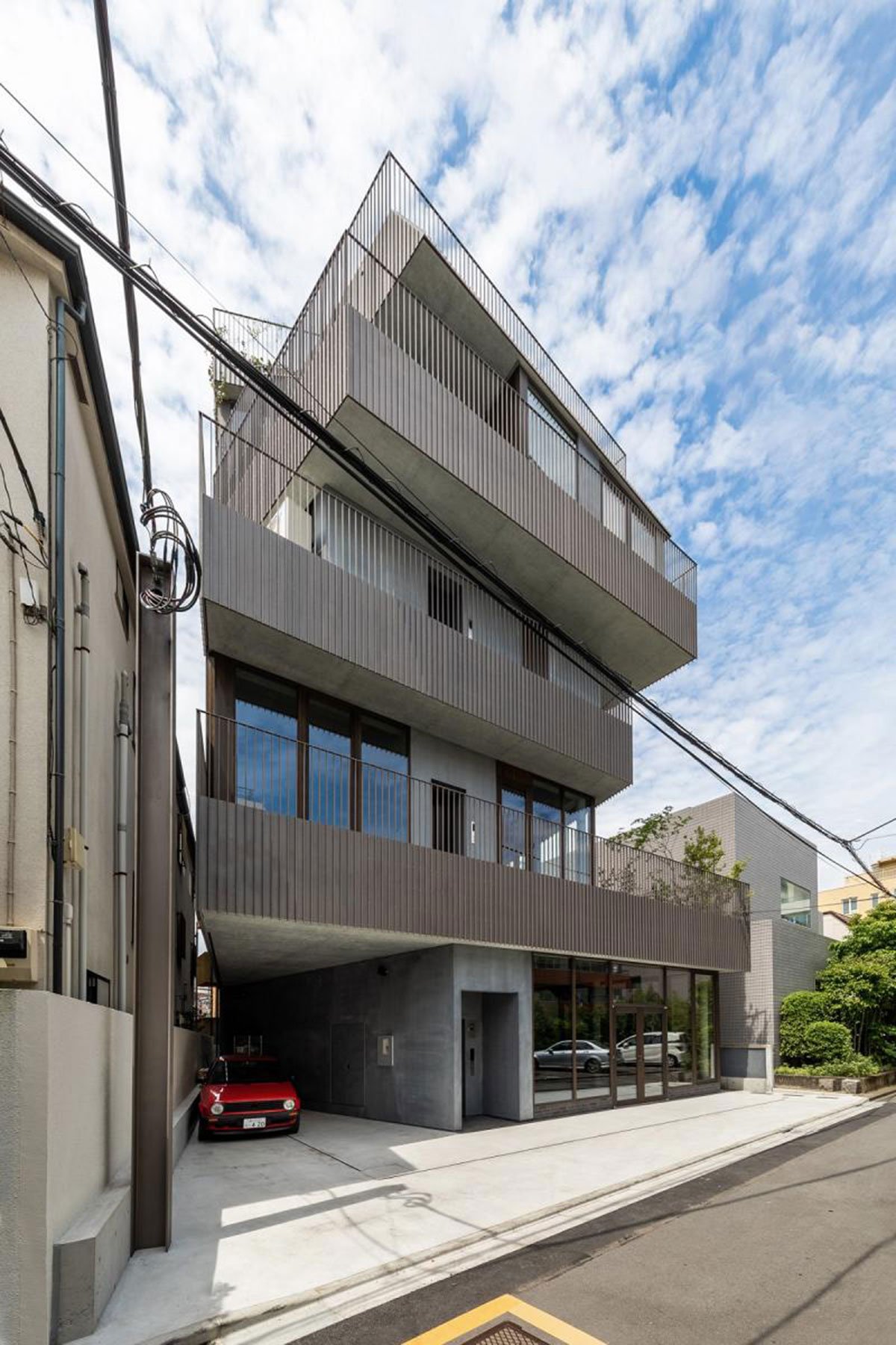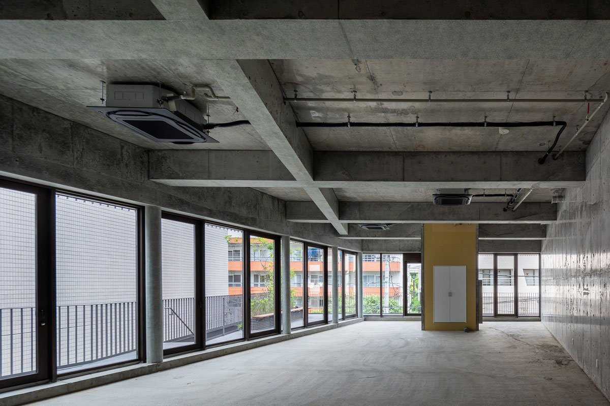 [Text as submitted by architect] Located in a mixed use area in Sendagaya, near the National Stadium in Tokyo, the project is composed of two floors of tenant spaces and the client’s two-story residence above them. The main challenge of the project is how to accommodate comfortable residential environments and sufficiently profitable tenant spaces within the site constrains, which allowed only 160% of the maximum floor area ratio due to the narrow front street.