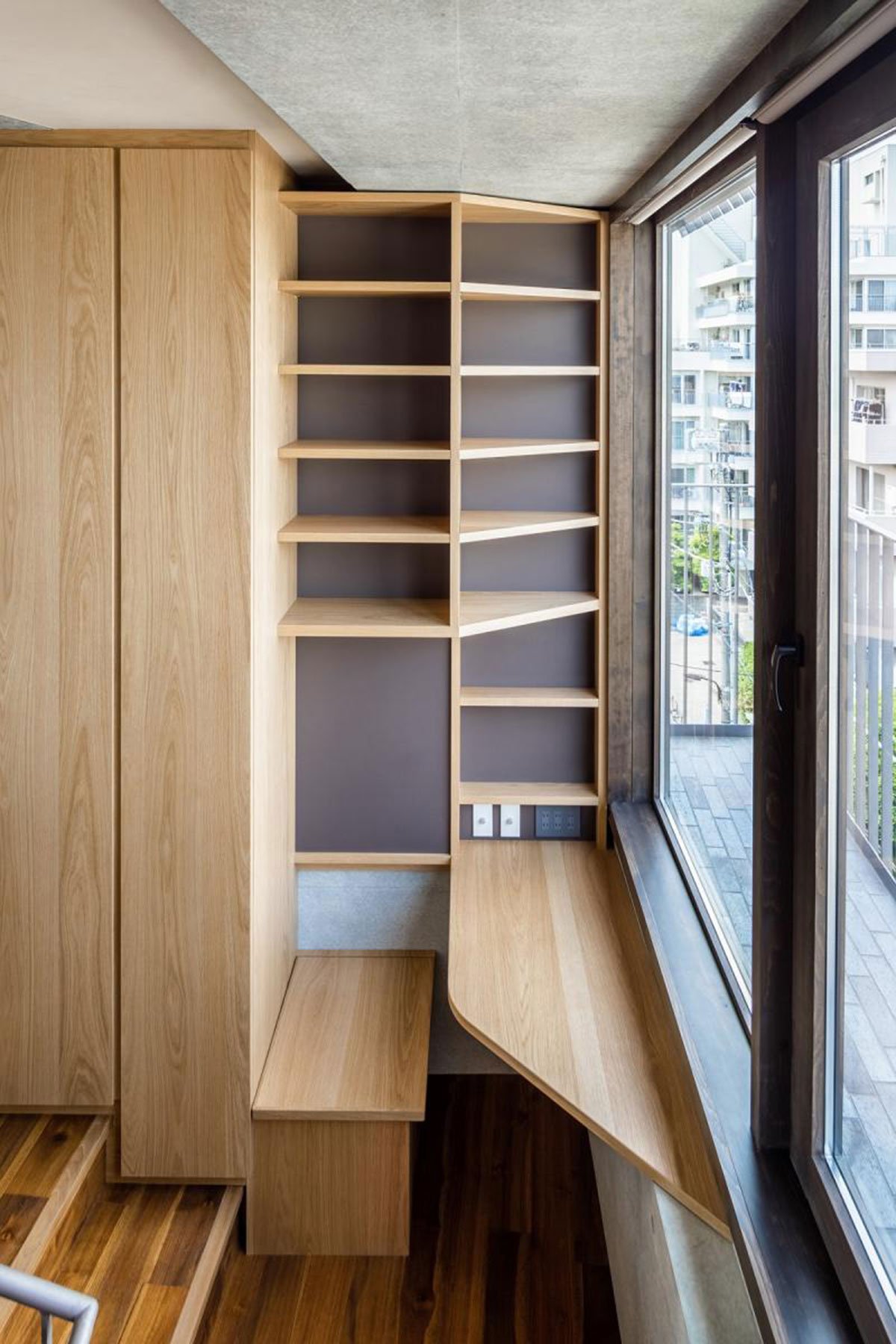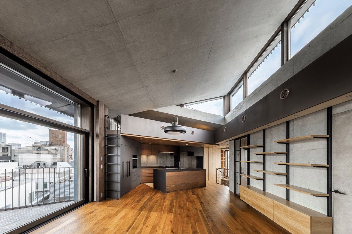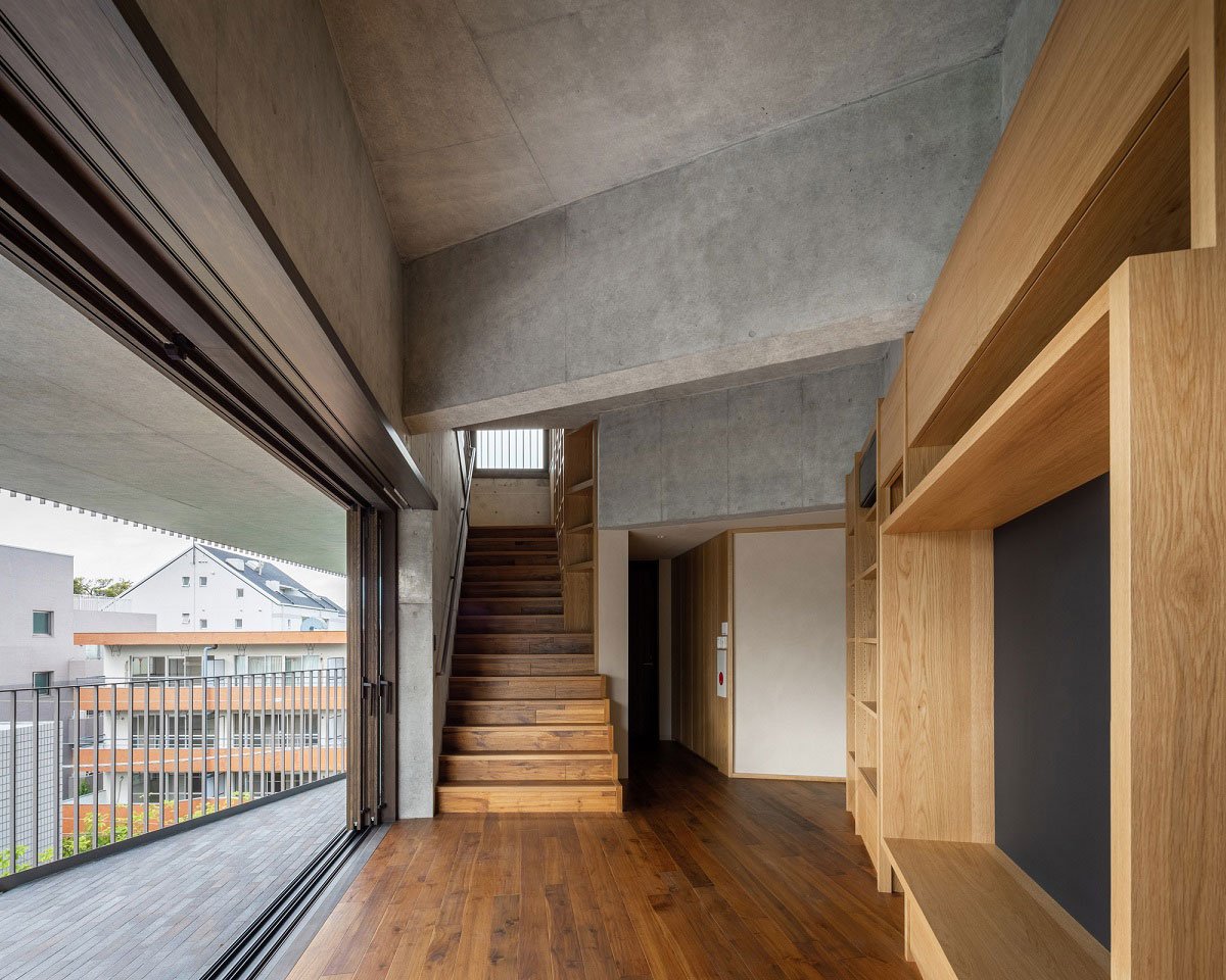 The top floor of the building, the entrance level of the duplex residence accommodates the tall and generous single room with clerestory windows for the living room and kitchen. On the floor below, the triangular hall surrounded by the bookshelves anchor four bedrooms and bathrooms. Through the fully openable sliding windows at each floor, both the living room and the hall can extend towards the planted terraces and become a part of the living spaces. While the generous stairway with the study corner connects the living room and the hall openly to create a continuous spatial strip, two terraces are also connected through the outdoor stairway surrounded by abundant vegetation. Beyond the clerestory window of the living room, a roof terrace spirals up to the wide slope covered by the artificial turf, resembling an exclusive playground almost floating over the sky. Openly connected generous spaces create a spatial continuum of inside and outside throughout the duplex and three levels of the terraces, which forms a sort of a ‘three-dimensional loop’ of the living spaces. Various casework and vegetation are distributed along the periphery of this living space loop, creating different characters of the places. Besides joyful kids running around, light, air, view, and all the flow of life and nature circulate seamlessly throughout inside and outside.