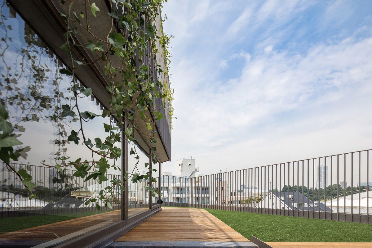 Each level’s floor plate is uniquely skewed according to the shadow regulation, usages, spatial sequences, and vertical relationships. This stacking generates shading overhangs and various outdoor spaces such as external hallways and green terraces without interrupting GFA limitations. Besides the closed building facade along the site boundary accommodating main loadbearing walls, the articulated deep concrete beams allow the façade structure along the terraces to be open and transparent encouraging inside and outside to merge. Large timber window walls recently certificated for fire resistance deliver open and bright interior spaces, unlike typical fireproof buildings required in most of the dense urban areas including this site. The void space around the building with distributed lush vegetations at each terrace forms a cascade of sequential vertical gardens like a canyon stretching from the bottom courtyard towards the sky.