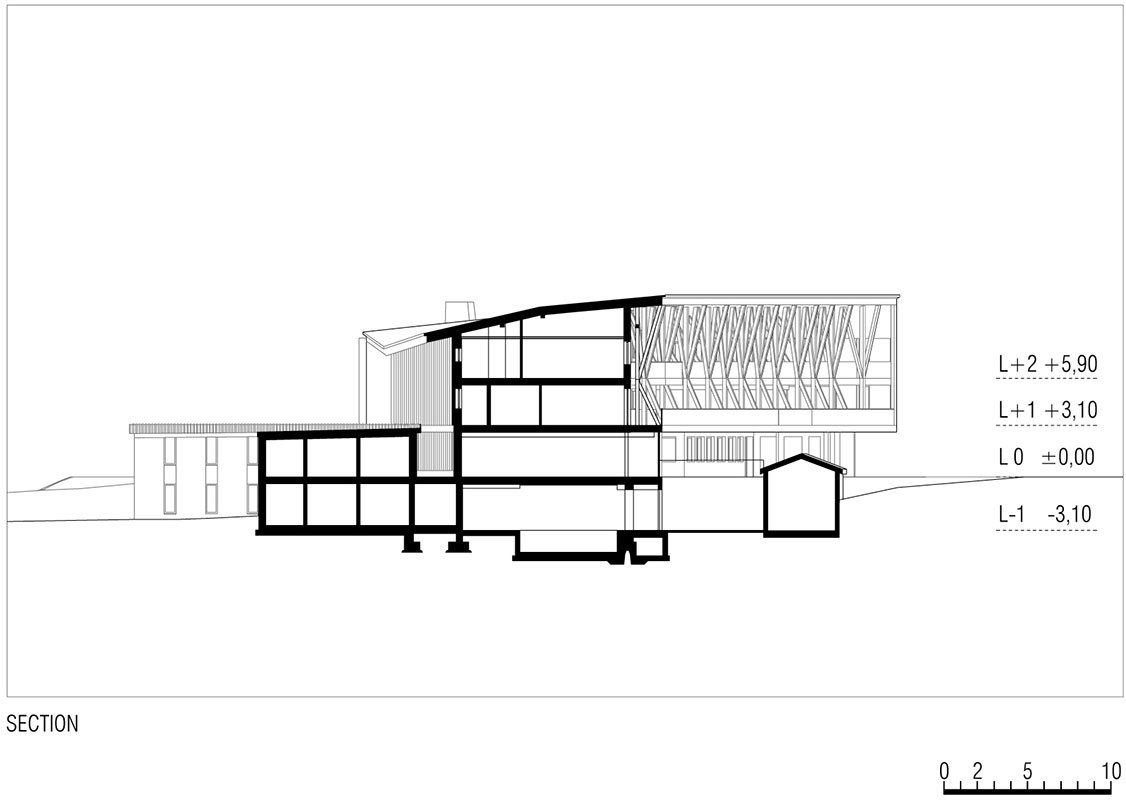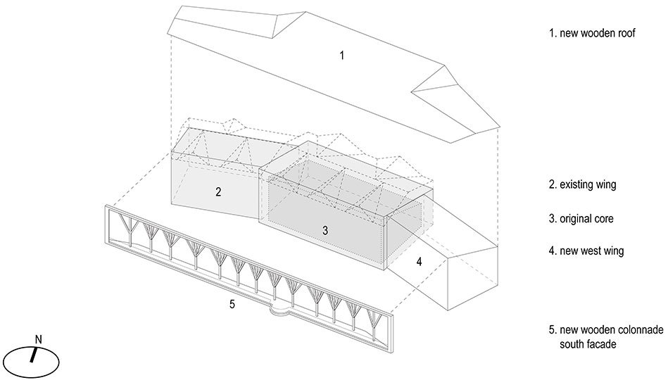 In plan, the new addition mirrors the existing west wing along the axis of the original lodge to forge a symmetry of parts to the whole relationship. On the outside, the thickened saw-toothed larch-wood skin, together with the large pitched wooden roof and the timber columns, constitute an ordering system that subsumes the myriad of past modifications into a cohesive architectural body.