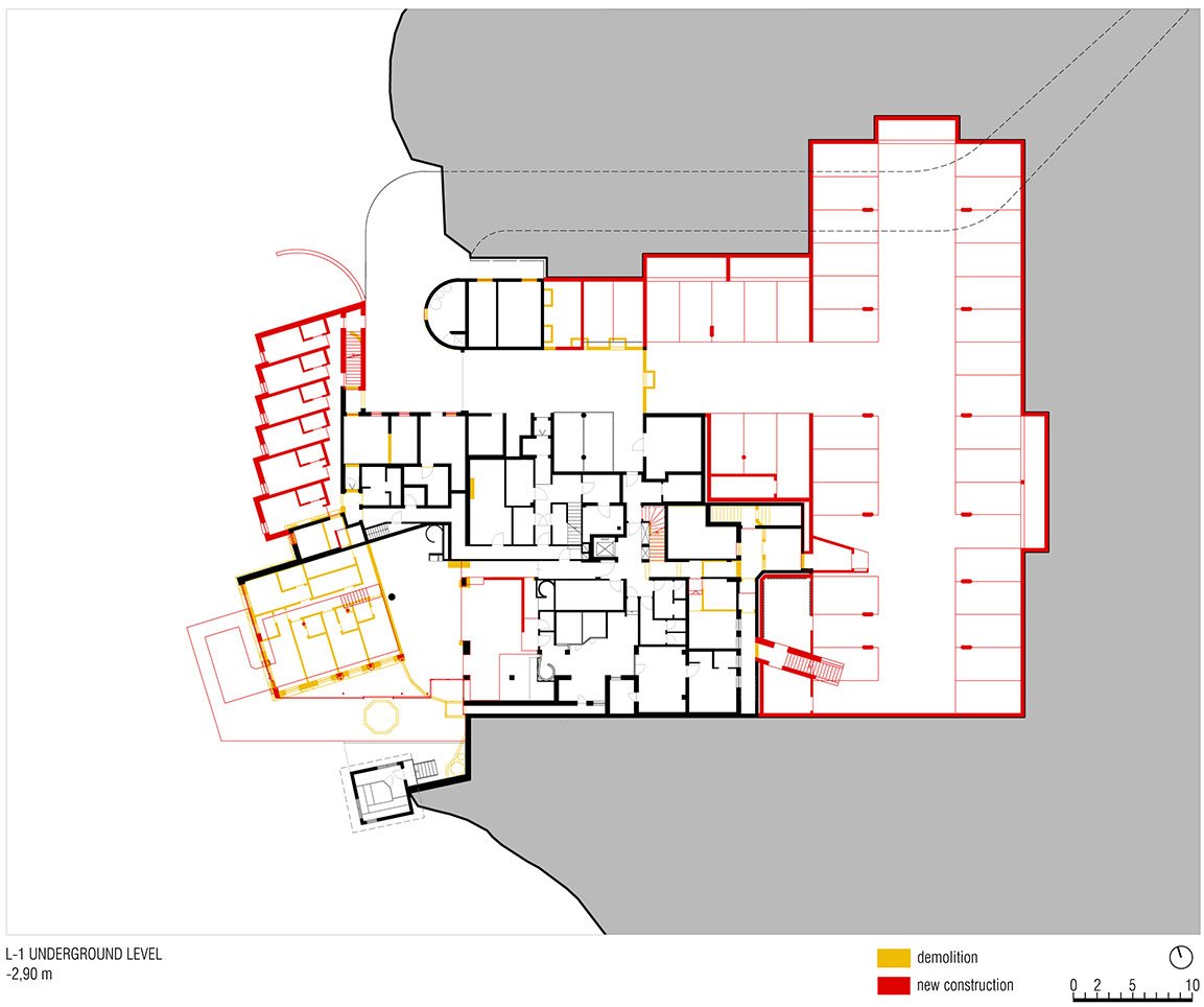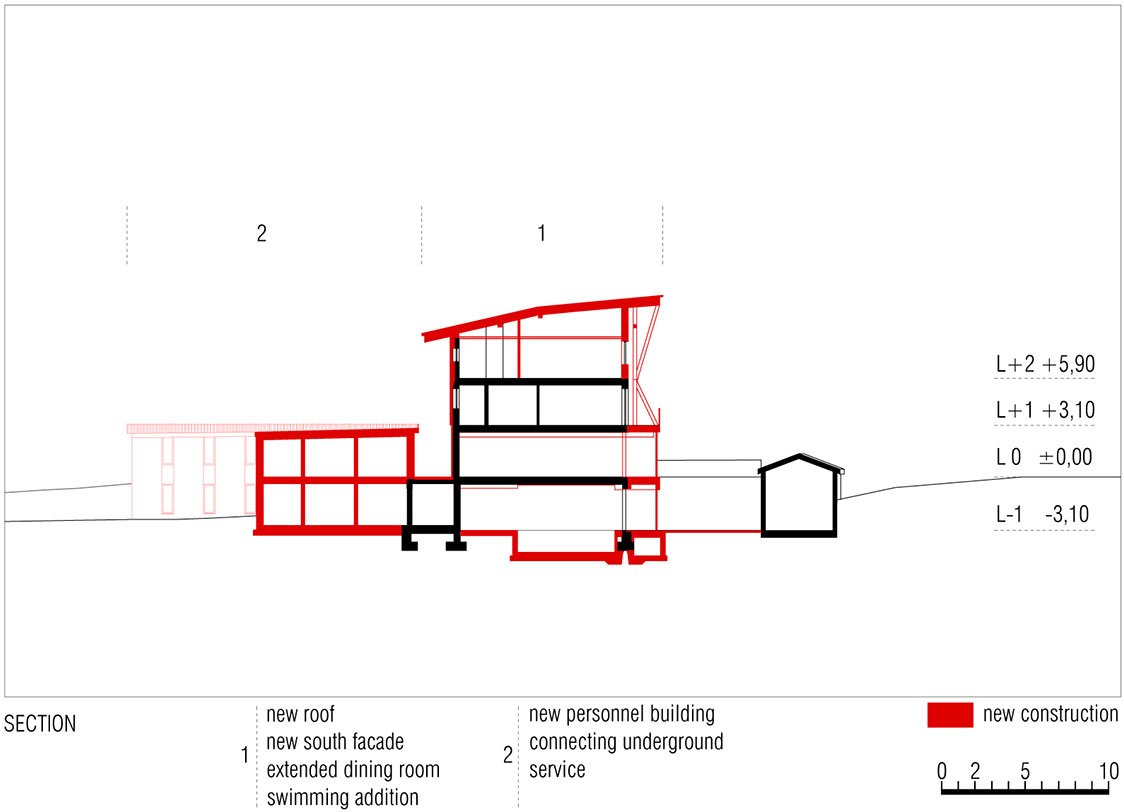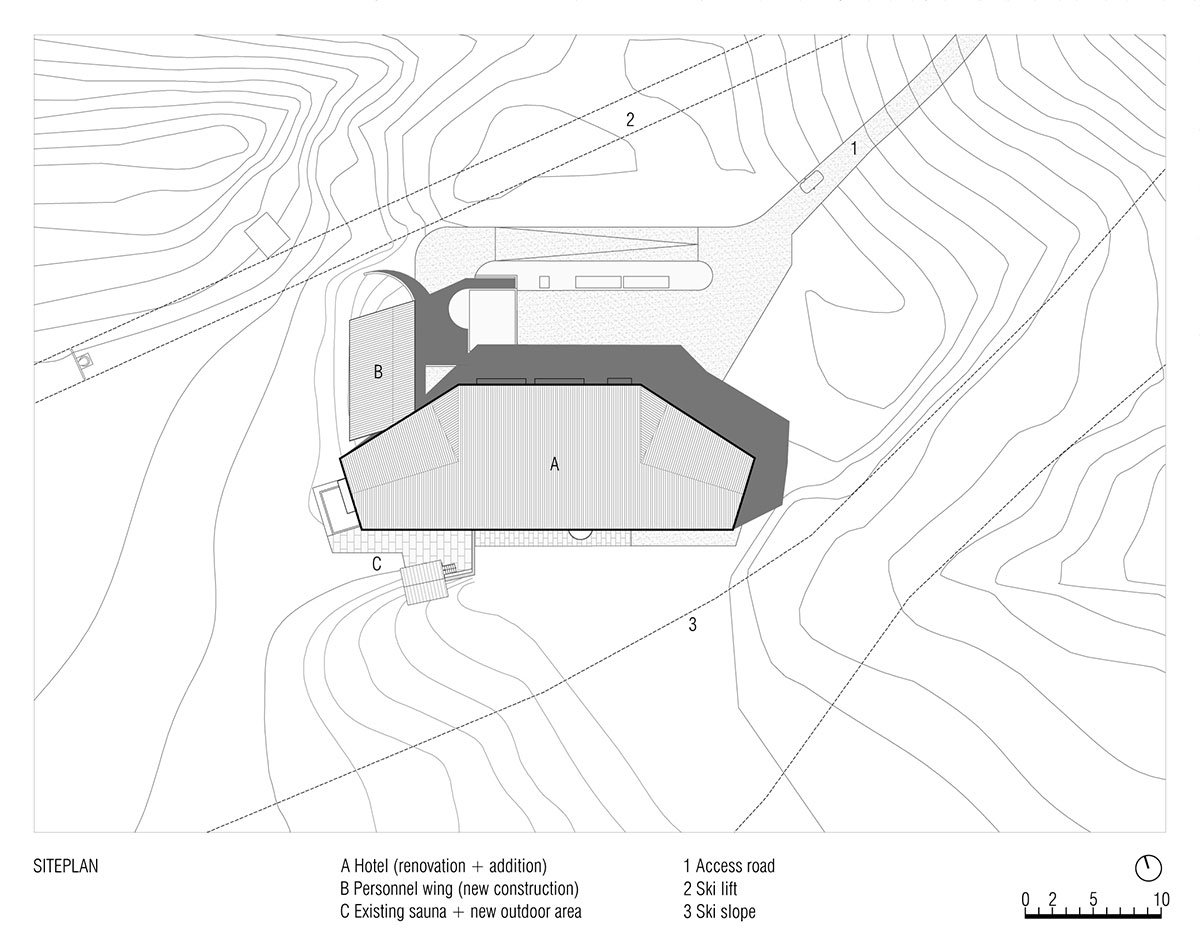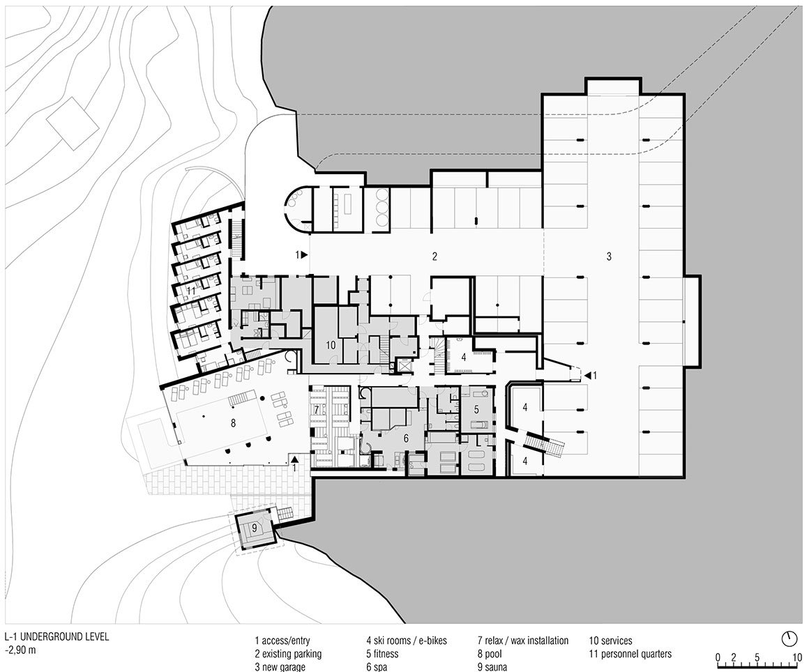 The new garage makes for a car-free arrival area for the hotel and mitigates the hotel’s visual impact on the landscape. Lastly, at this basement level, MoDusArchitects has drawn up a whole new 2-story volume for the staff accommodations that take on the tones of the main house, in continuity with the grey plastered facade of the original ground floor elevation.