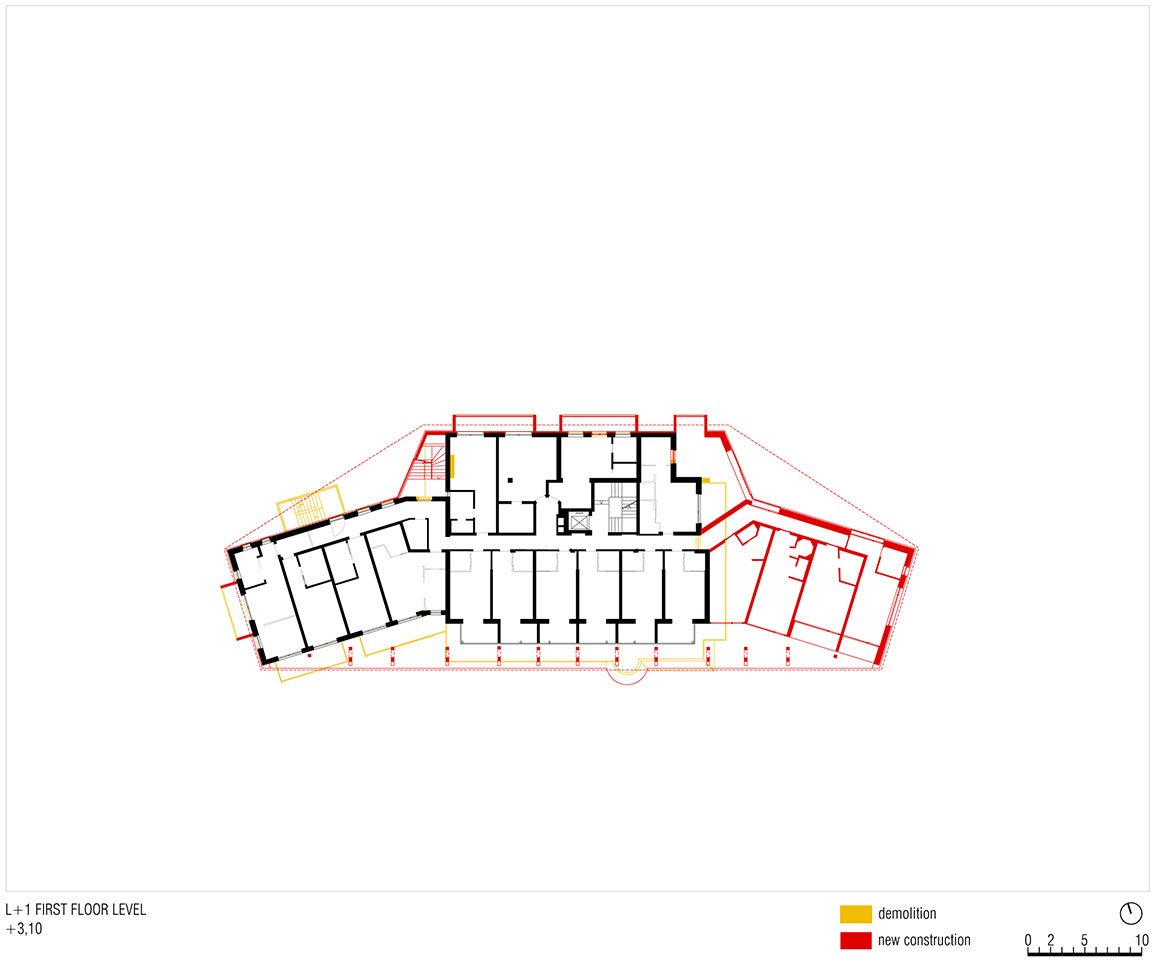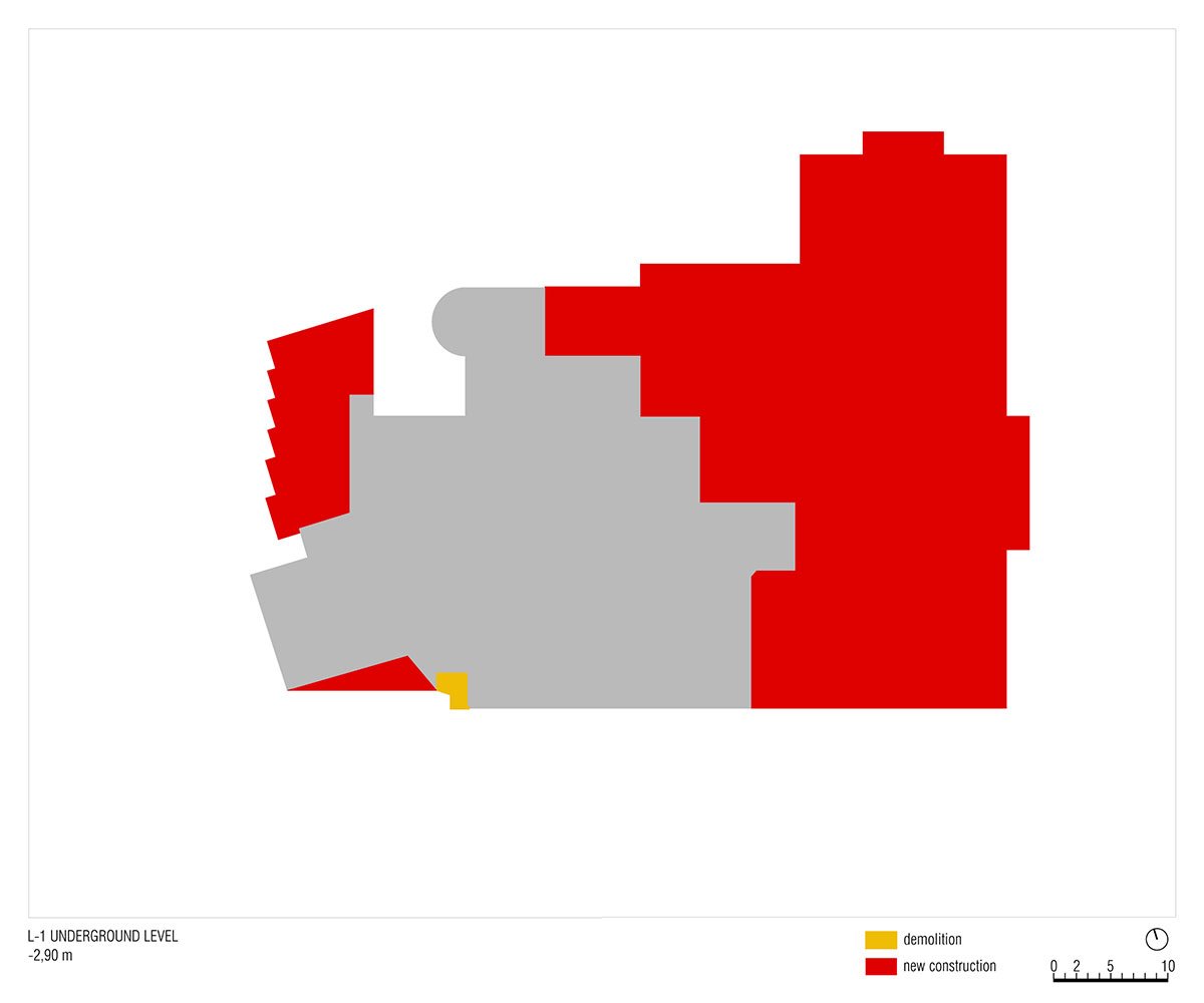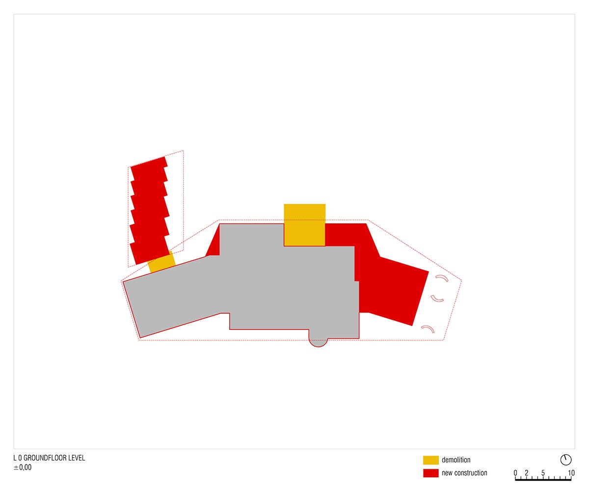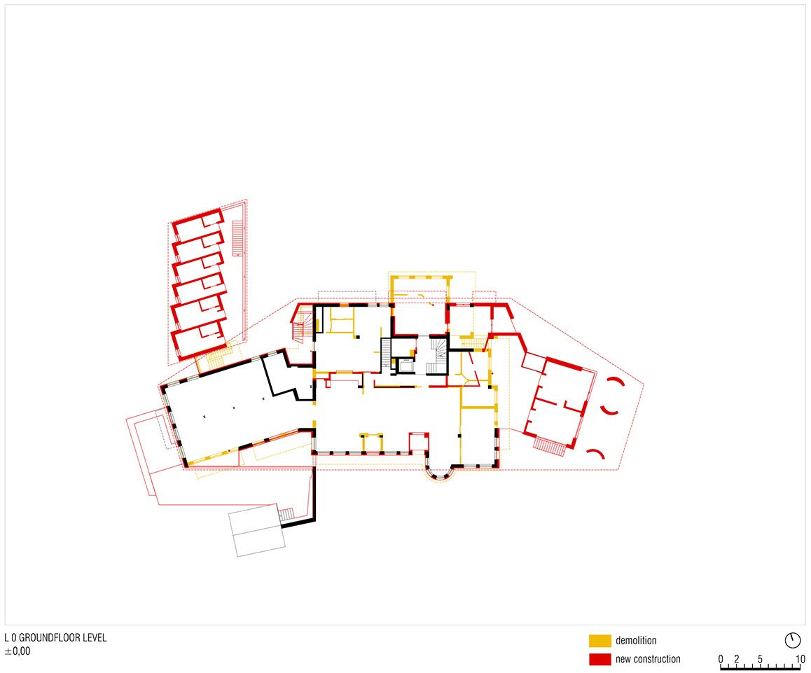 The new garage makes for a car-free arrival area for the hotel and mitigates the hotel’s visual impact on the landscape. Lastly, at this basement level, MoDusArchitects has drawn up a whole new 2-story volume for the staff accommodations that take on the tones of the main house, in continuity with the grey plastered facade of the original ground floor elevation.