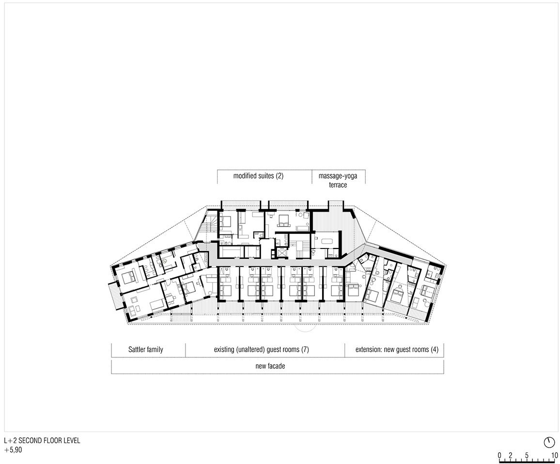 At the ground level, down the length of the building, a clearly defined throughway unravels a succession of common areas: entry, reception, shop, lounge, bar and dining hall all participate in the colourful exchange between guests, visitors, and outdoor enthusiasts and the Sattler family. The eclectic convergence of materials, textures and fixed furniture elements string the programs together and rescripts the collective memory of traditional alpine interior spaces.