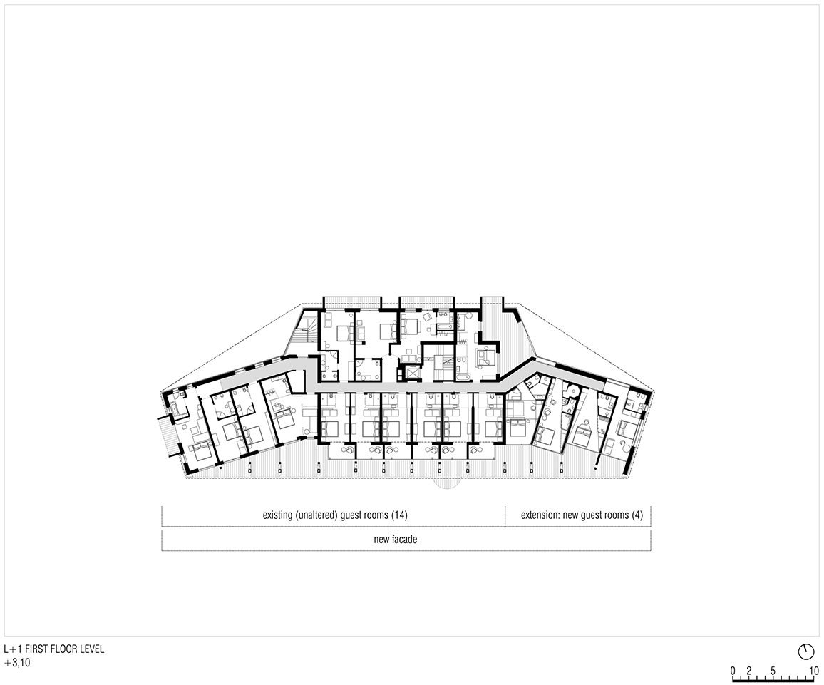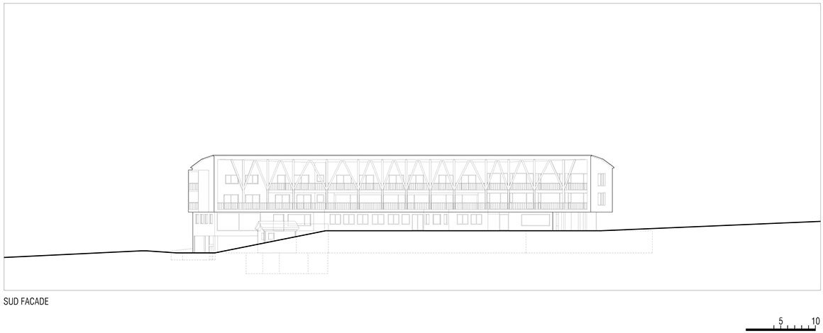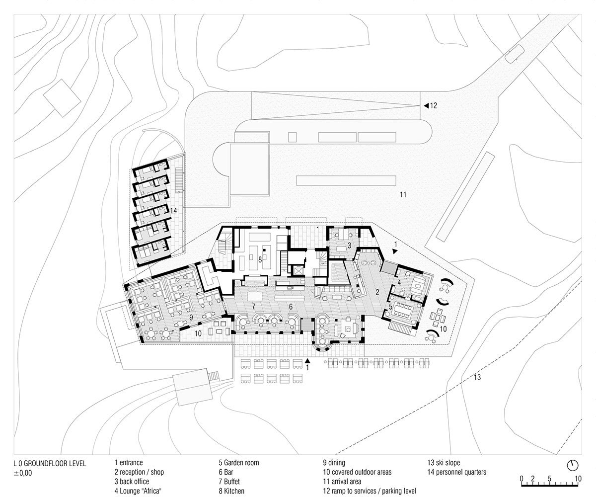 The 13 branching wood columns 7.5 meters high that march down the 55m length of the south-facing facade and span over the two upper floors are structural elements that tie the roof into place and serve as a middle-ground frame through which guests measure themselves up against the architecture and the landscape. The first-floor terrace draws a straight line across the two far corners of the building to define an airy, double-height loggia that extends the interior spaces of the guest rooms outwards.