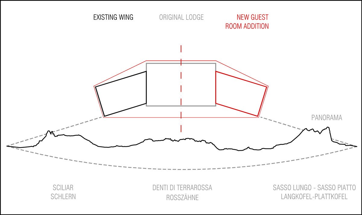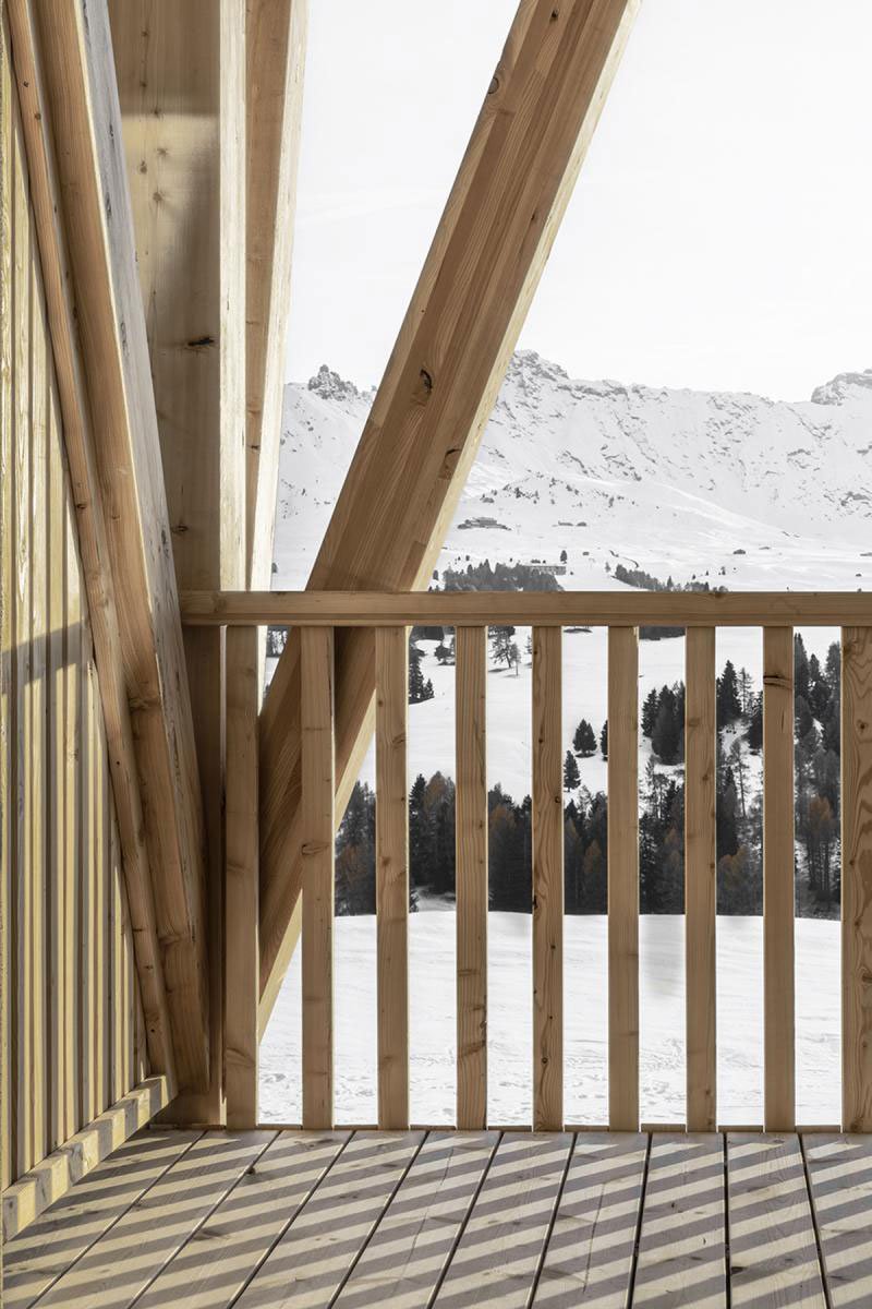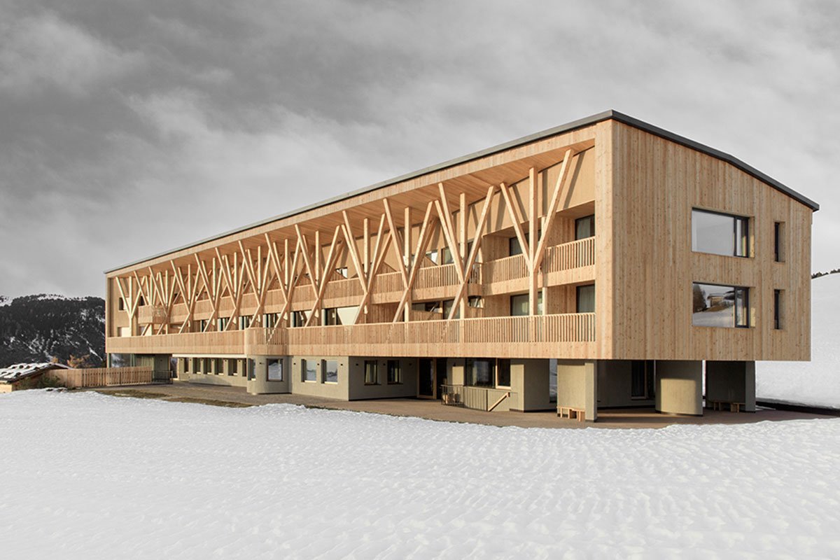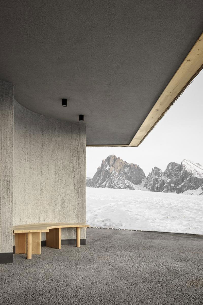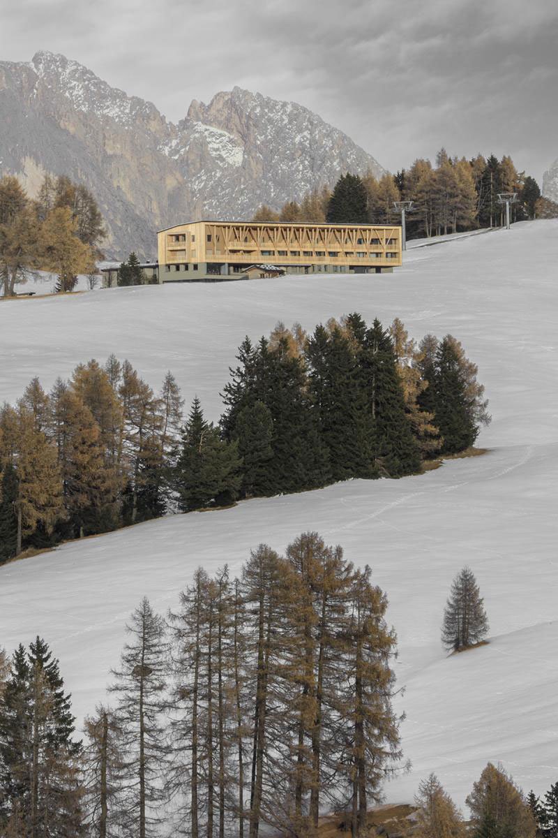 Positioned on the Alpe di Siusi (Seiser Alm) plateau at 1900m above sea level and set within South Tyrol’s Dolomites UNESCO World Heritage site, the hotel’s humble origins date back to a simple 1930s mountain lodge. The various interventions include an underground parking extension, the separate staff quarters, a guest room addition, the reorganization of all common spaces, including the pool area, and the sweeping, giant order colonnade of wood along the main façade that intercepts the breathtaking mountain views.