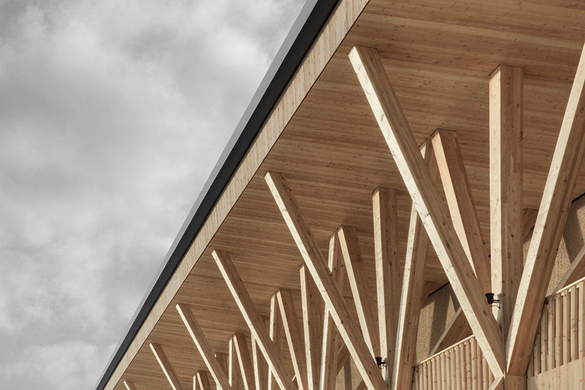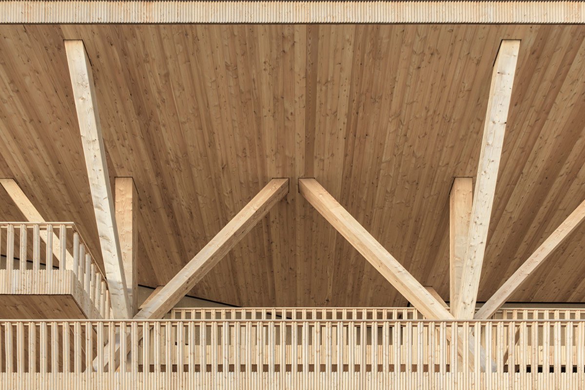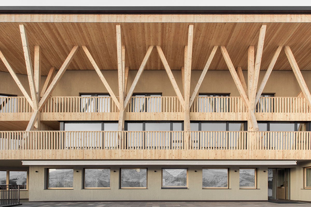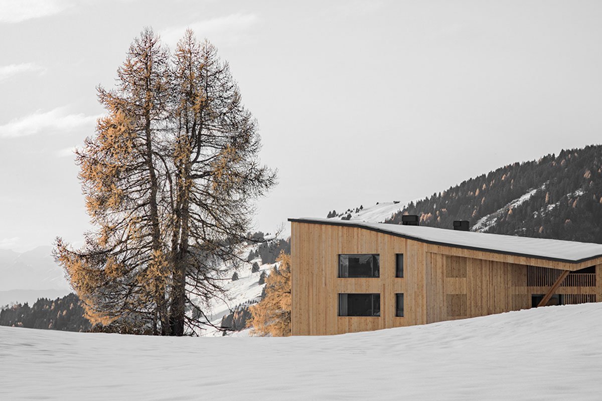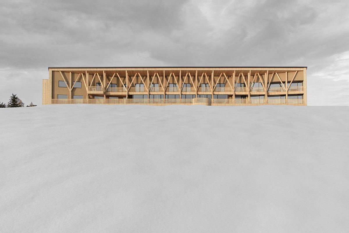 [Text as submitted by the architects] At the foothills of the Dolomite Mountains and nestled within a web of ski slopes and hiking trails, MoDusArchitects has revamped Icaro Hotel as a stereometric volume in wood that quietly adds a new fragment to the built heritage of hospitality architecture of this unique protected area.