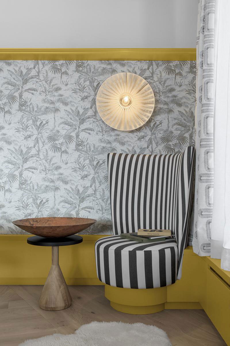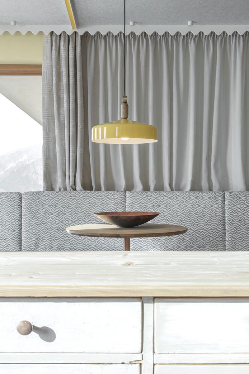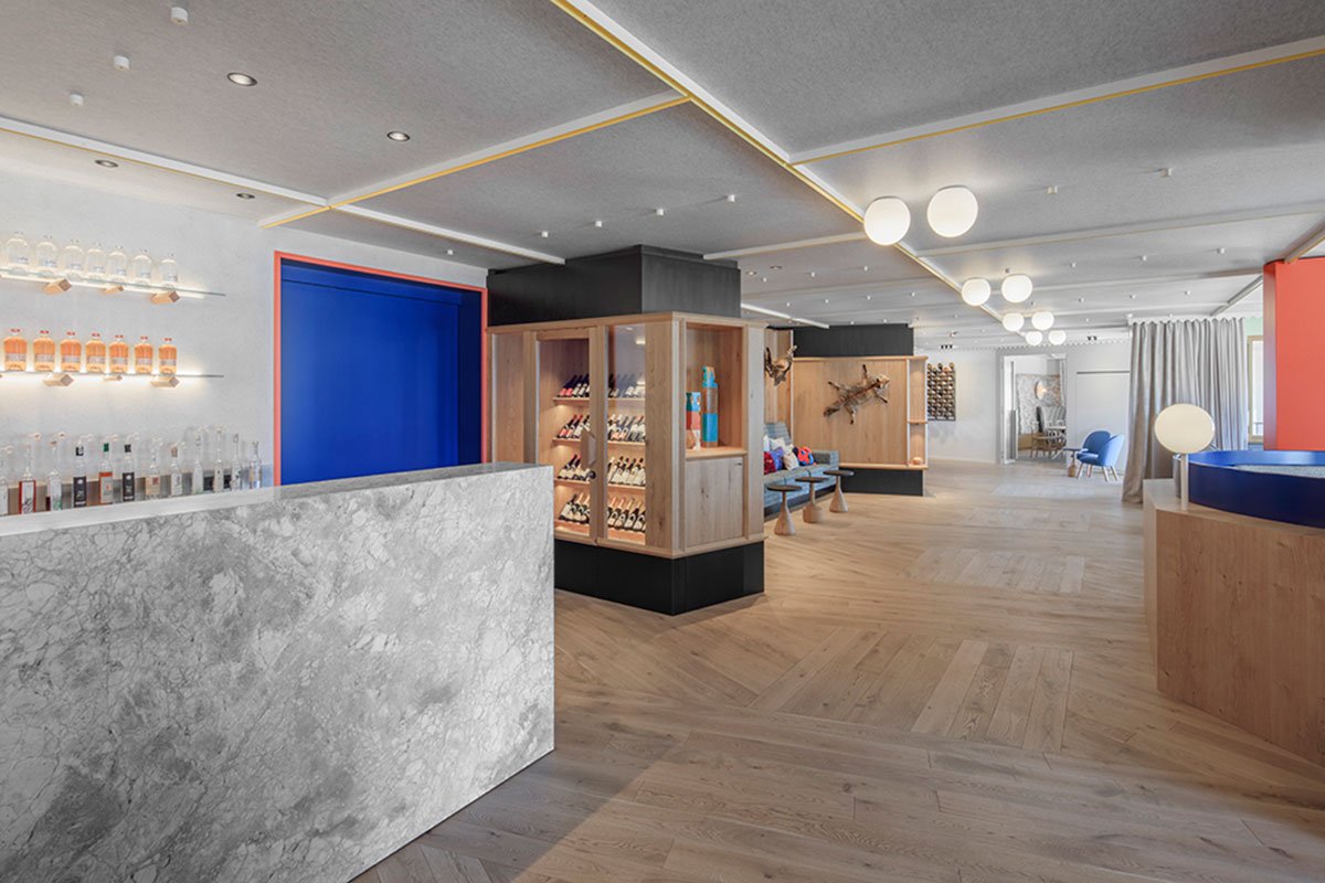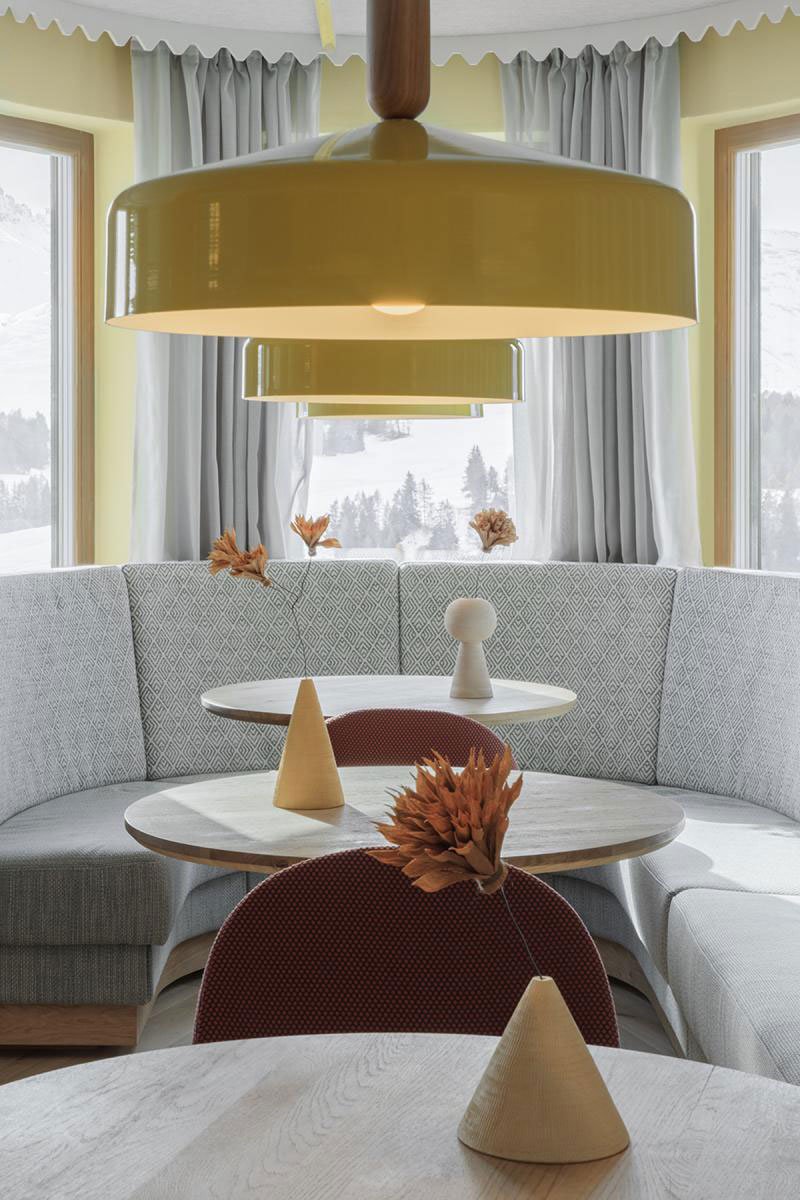 Similarly, the characteristic coffering of the alpine wood stube (the traditional, stove heated farmhouse living room) is revisited with an all-enveloping surface of acoustic-felt panels partitioned by a notched, intersecting yellow moulding profile. In tandem with the overhead panelling, the braided texture of the oak planked flooring weaves together the mirrored angles of the hotel’s footprint in a quiet tête-à-tête between old and new.