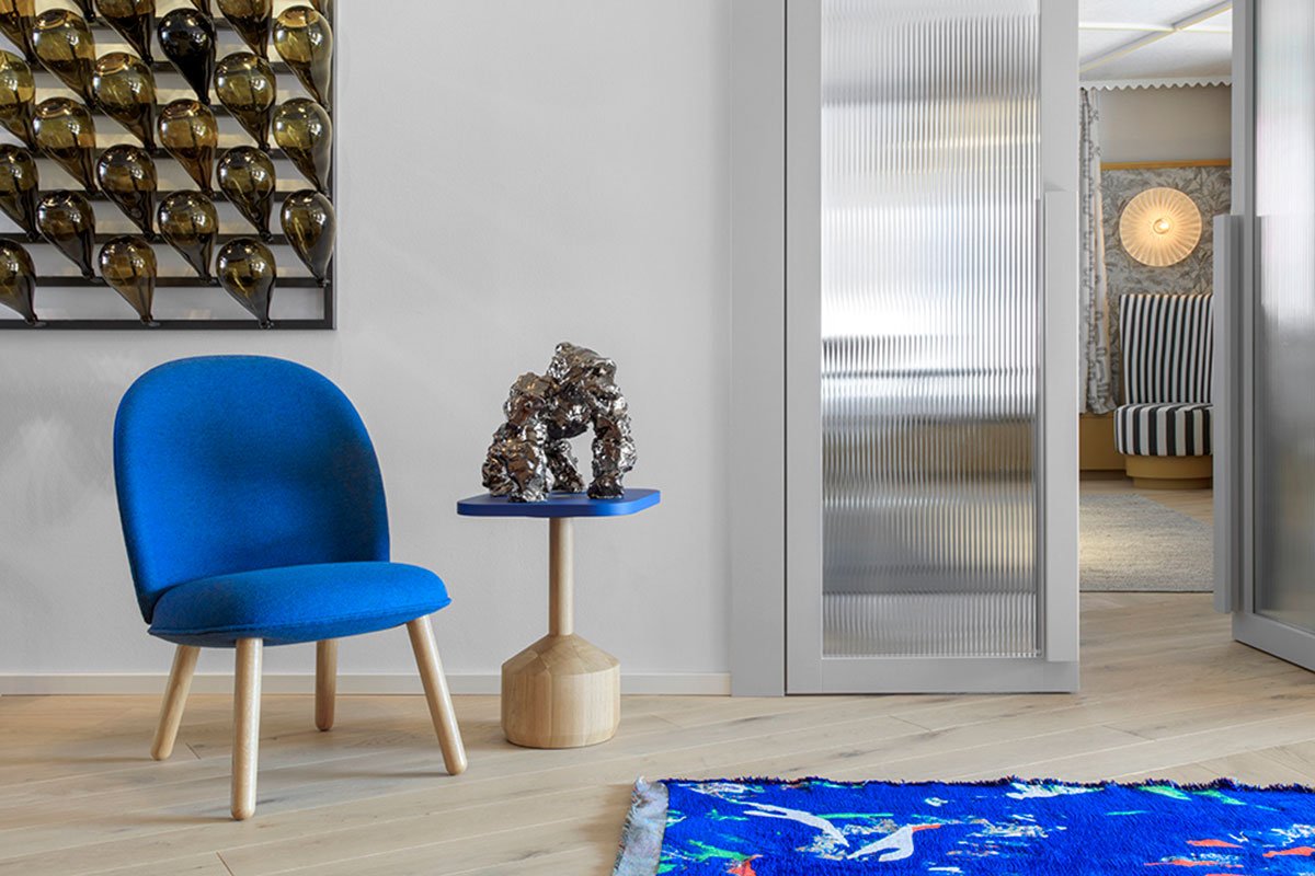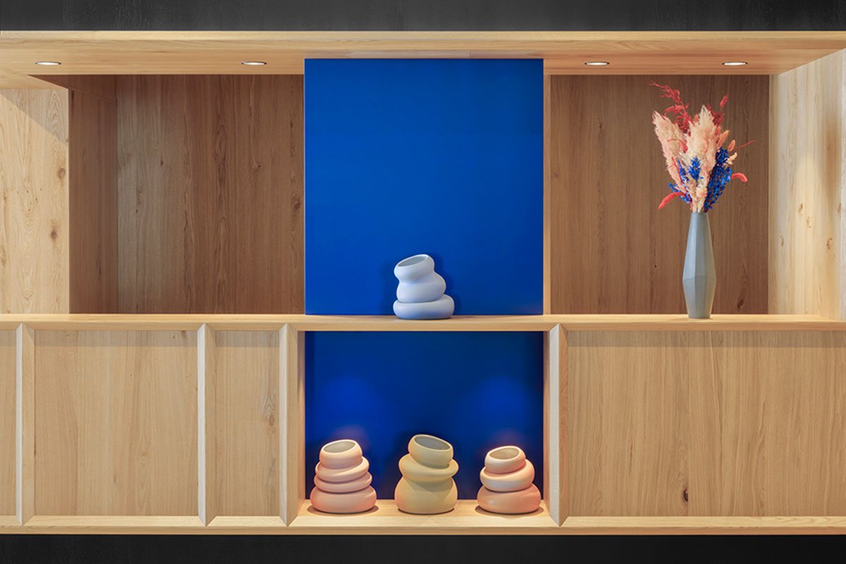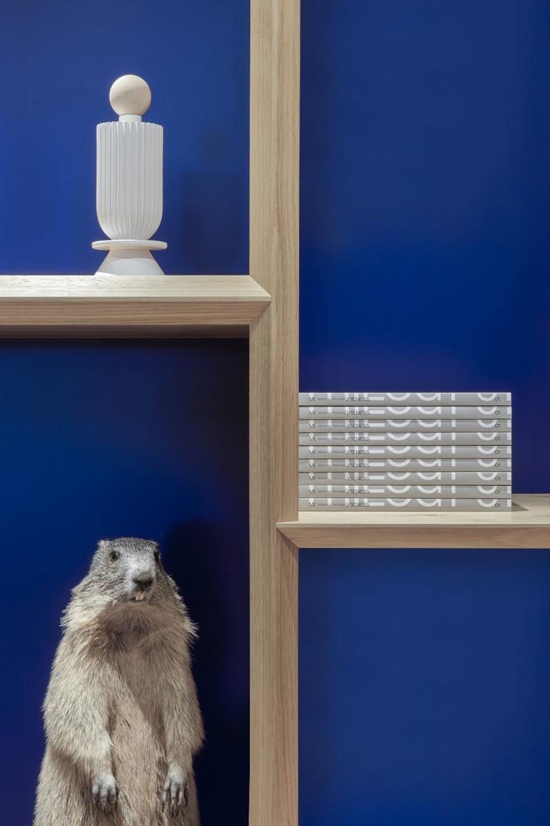 Embedded within the interiors of the hotel lie stories, family heirlooms, and a celebration of contemporary artistic endeavours and artisanal know-how. The reception, shop and lounge area are designed as a full-height, thickened wainscoting of oak panels and deep blue recesses that collect a disparate range of subjects, much like a cabinet of curiosities.